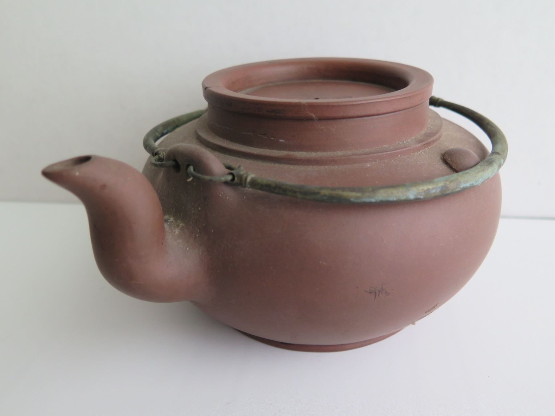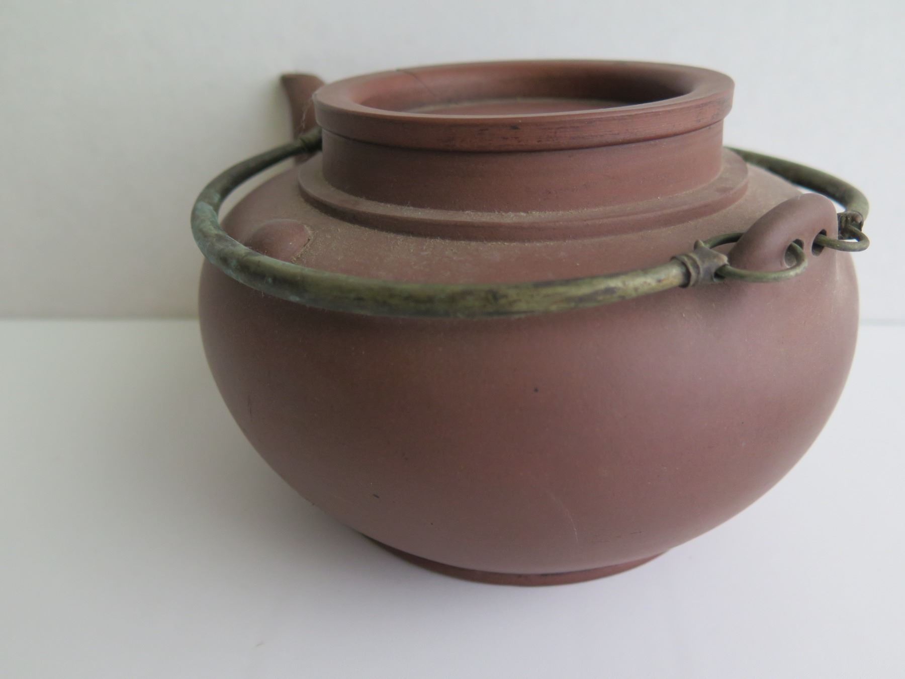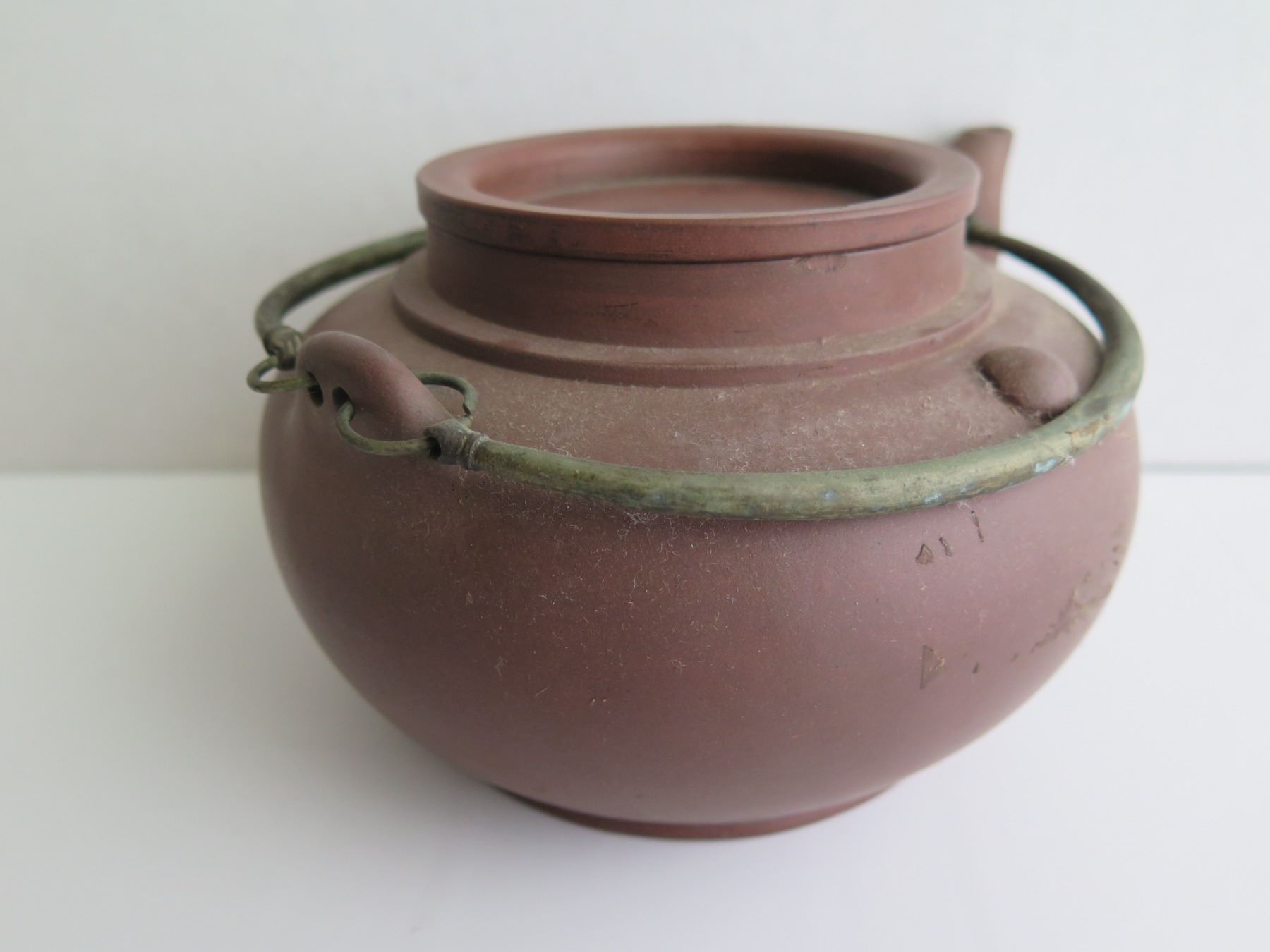 Chinese Yixing Clay Teapot w/ Metal Handle, Brown Maker's Mark 4" Tall