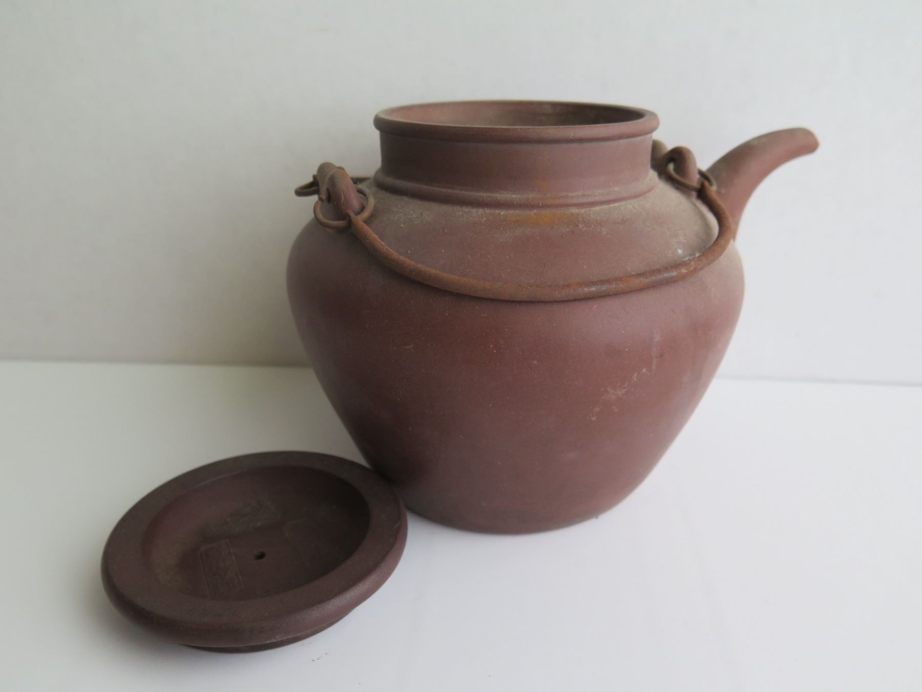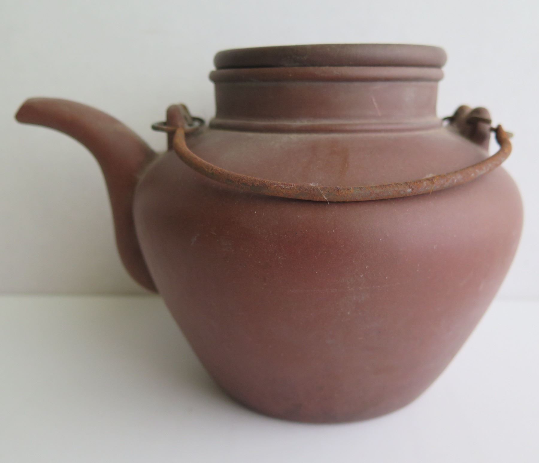 Chinese Yixing Clay Teapot w/ Metal Handle, Terracotta Maker's Mark 5.5" Tall