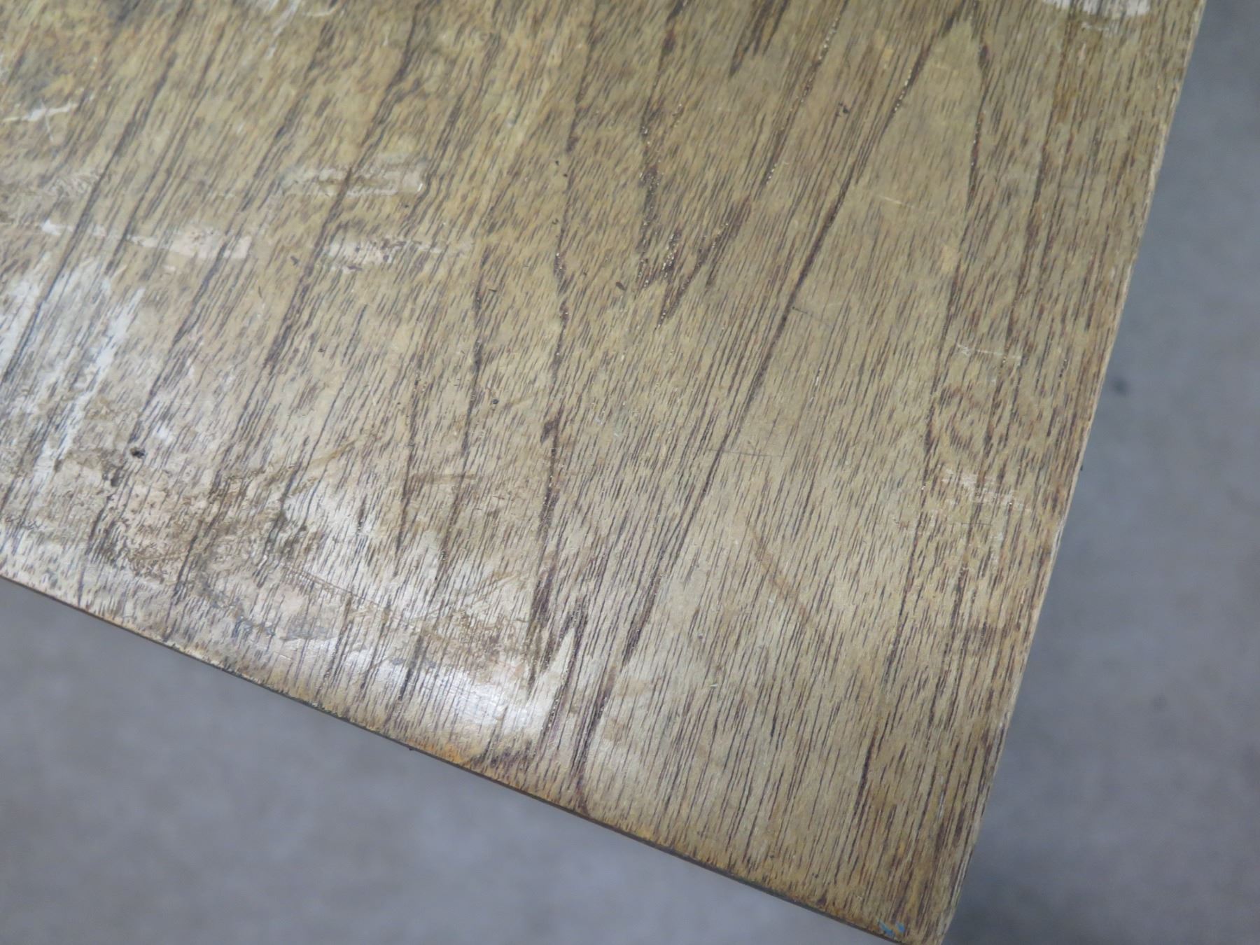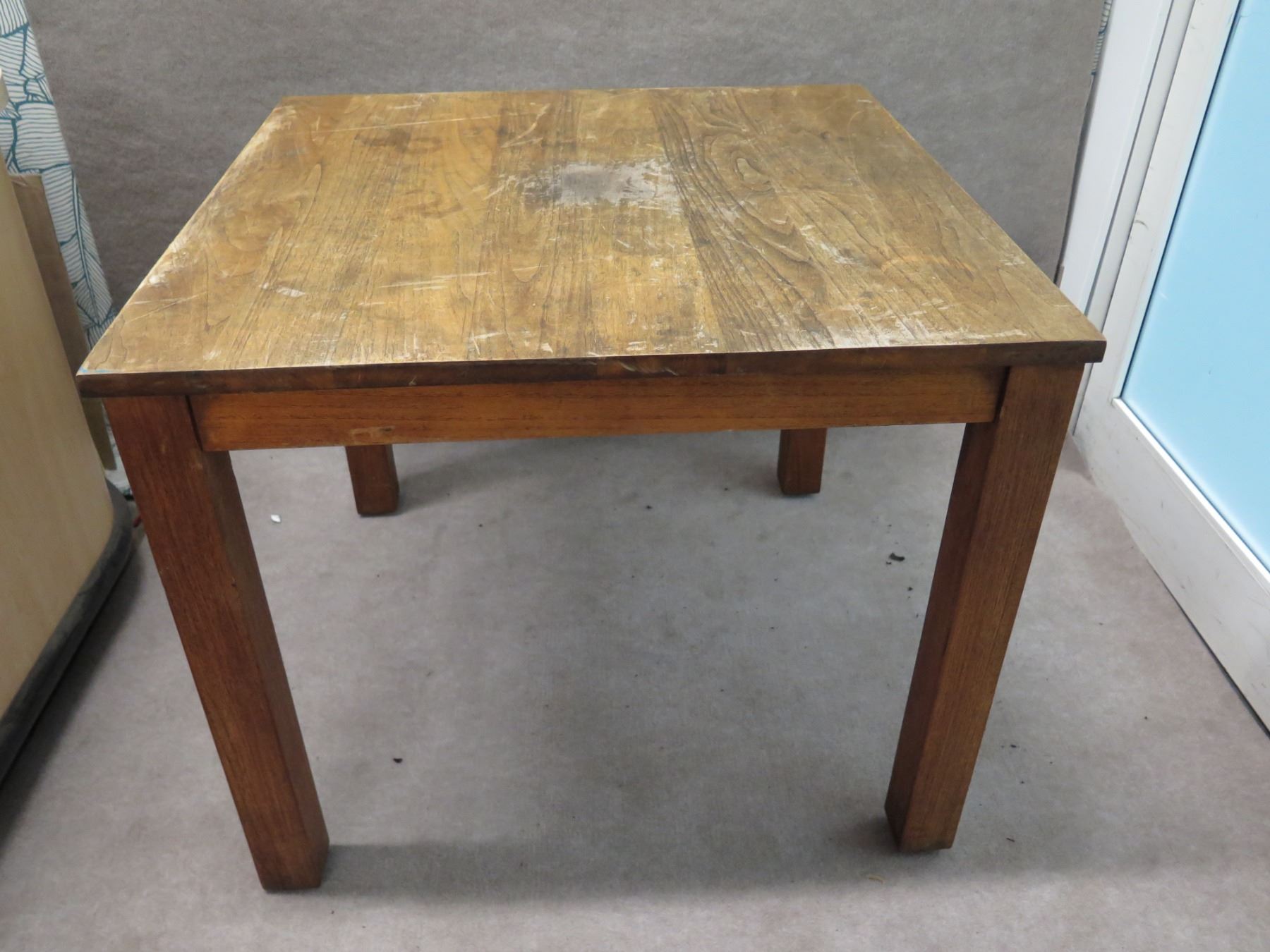 Composition Wooden Dining Table 36" x 36" x 30"H (surface has scratches, needs refinishing). This is a stock photo, representative of item. Condition may vary. Note: Wood is faded and may need refinishing