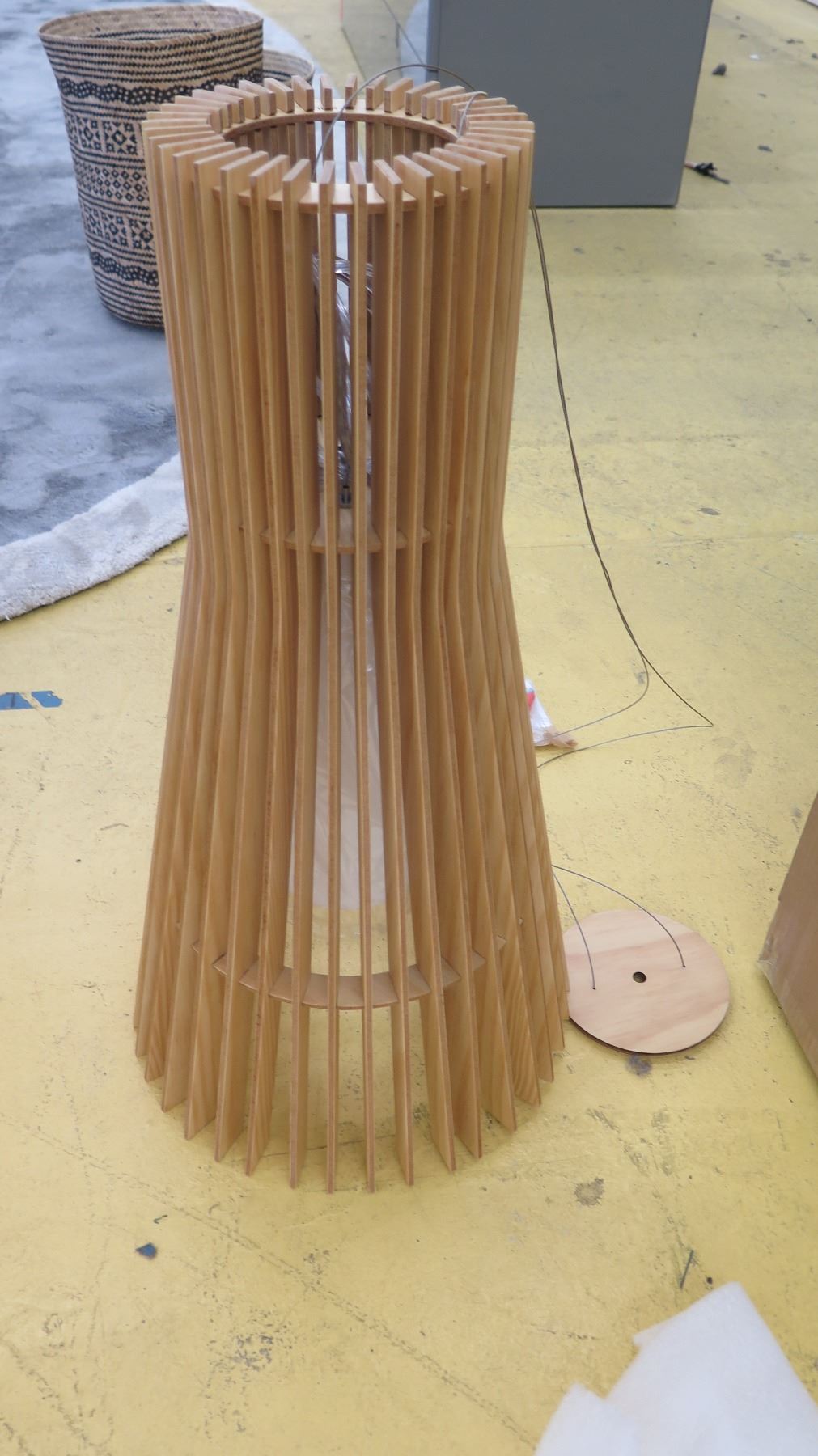 Contemporary Ceiling Pendant Lamp, Wooden Slats, 2ft Tall, Approx. 1 ft Dia.