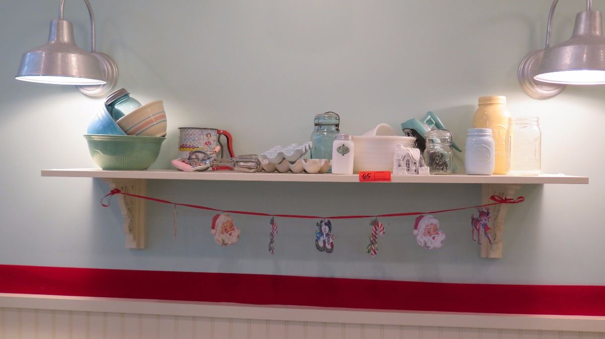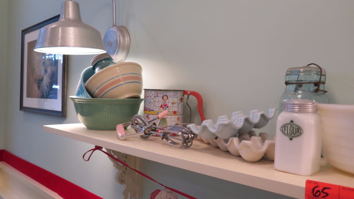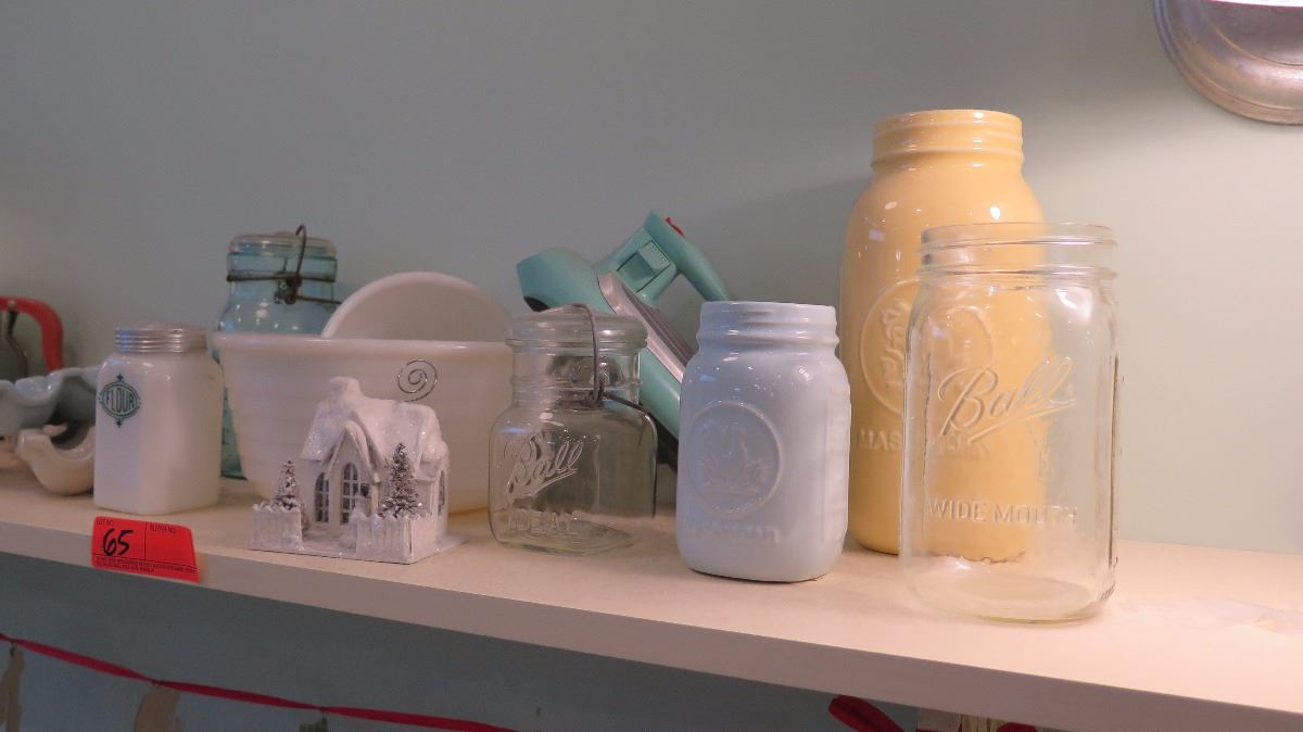 Contents of 3 Shelves - Misc. Porcelain Bowls, Mason Jars, Vintage Egg Beater,
