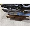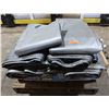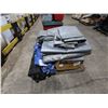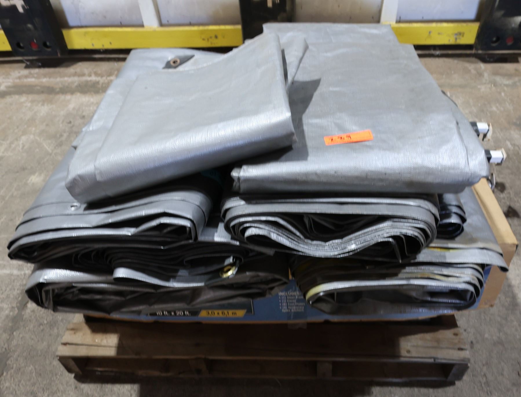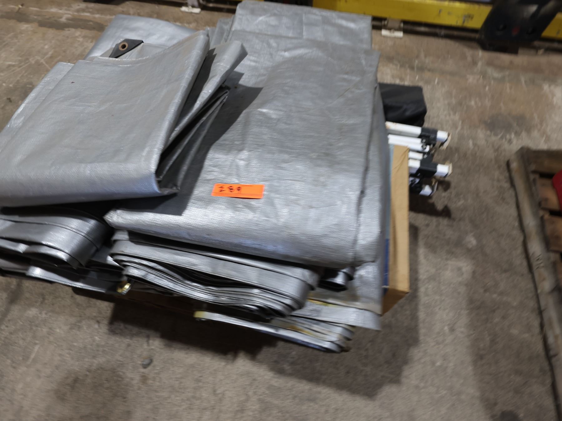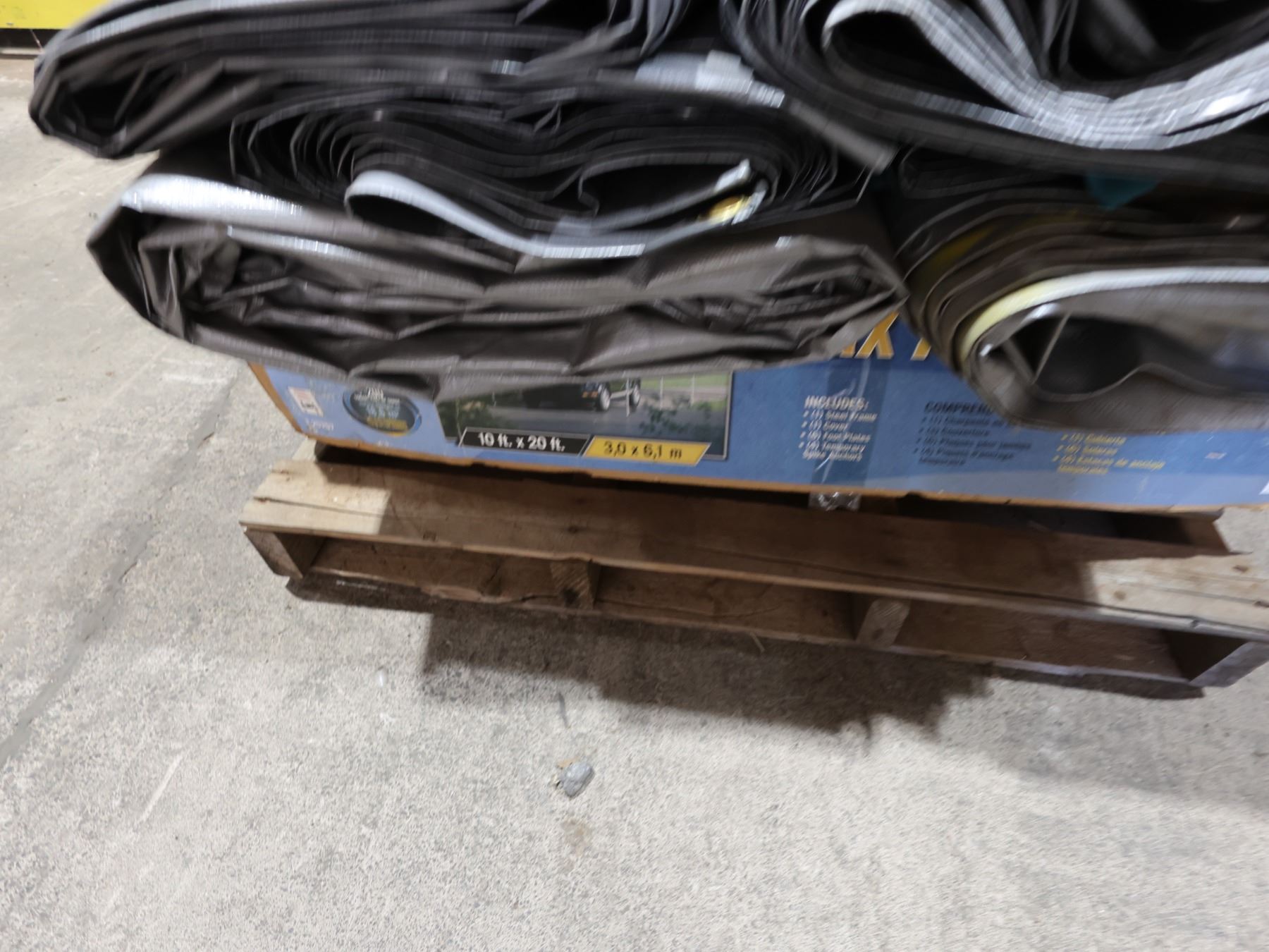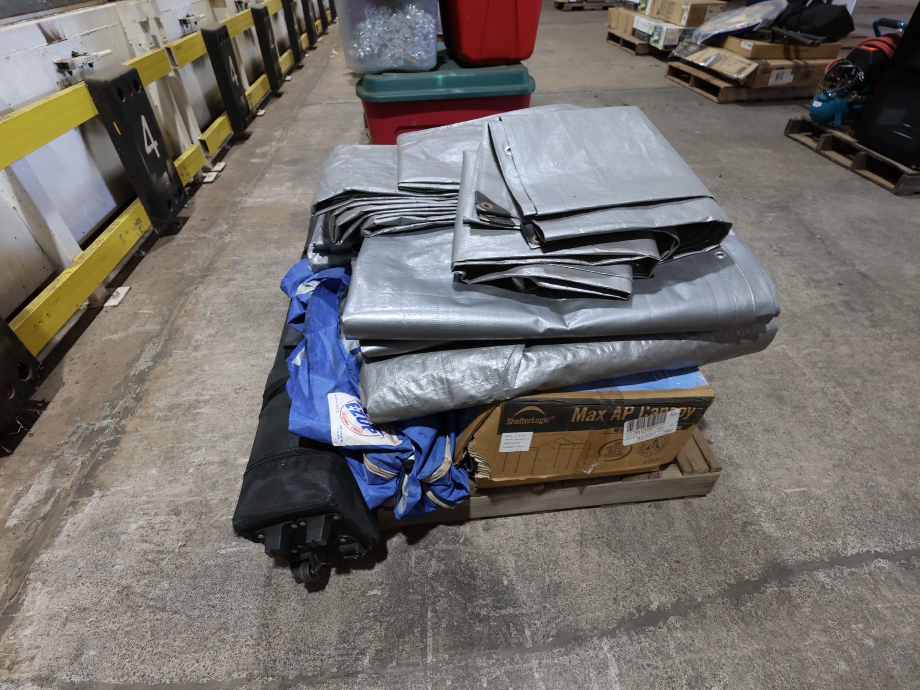Contents of Pallet: Multiple Gray Tarps, Tent in Black Case, ShelterLogic Tent Canopy, etc