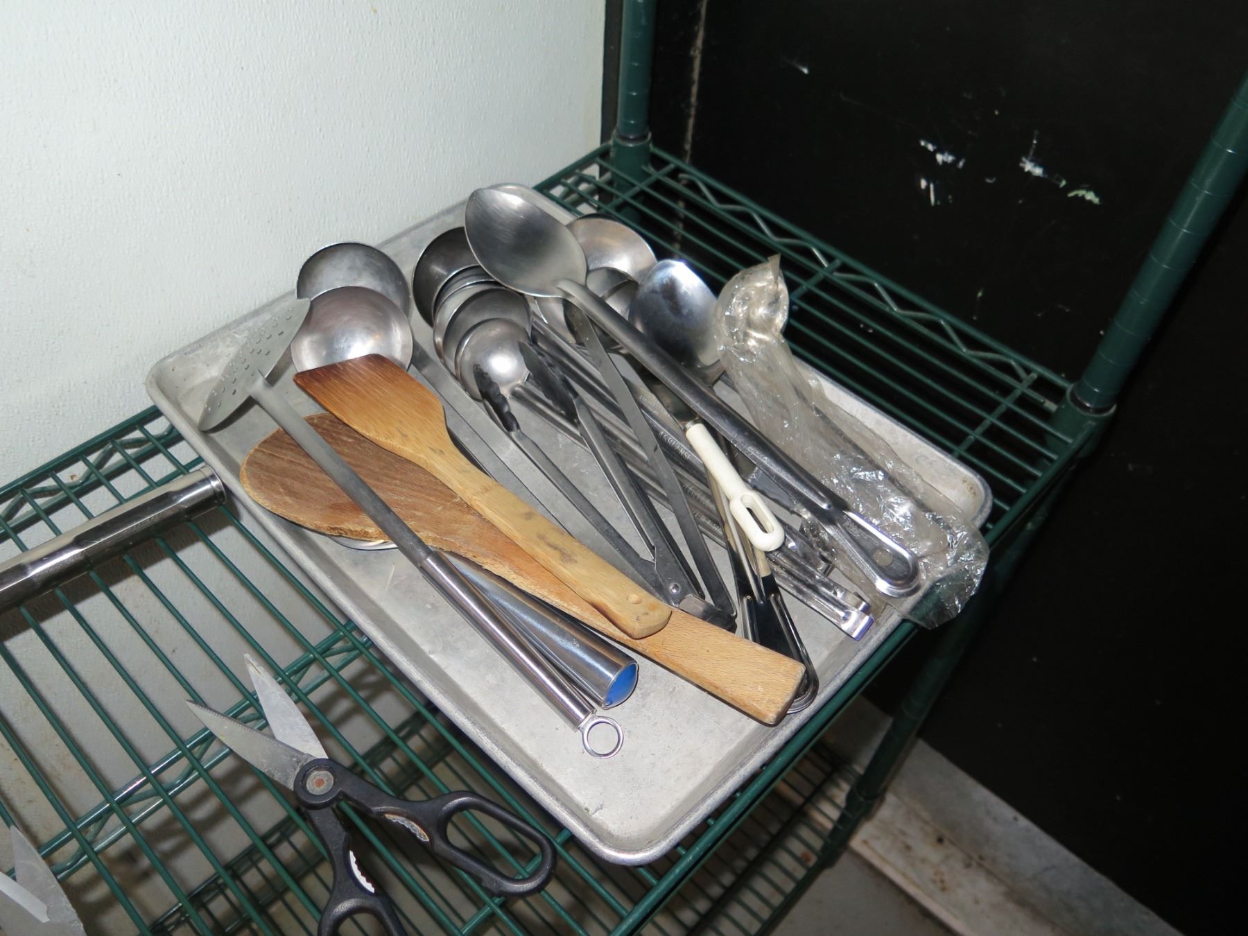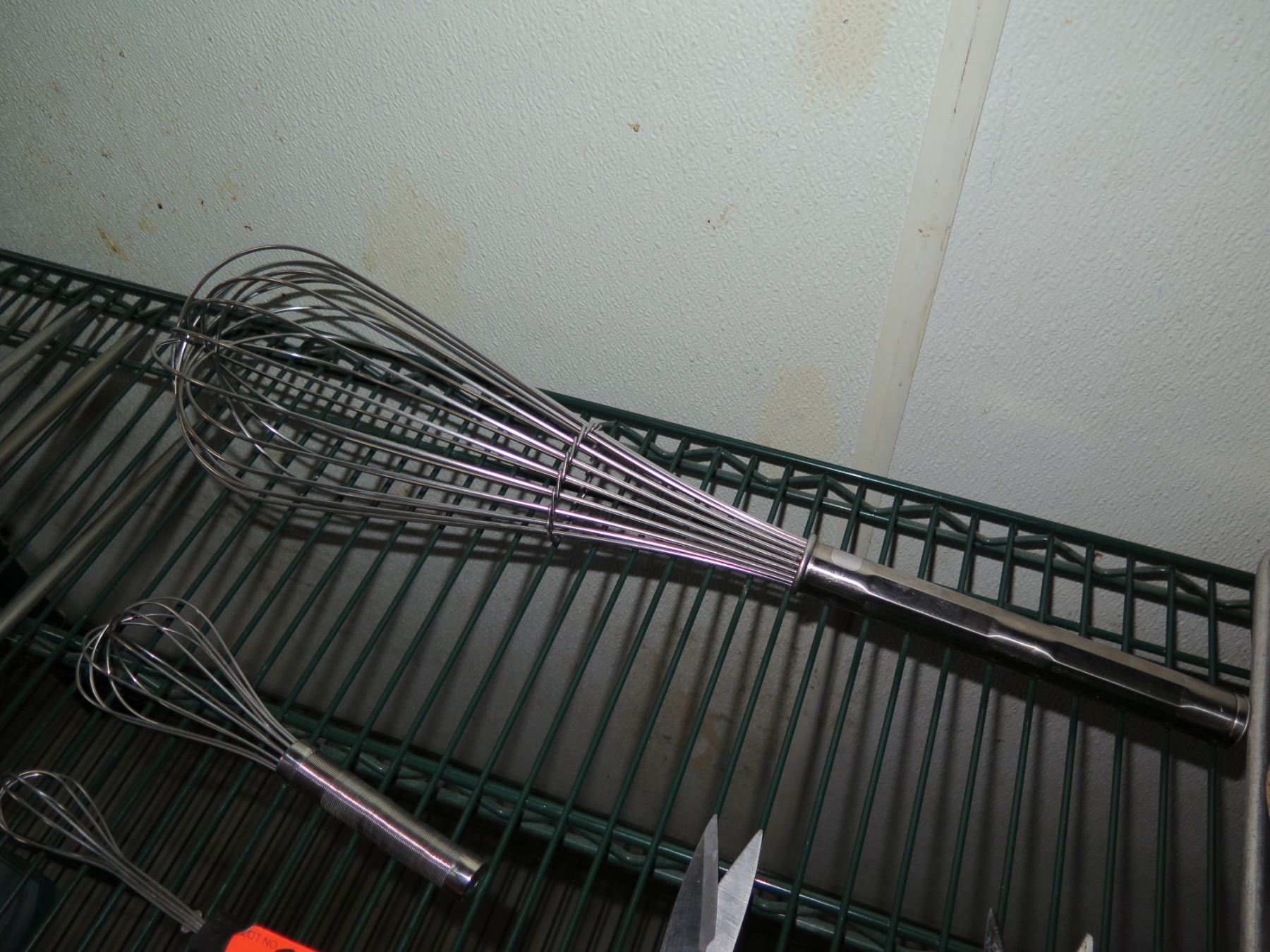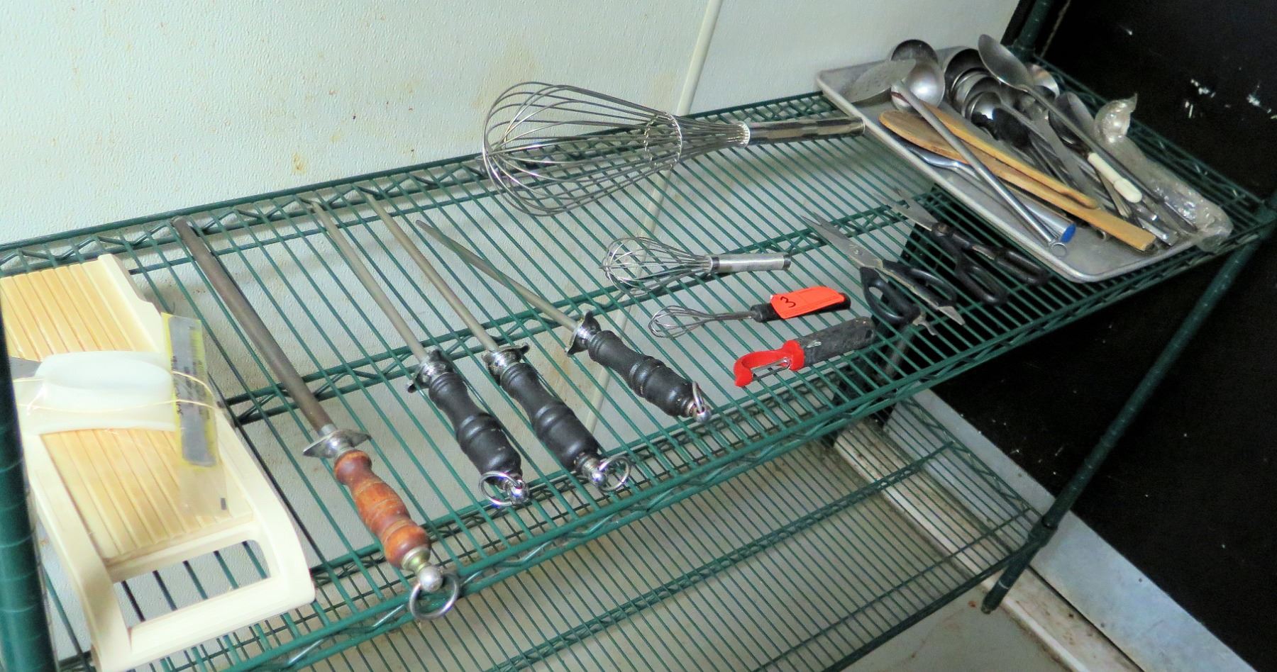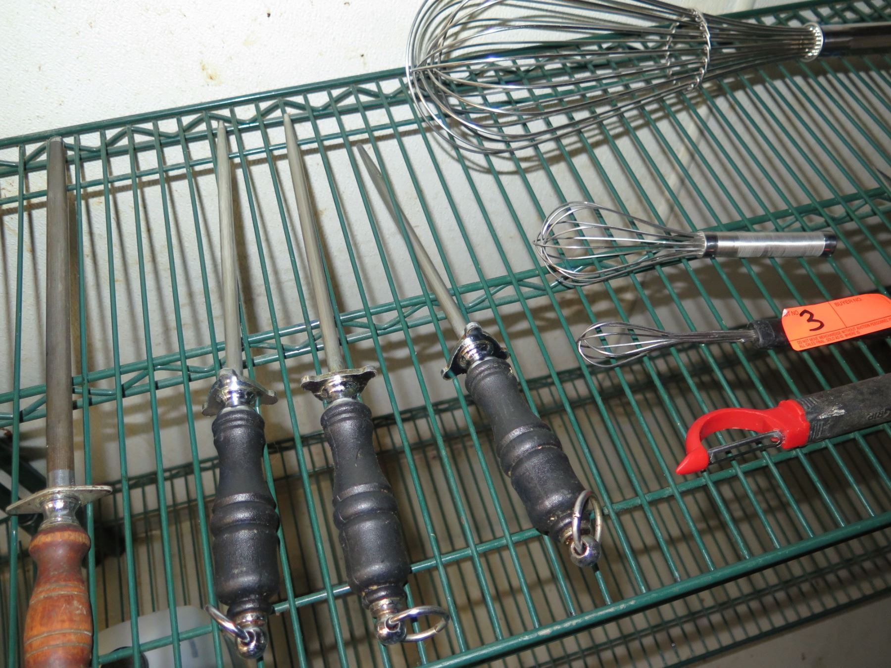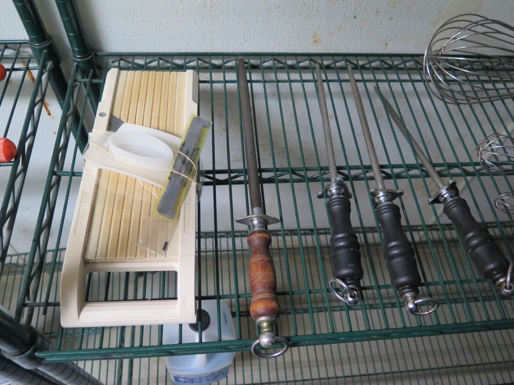 Contents of Shelf: Multiple Knife Sharpener Rods, Utensils, Whisk, etc