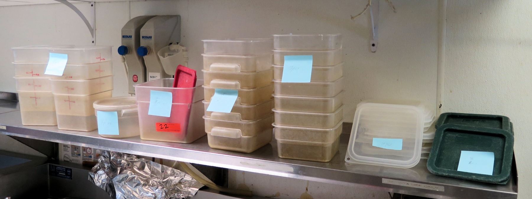 Contents of Shelf: Multiple Plastic Food Storage Bins w/ Some Lids (shelf not included).