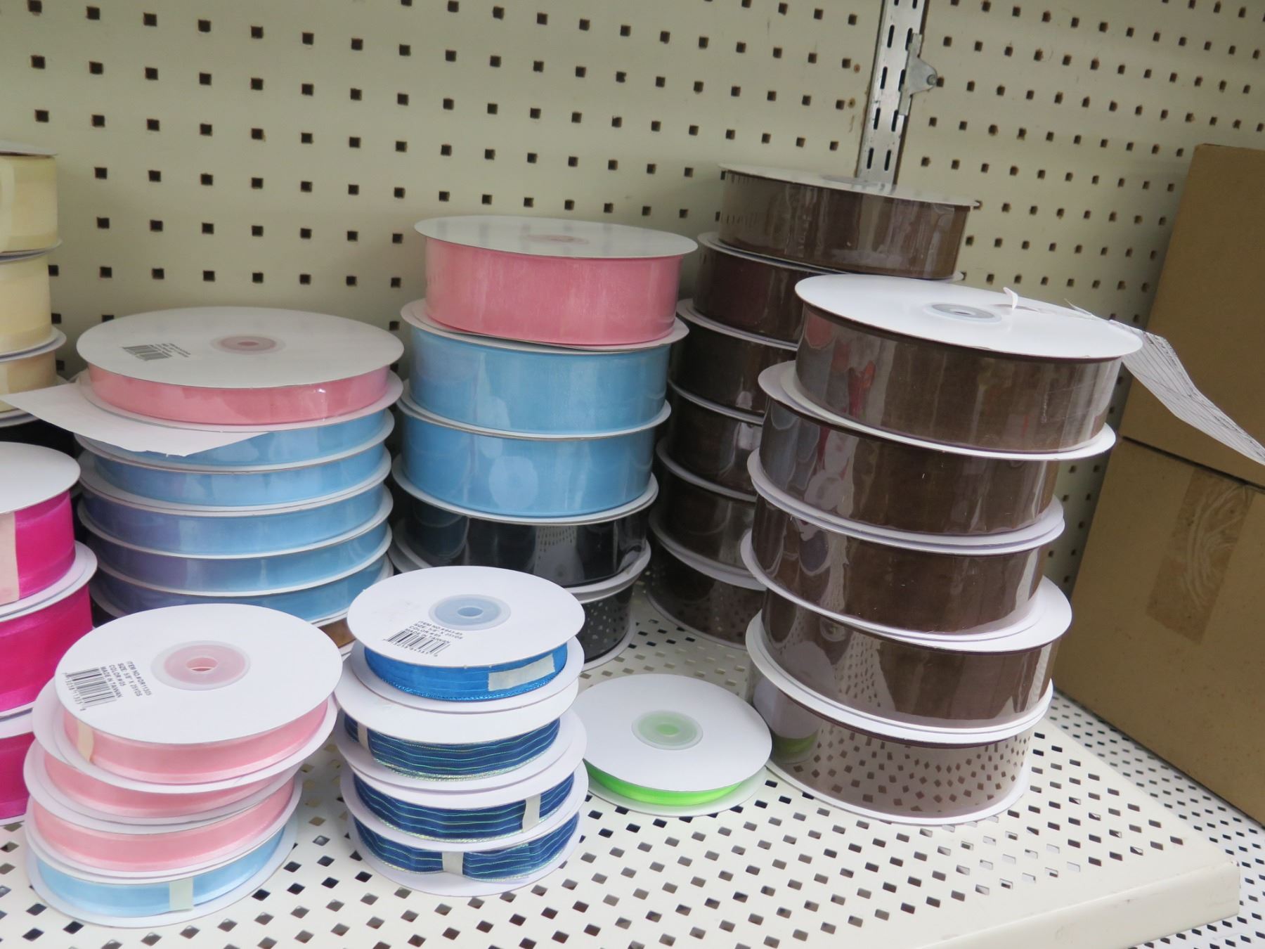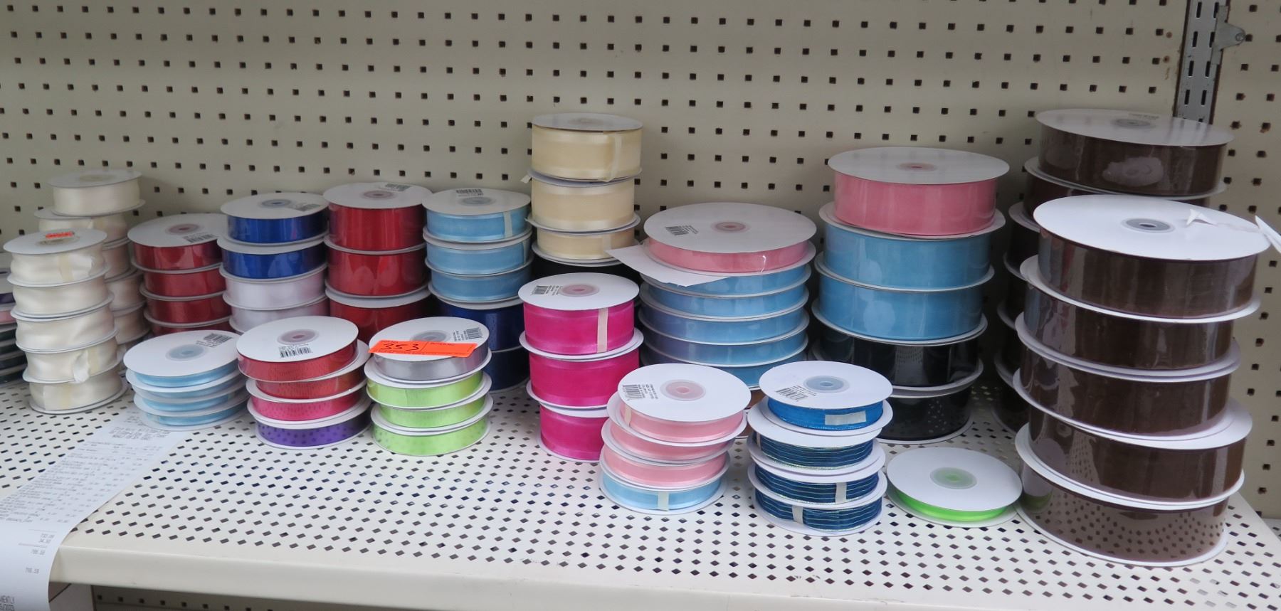 Contents of Shelf: Multiple Ribbon Rolls Misc Colors & Sizes Retail $766 (shelf not included)