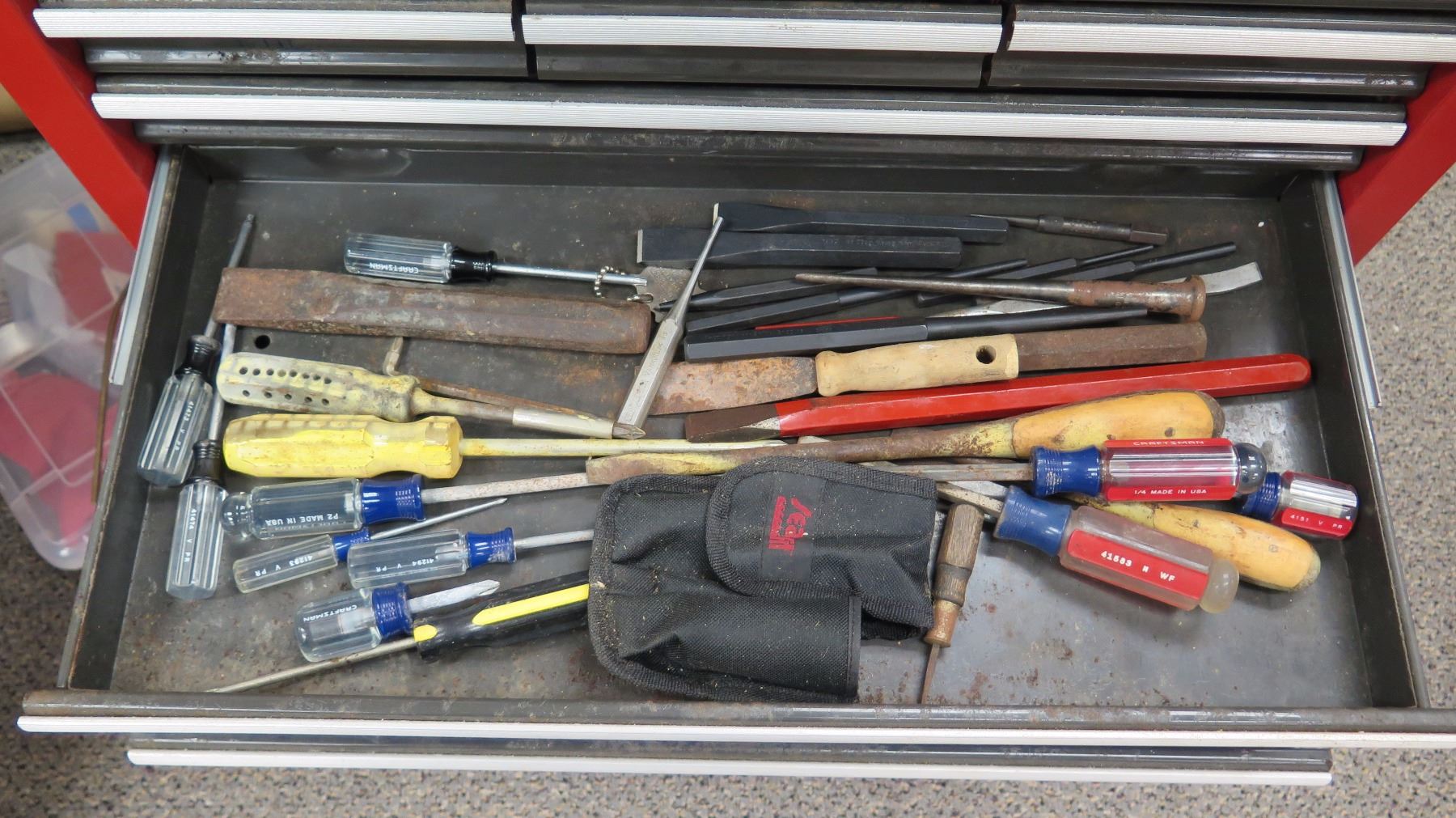 Craftsman Metal Toolbox with Tools: Wrench Sets, Locking Pliers, Cutters, Handsaw, Clamps, etc., No key to toolbox.