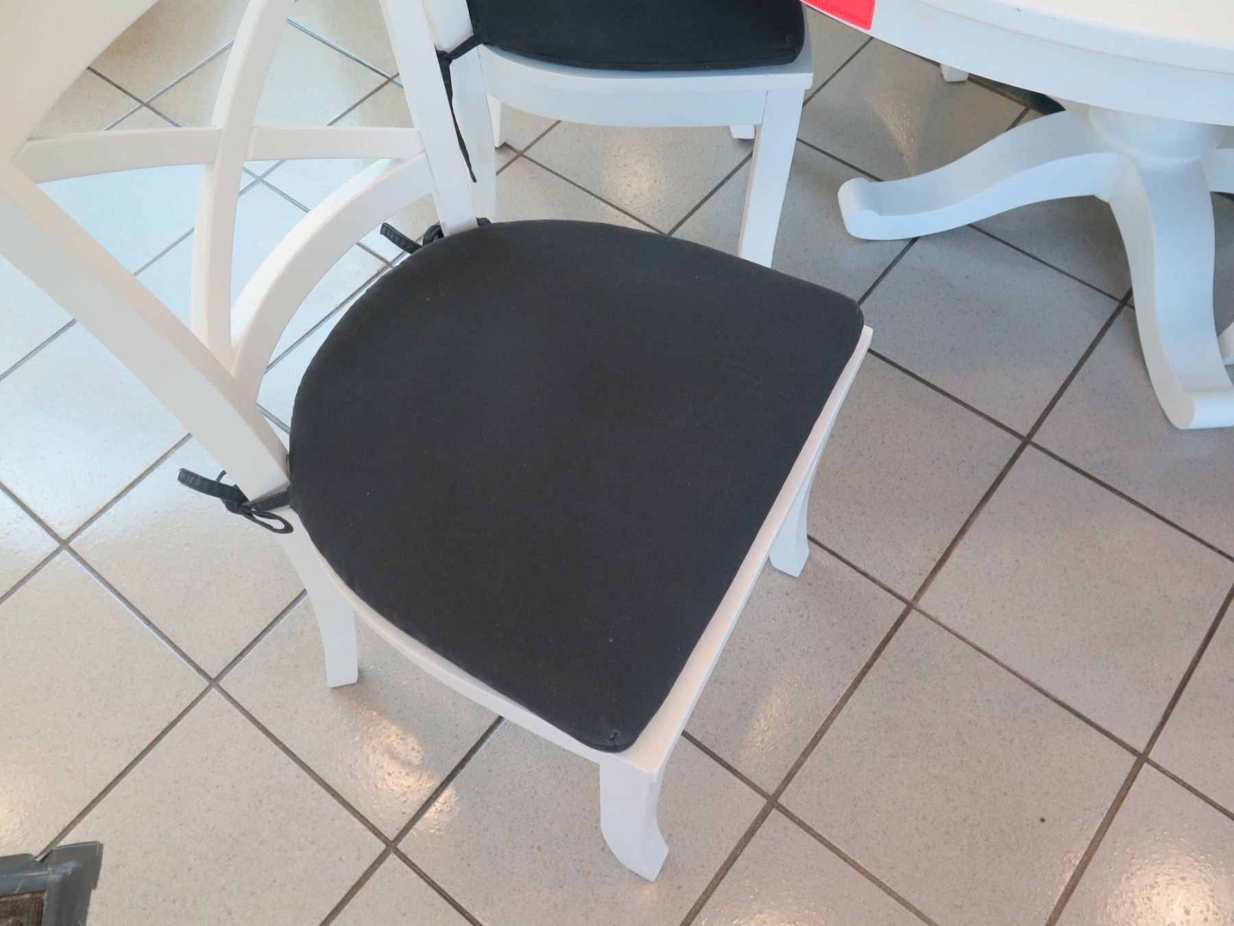 Crate & Barrel White Dining Table w/ 6 Chairs and Removal Cushions. Middle section comes off and converts into a round table. 62"x 45" x 30"H. Chairs are 18" x 18" x 36" back height.