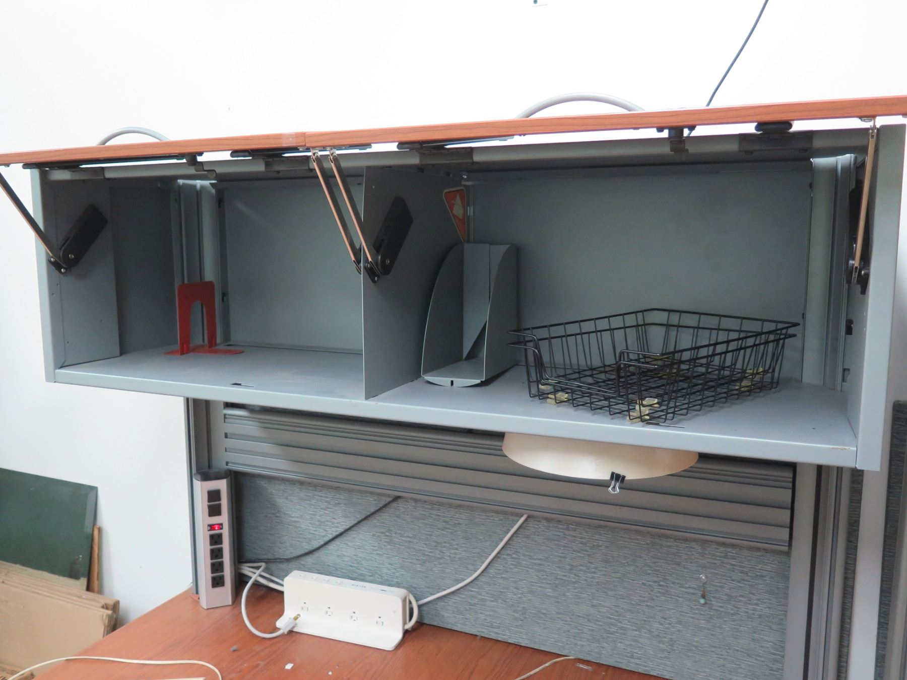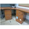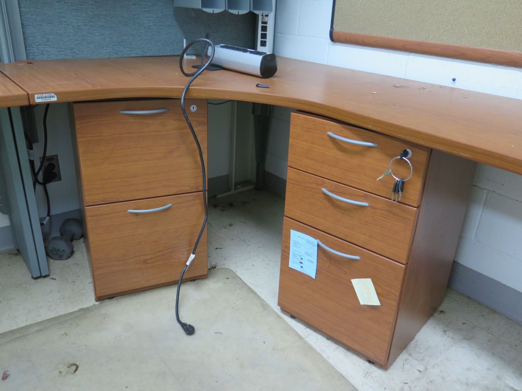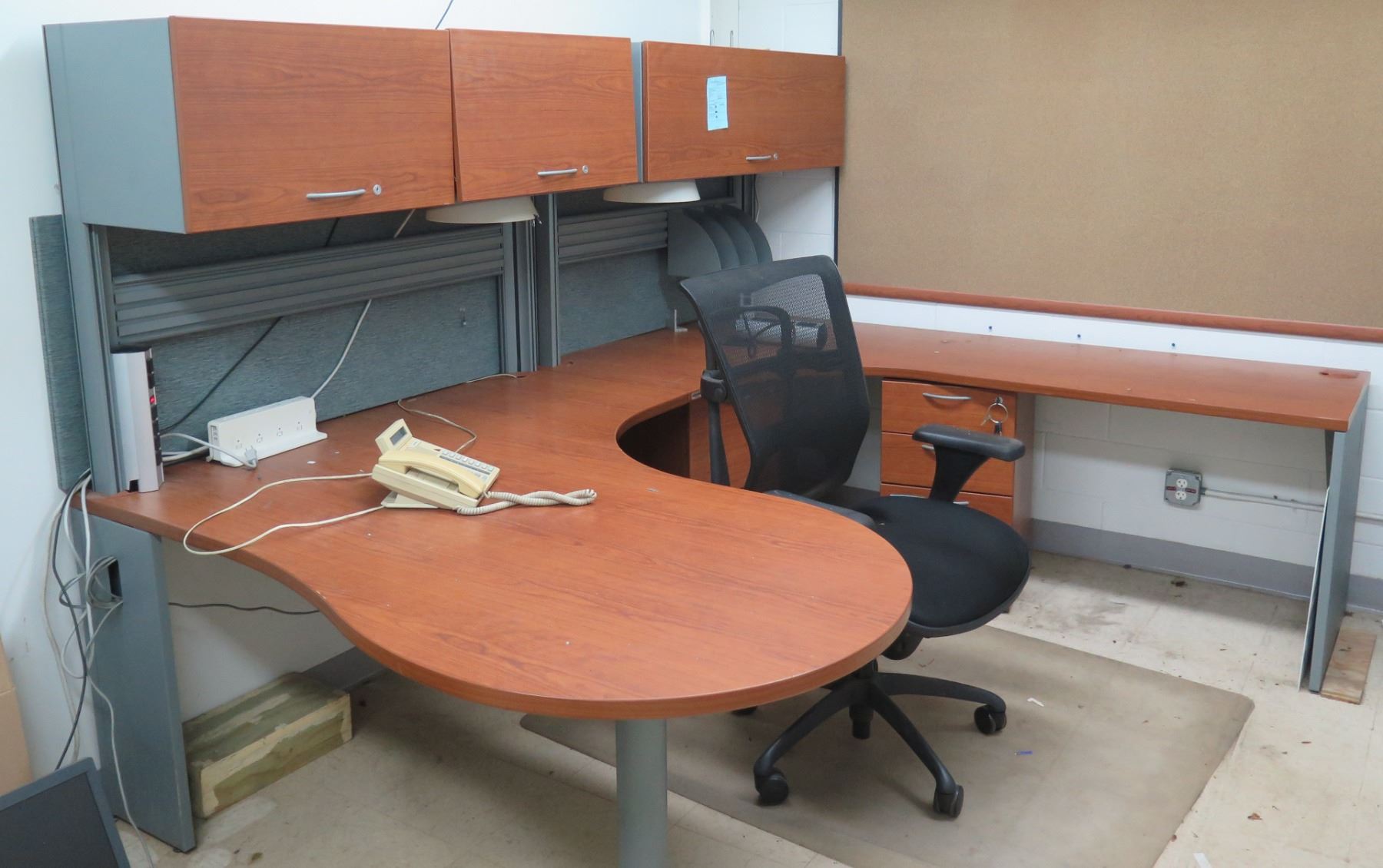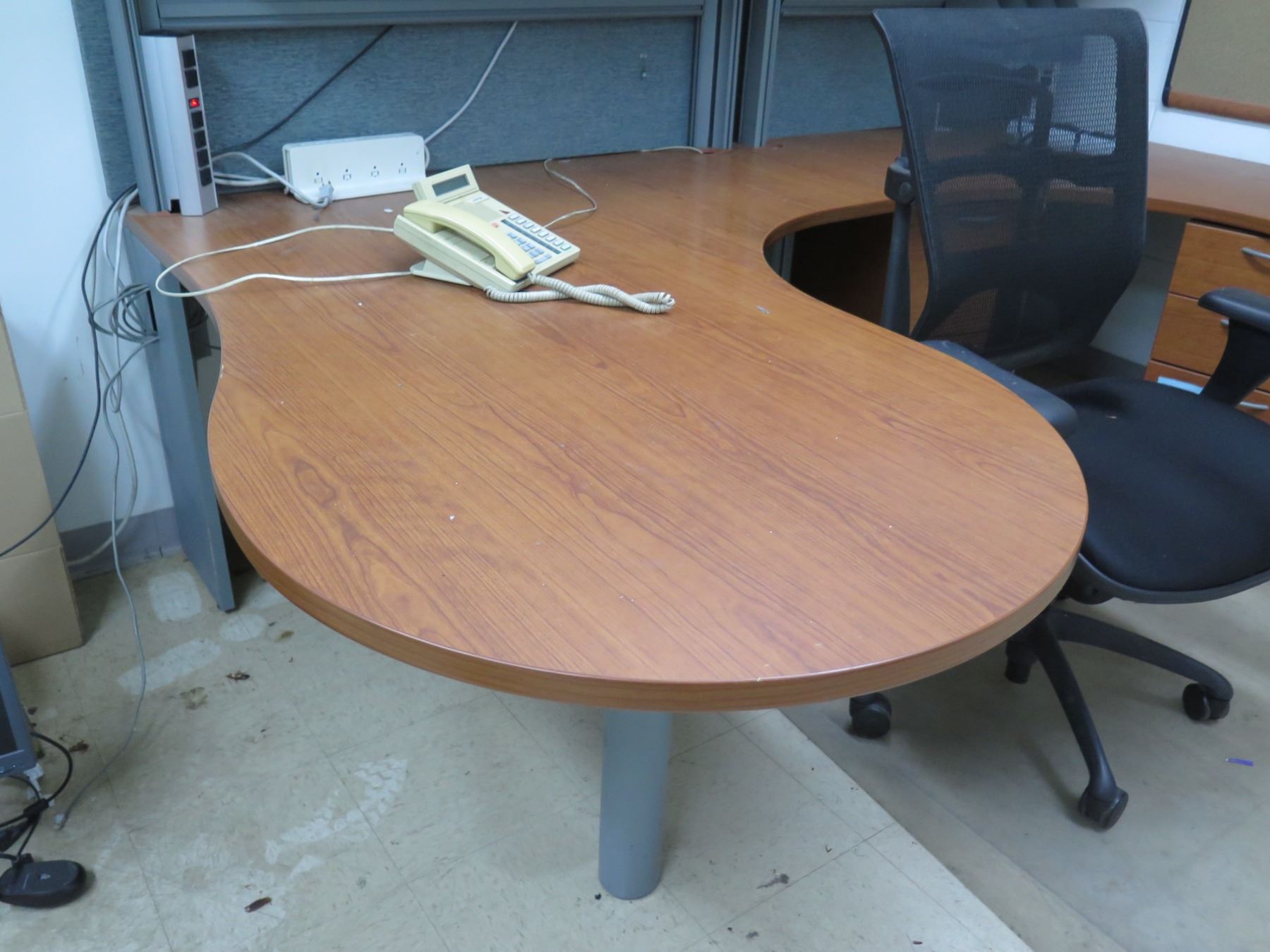 Curved Wooden Desk 83" x 108" x 29"H w/ Top Hutch Shelf, Undercabinets & Chair