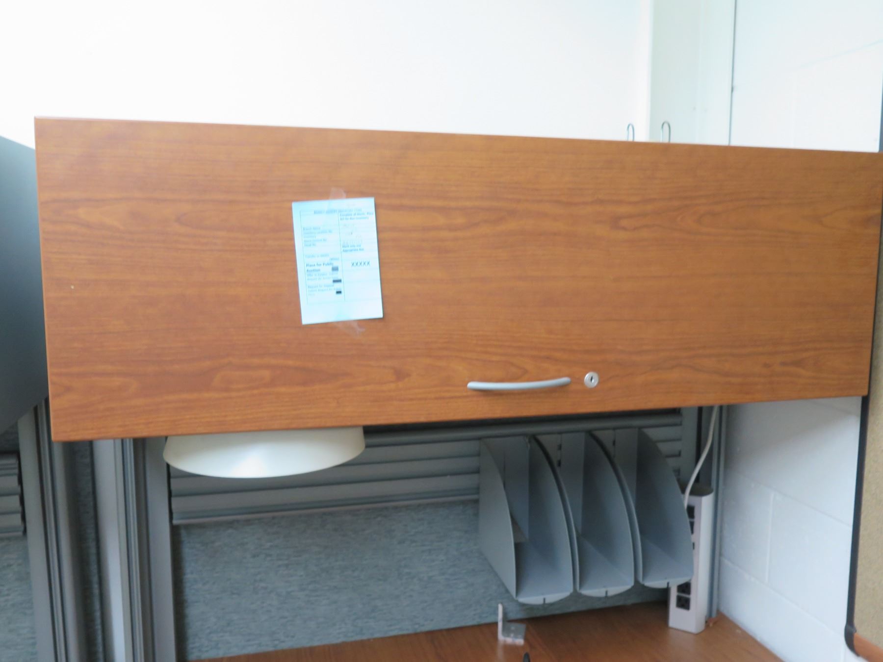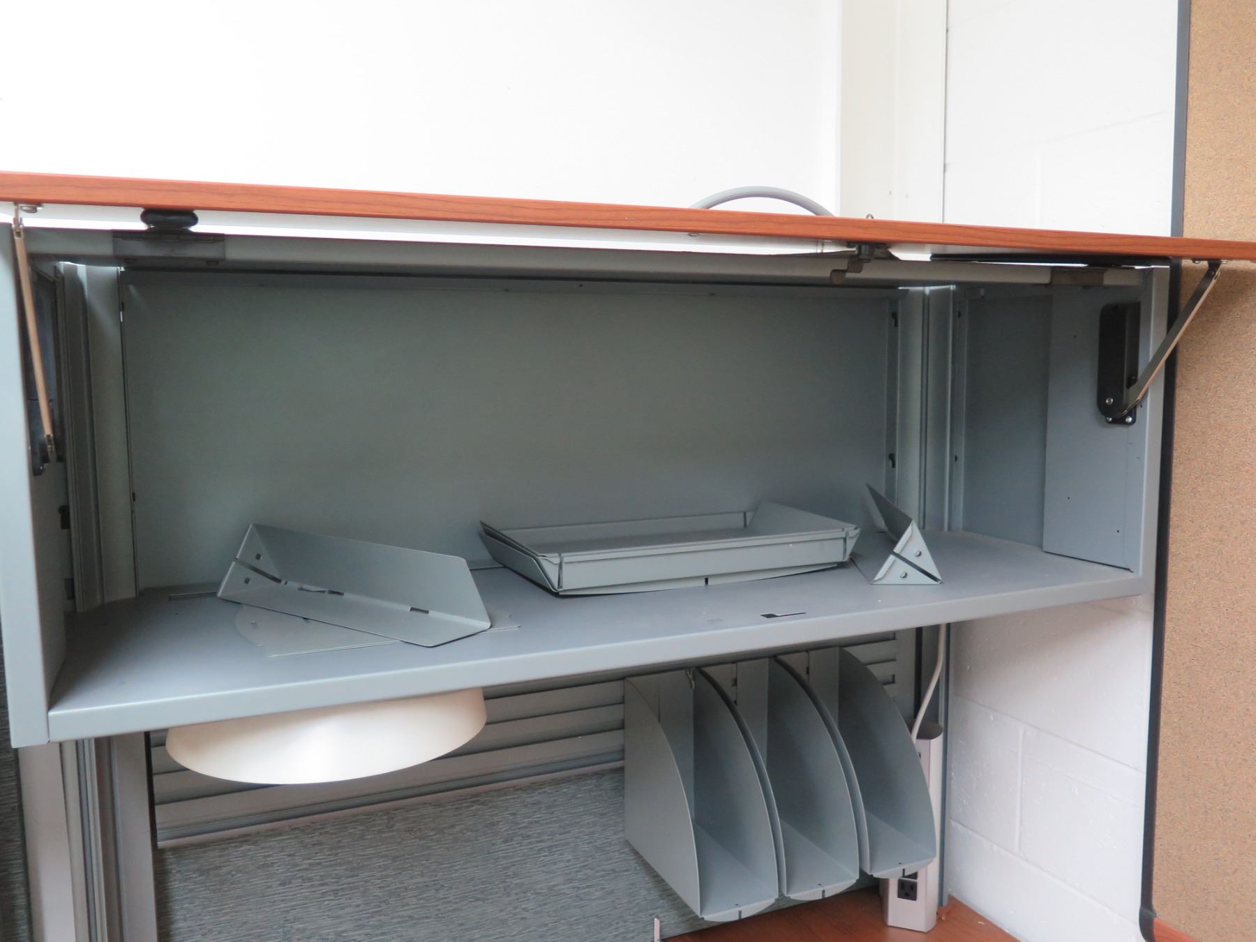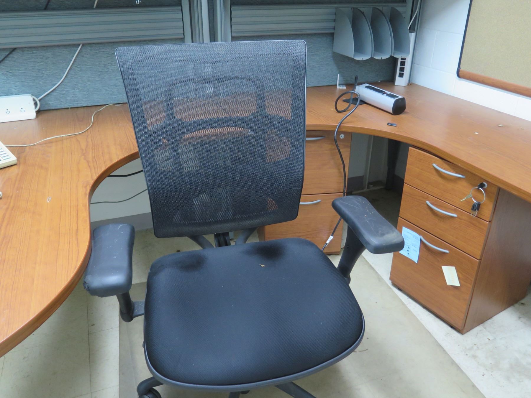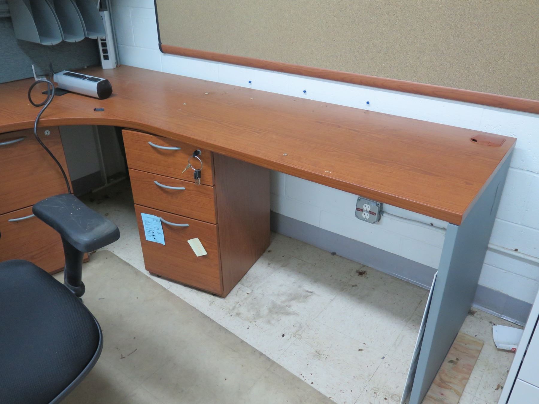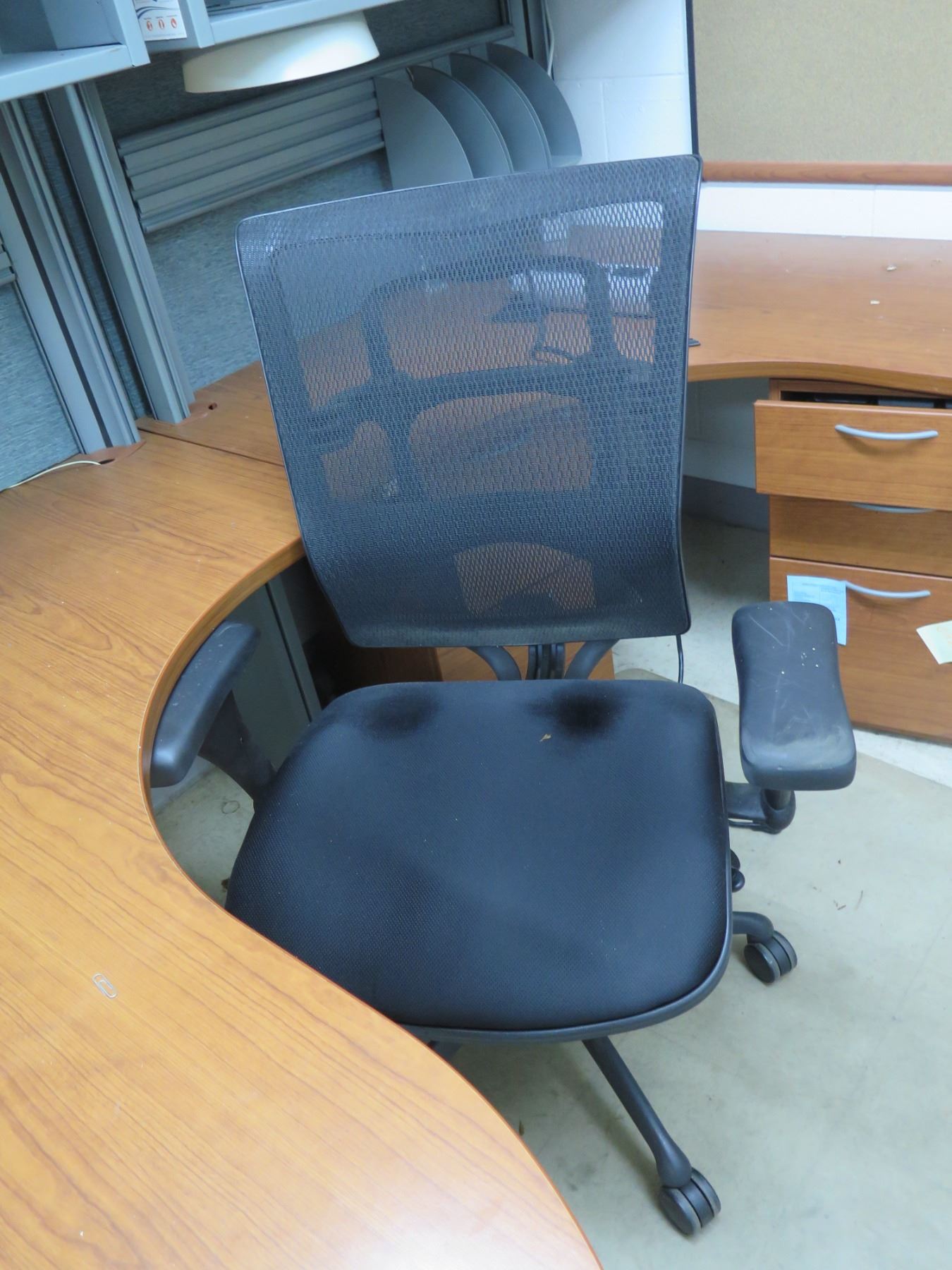 Curved Wooden Desk 83" x 108" x 29"H w/ Top Hutch Shelf, Undercabinets & Chair