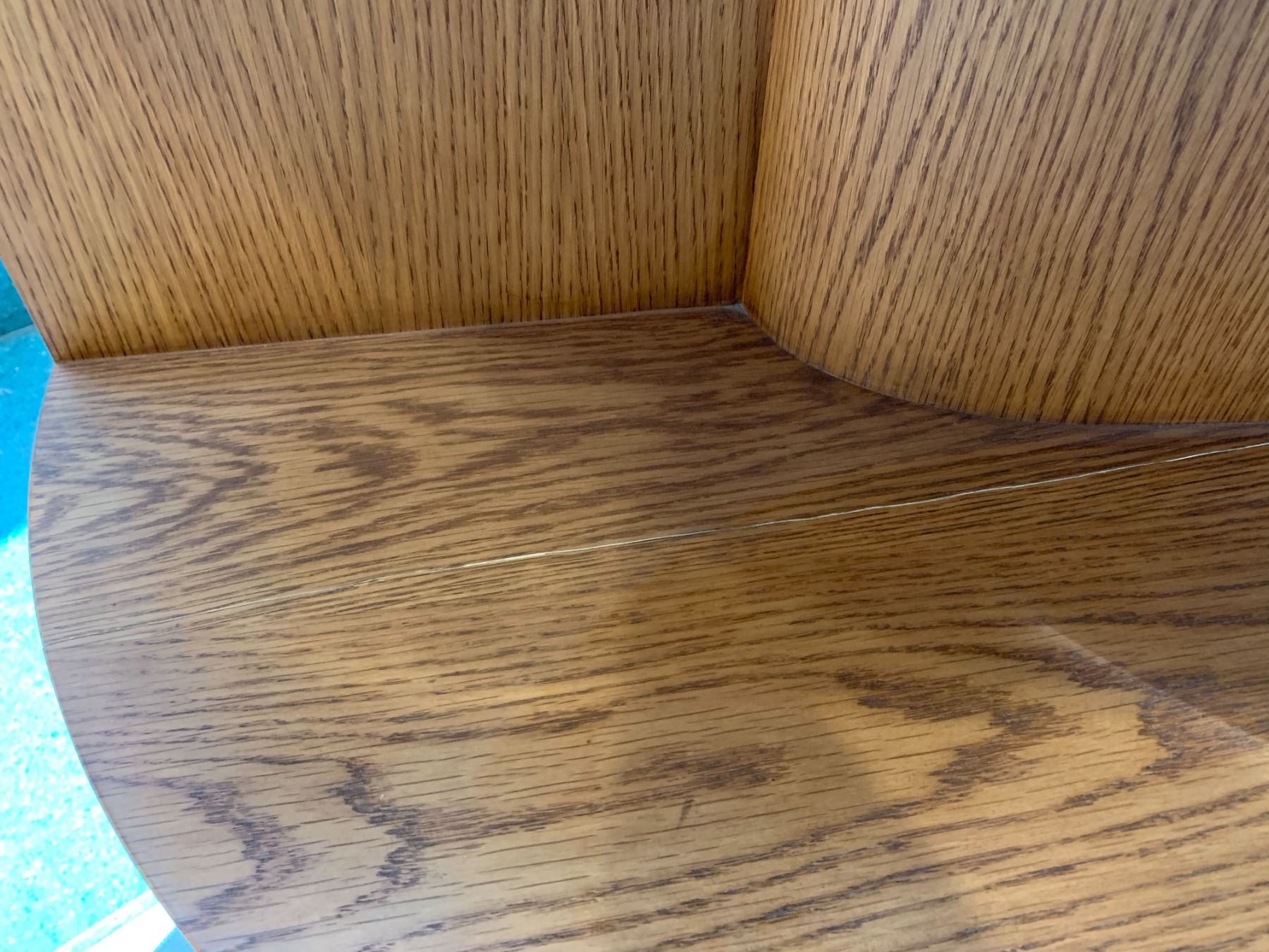 Curved Wooden Shelving Unit. Although the middle shelf is cracked (as shown in photos) it is sturdy and can carry weight. Can be repaired with wood glue.