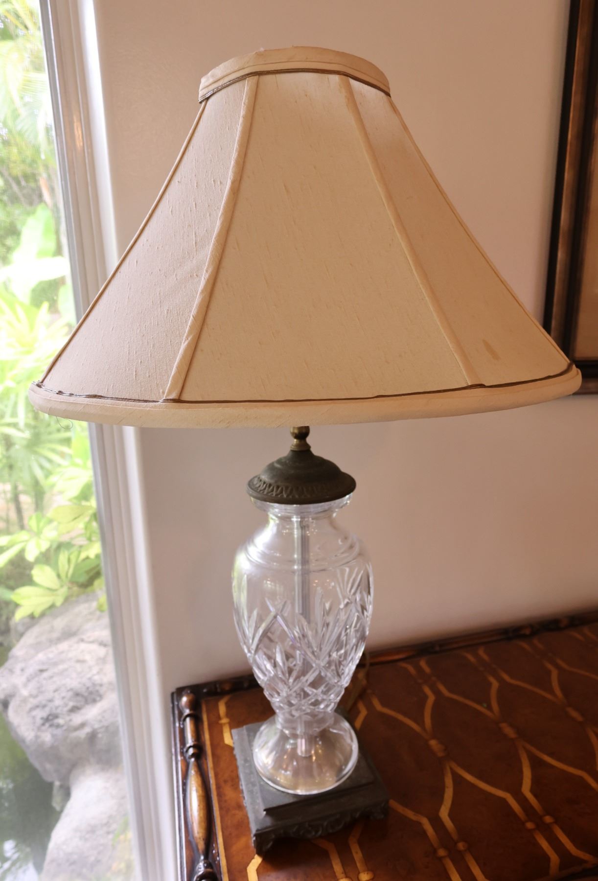 Cut-Glass Table Lamp w/ Metal Accents & Off-White Shade 7" x 7" x 30"H
