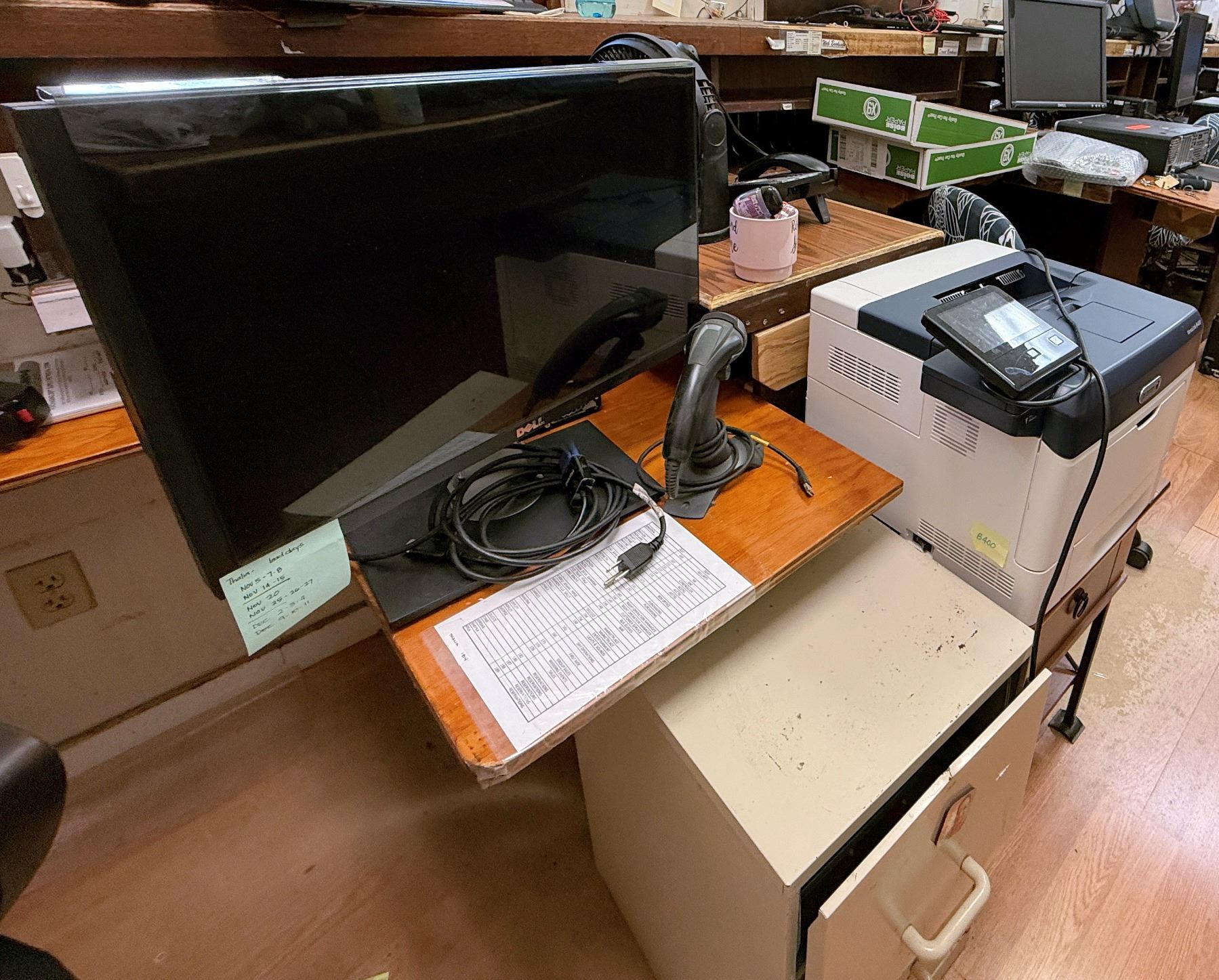 Dell Computer Monitor, Xerox VersiLink B400 Printer, HP Elitedesk, Keyboard, Micros POS Display, etc