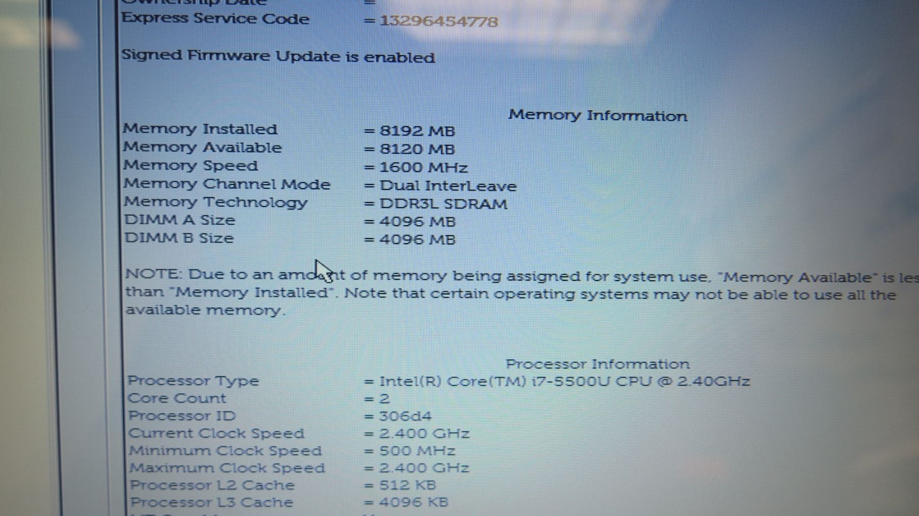 Dell Inspiron 5558 Laptop Core i7 2.4 GHz 8192 MB RAM w/ A/C Adapter (No hard drive)