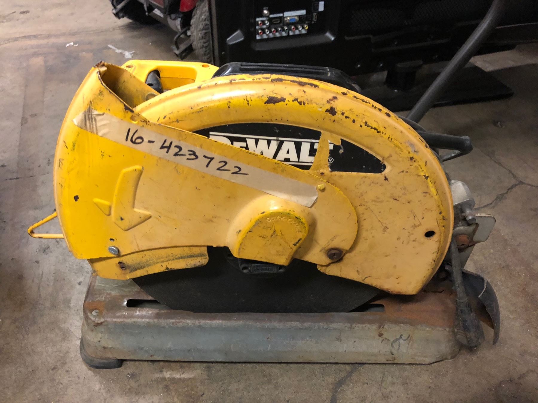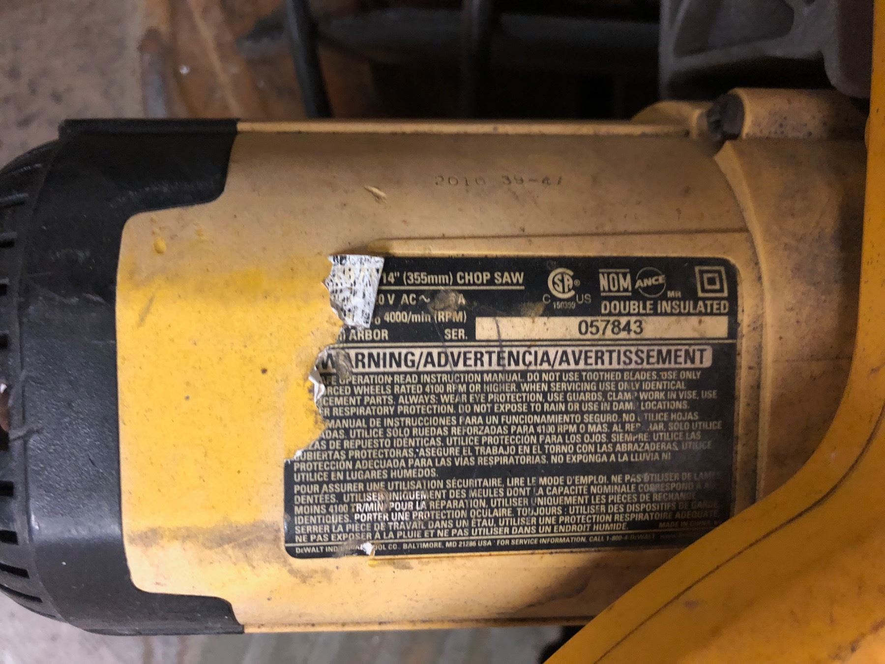 Dewalt Chop Saw. Everything in the auction is being sold “as is” with no guarantees or warranties. All sales final. Returns/refunds/exchanges will not be allowed. You are bidding on what you see in the pictures in their present condition. If you do not see an AC adapter, power cord/cable, batteries, accessories, manuals, original box it’s because we don’t have it. We have not personally used any of these items and unsure of functionaltiy of electronics, tools, equipment, gear, musical instruments, sporting goods items, bikes, mopeds, etc.