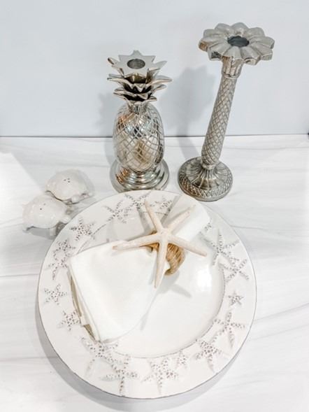 Dining Beach Décor Set for 6: Starfish Plates, Cloth Napkins, Napkin Holders, Candlesticks, etc