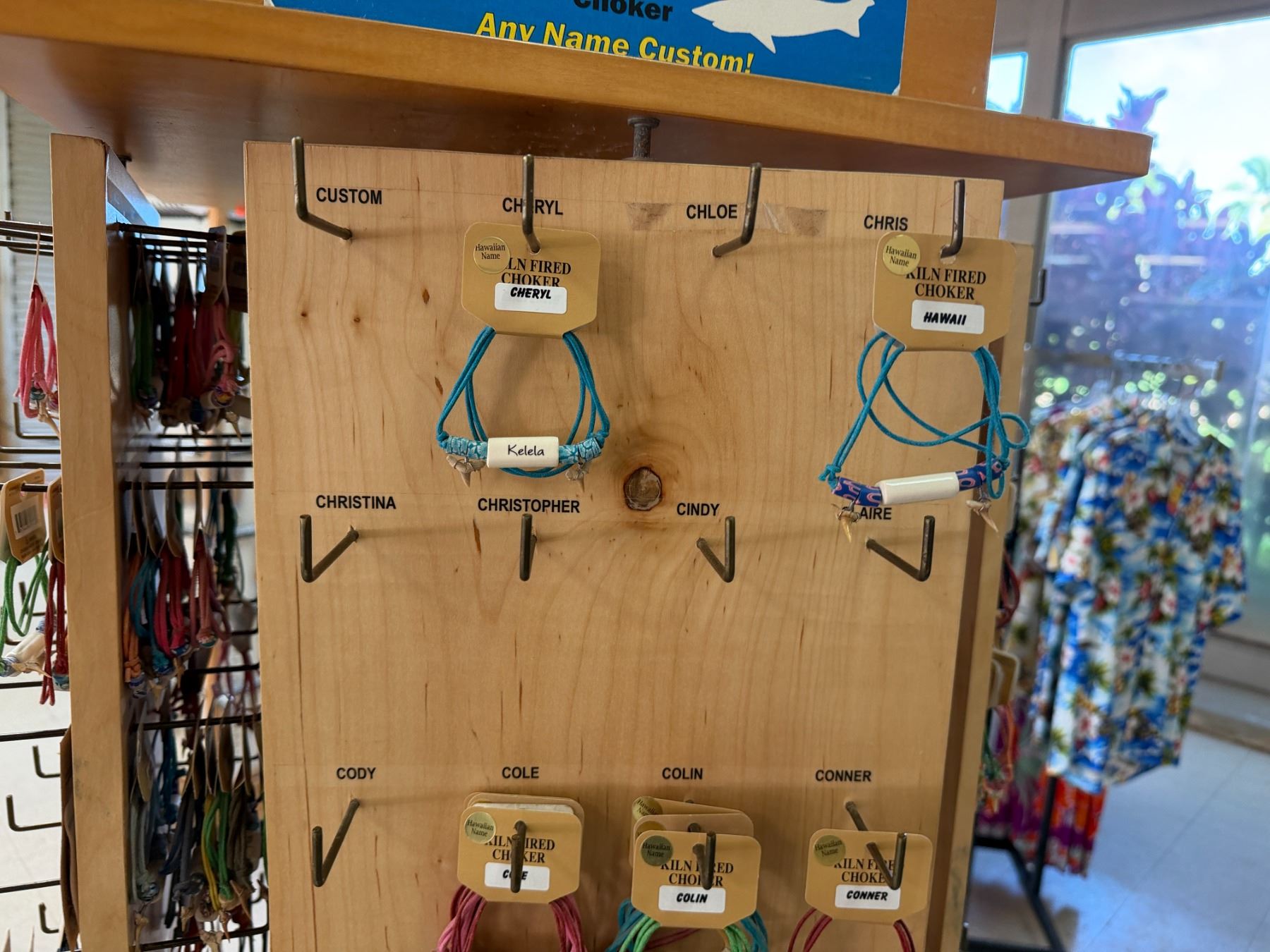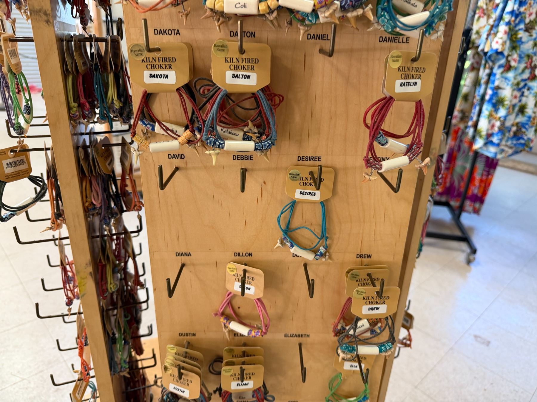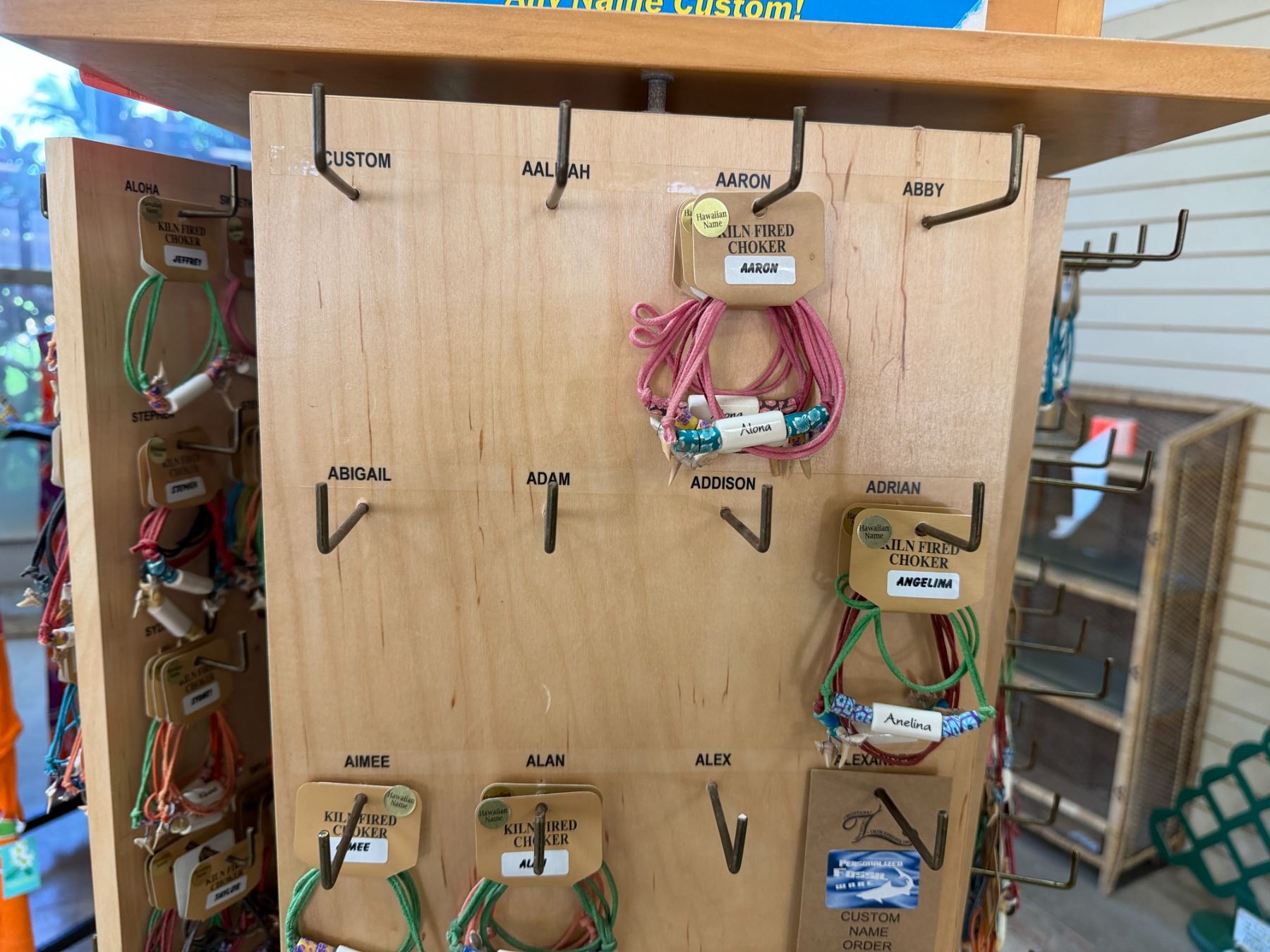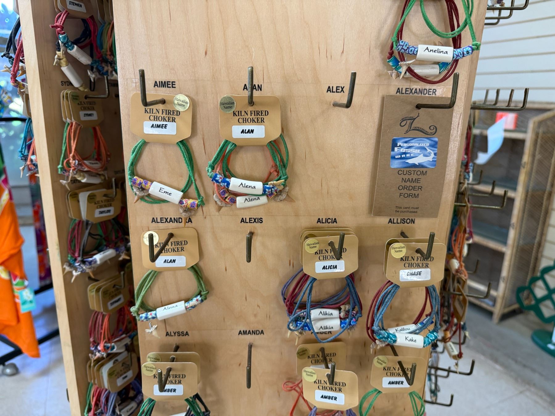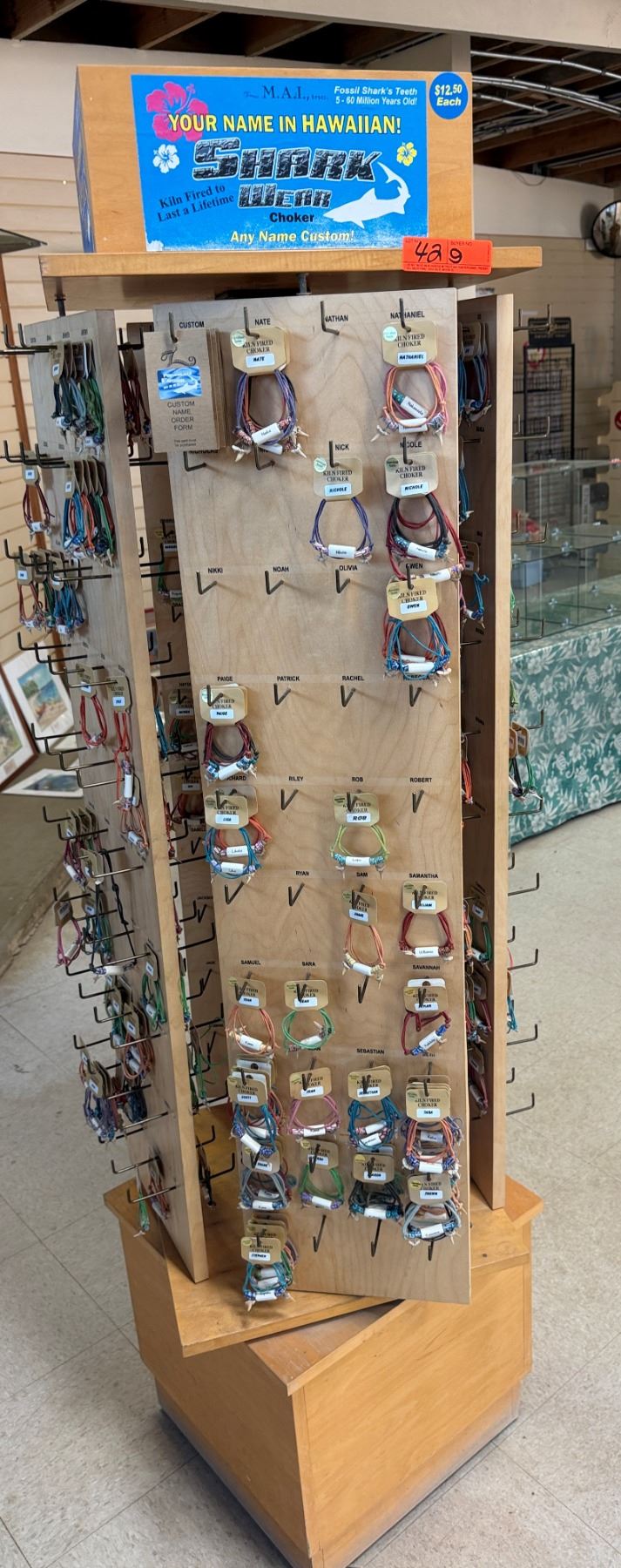 Display Rack w/ Multiple Your Name in Hawaiian Shark Wear Chokers