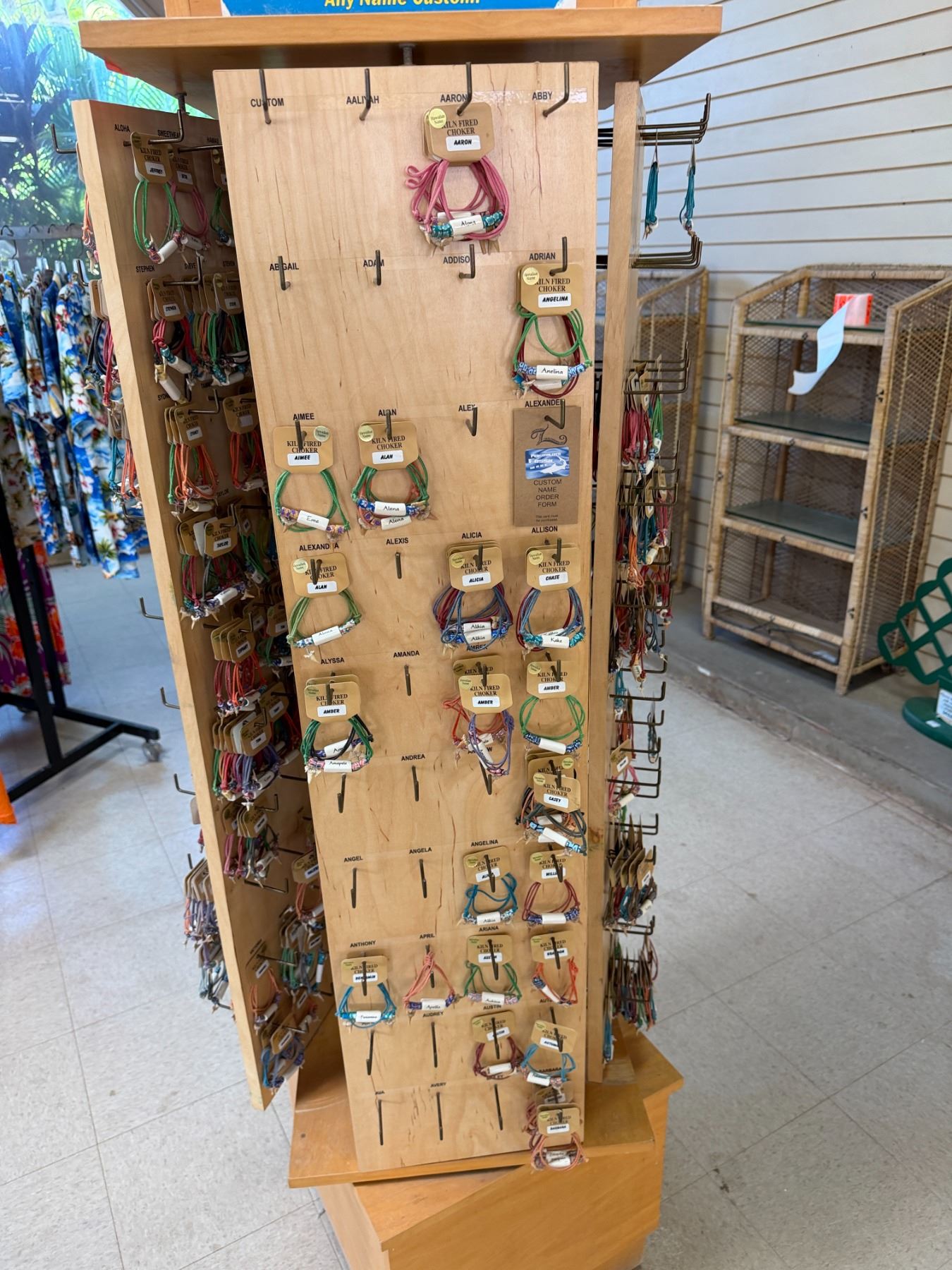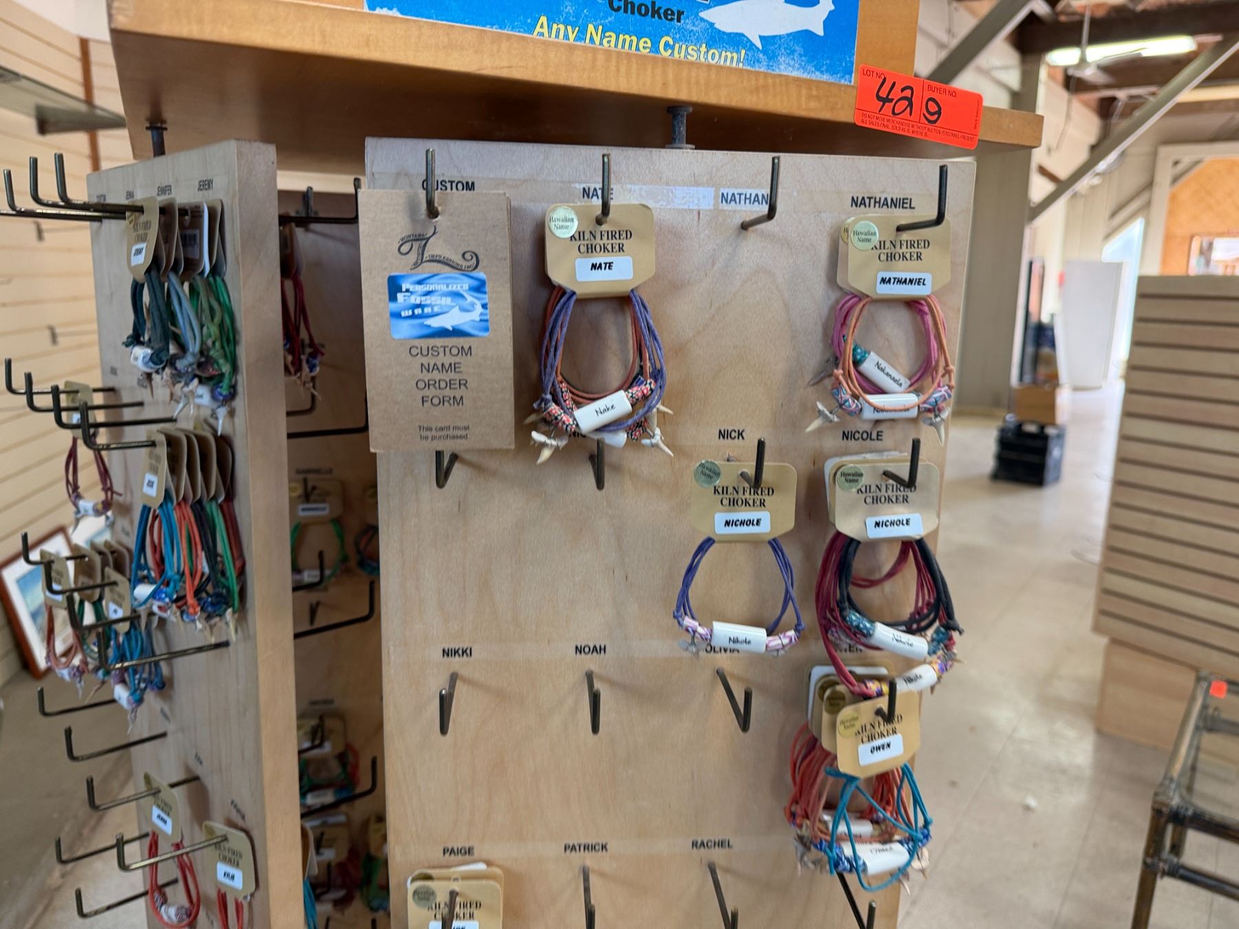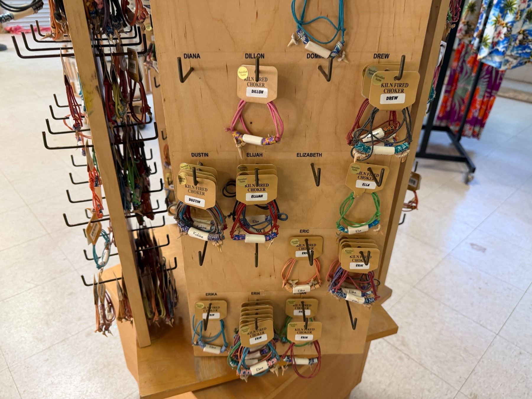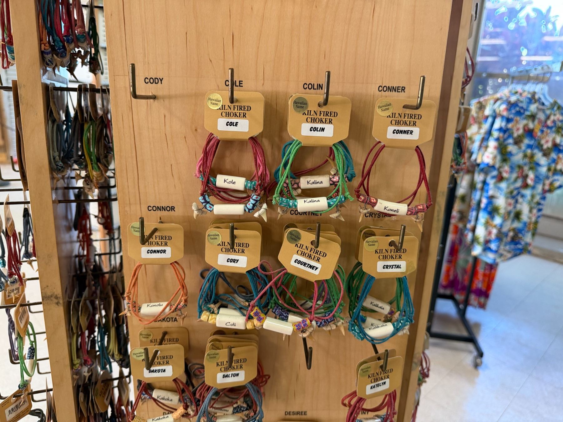 Display Rack w/ Multiple Your Name in Hawaiian Shark Wear Chokers