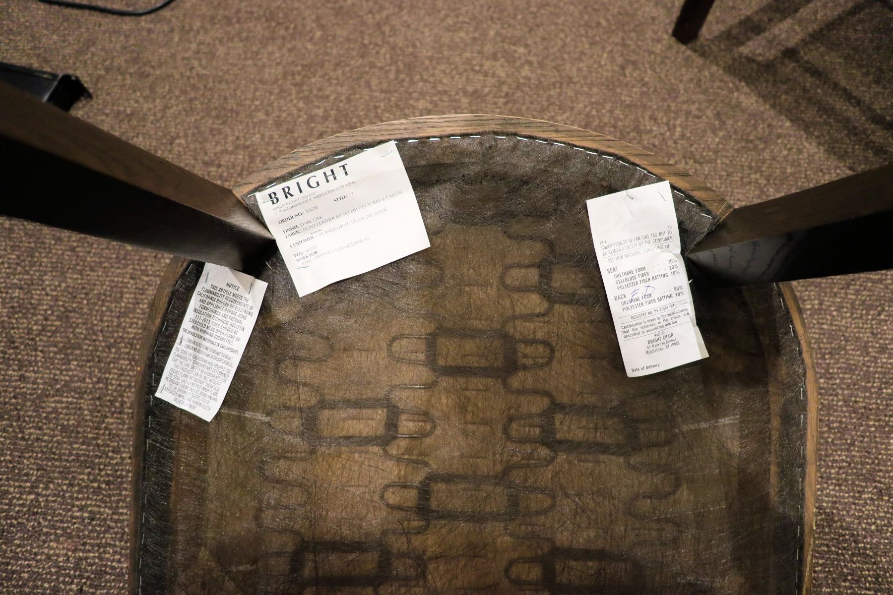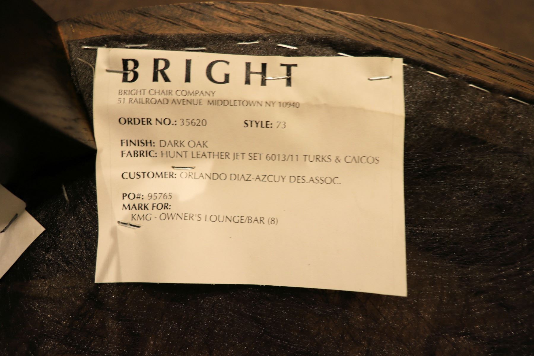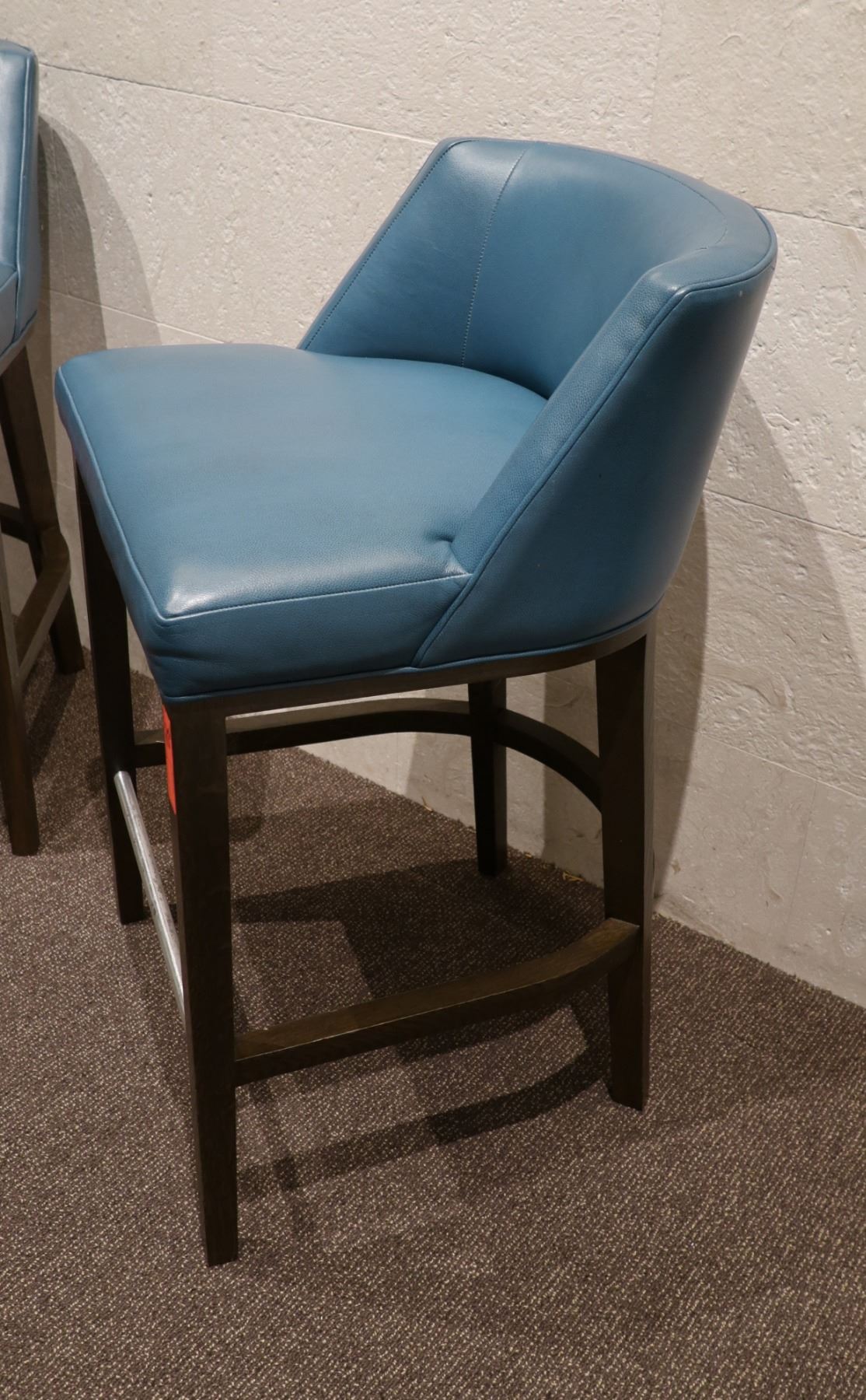 ENO pair of low back bar stools with blue upholstered leather (a few dings on wood frame, minor random scuffs on leather). Purchased for $4537 each bar stool.