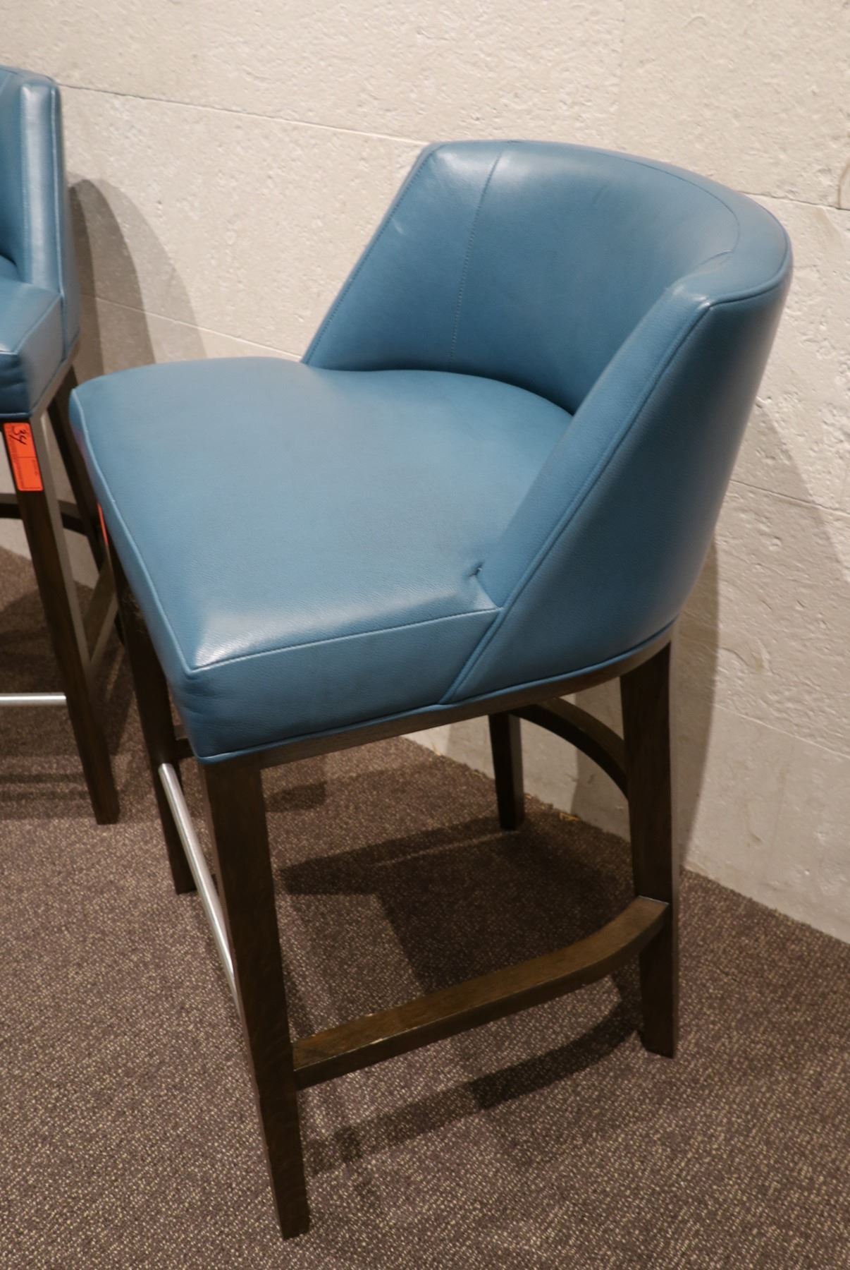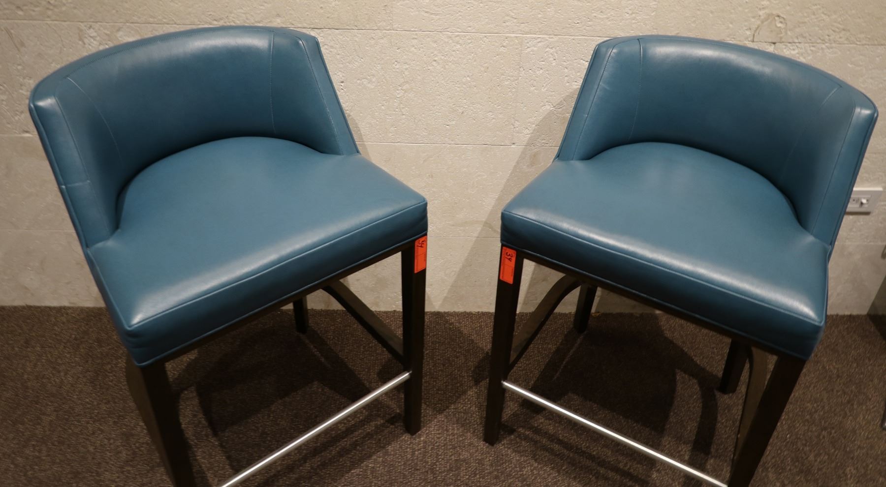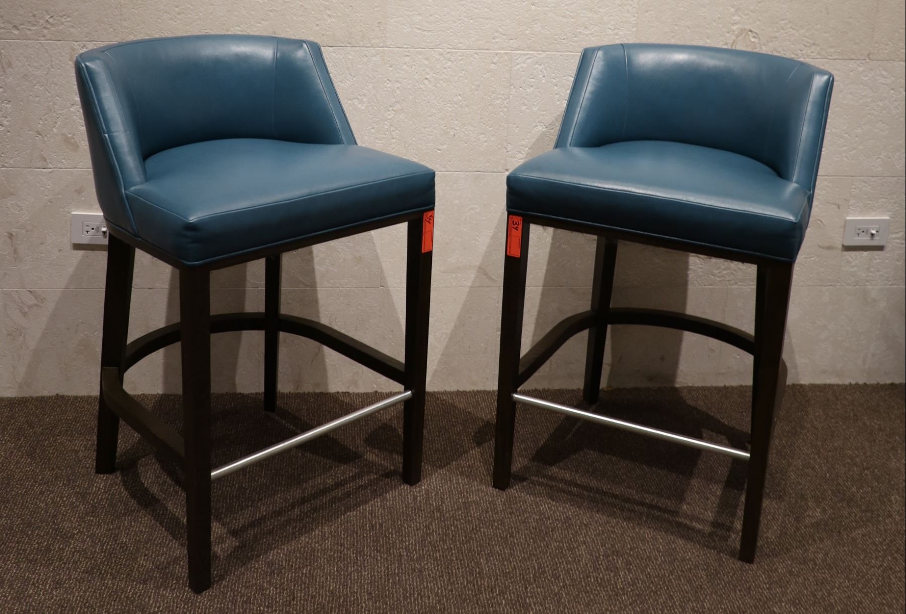 ENO pair of low back bar stools with blue upholstered leather (a few dings on wood frame, minor random scuffs on leather). Purchased for $4537 each bar stool.