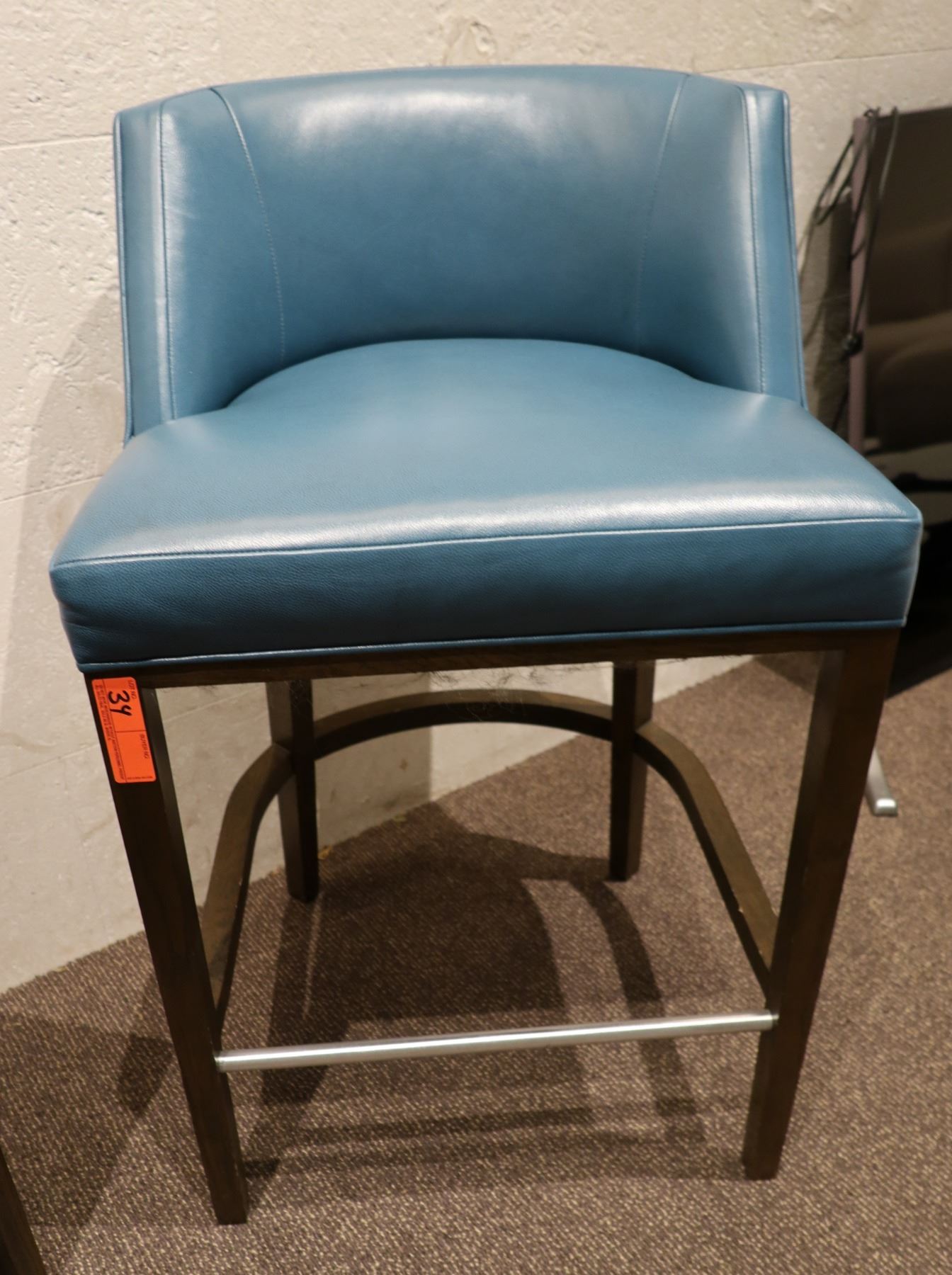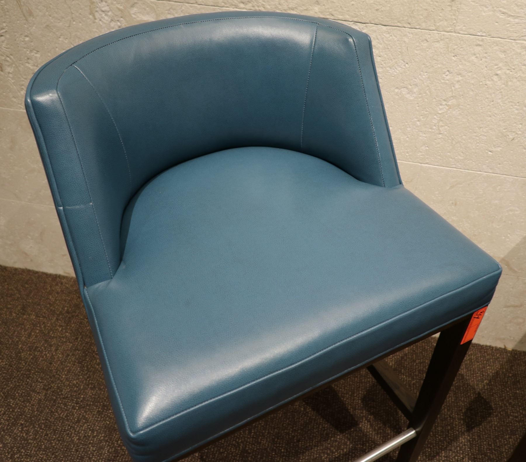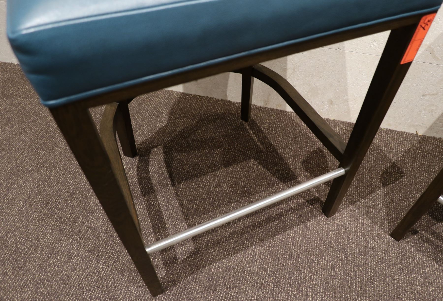 ENO pair of low back bar stools with blue upholstered leather (a few dings on wood frame, minor random scuffs on leather). Purchased for $4537 each bar stool.