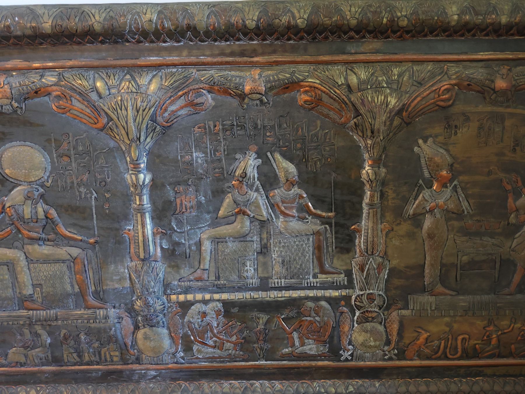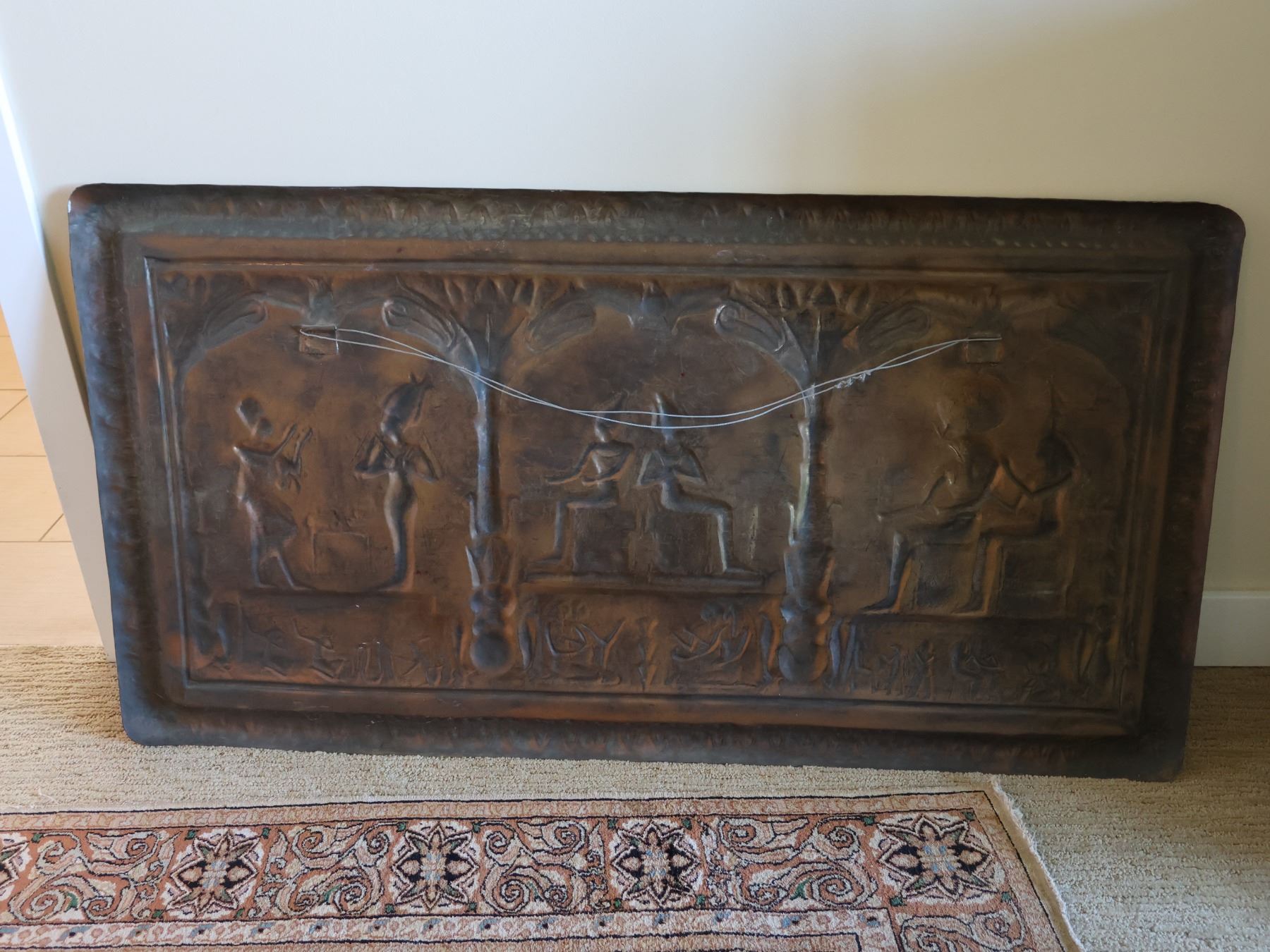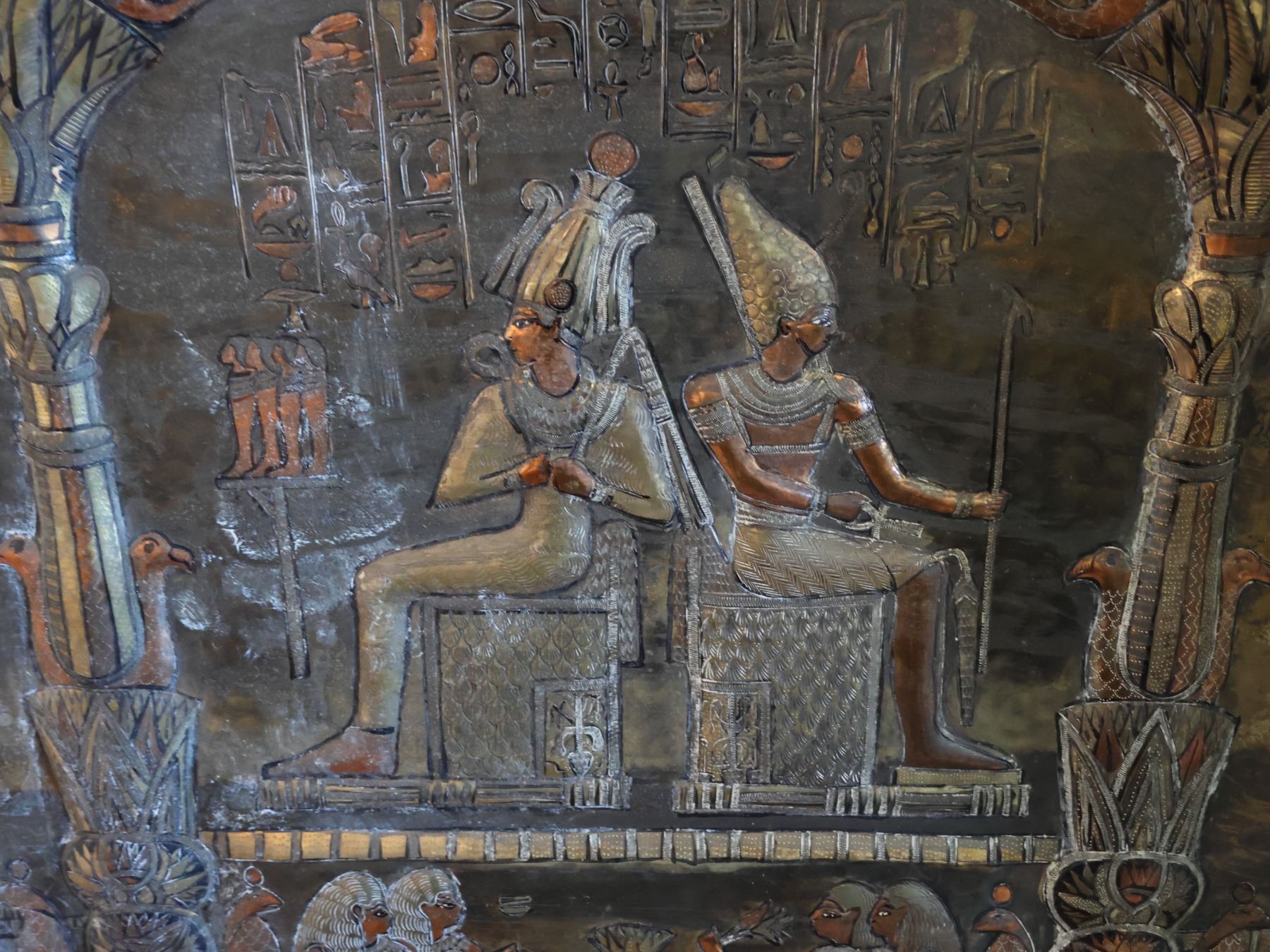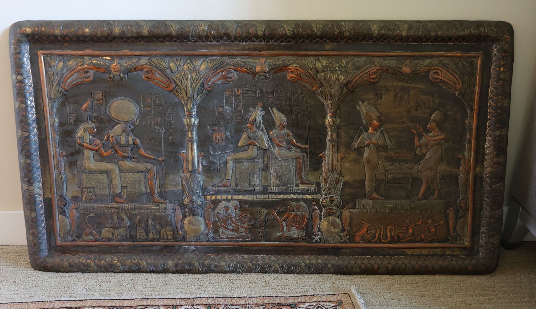 Egyptian-Style Rectangular Copper Relief Plaque Depicting a Tripartite Scene w/ Hammered Hieroglyphs 51" x 27"