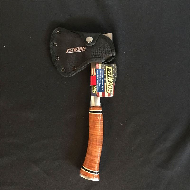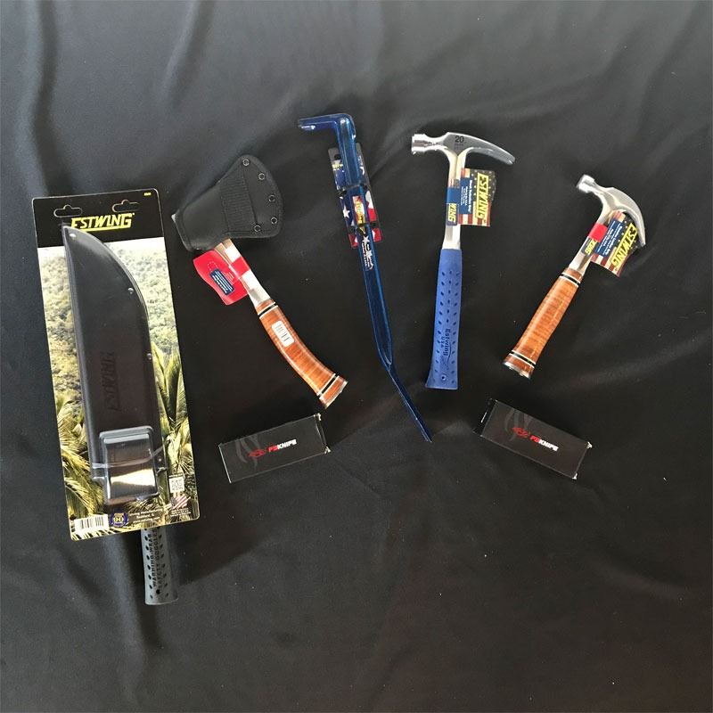 Estwing E12C 12 Oz Curved Claw Hammer with Smooth Face and Genuine Leather Grip, Estwing E24A Forged Steel Camp Axe with 9.5-in. Steel Handle, Estwing EBM Machete with 19-inch blade, Estwing E320S 20 oz. Rip Claw Solid Steel Smooth Face Hammer, Estwing PB-18 18" Lightweight I-Beam Construction Pry Bar & 2 FireBird Knives All New. Donated By: Estwing Manufacturing, Inc. and Kaneohe Gun Shop
