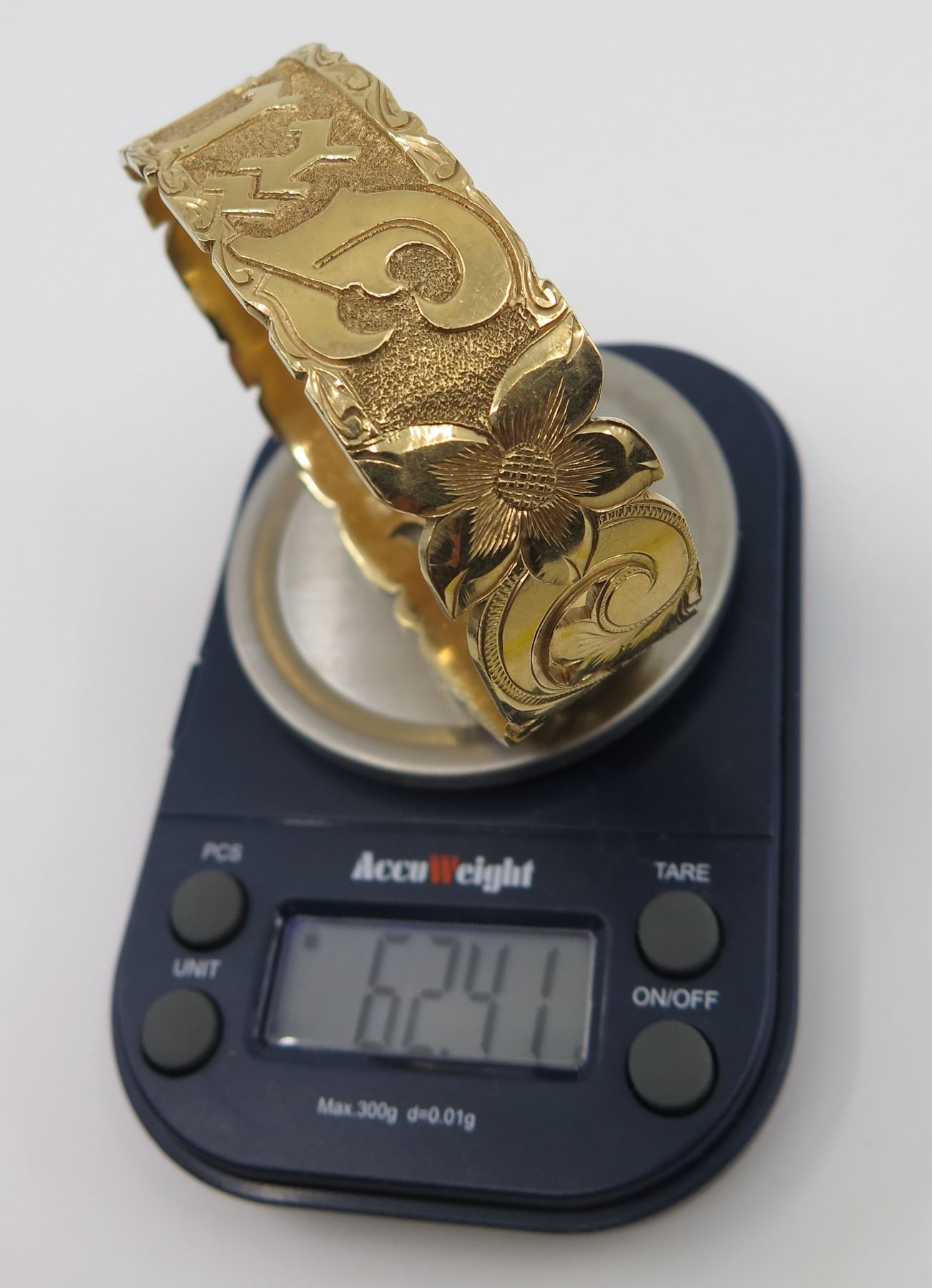 Etched 14K Gold Hawaiian Bracelet w/ Scroll & Floral Design, 62.41 Grams