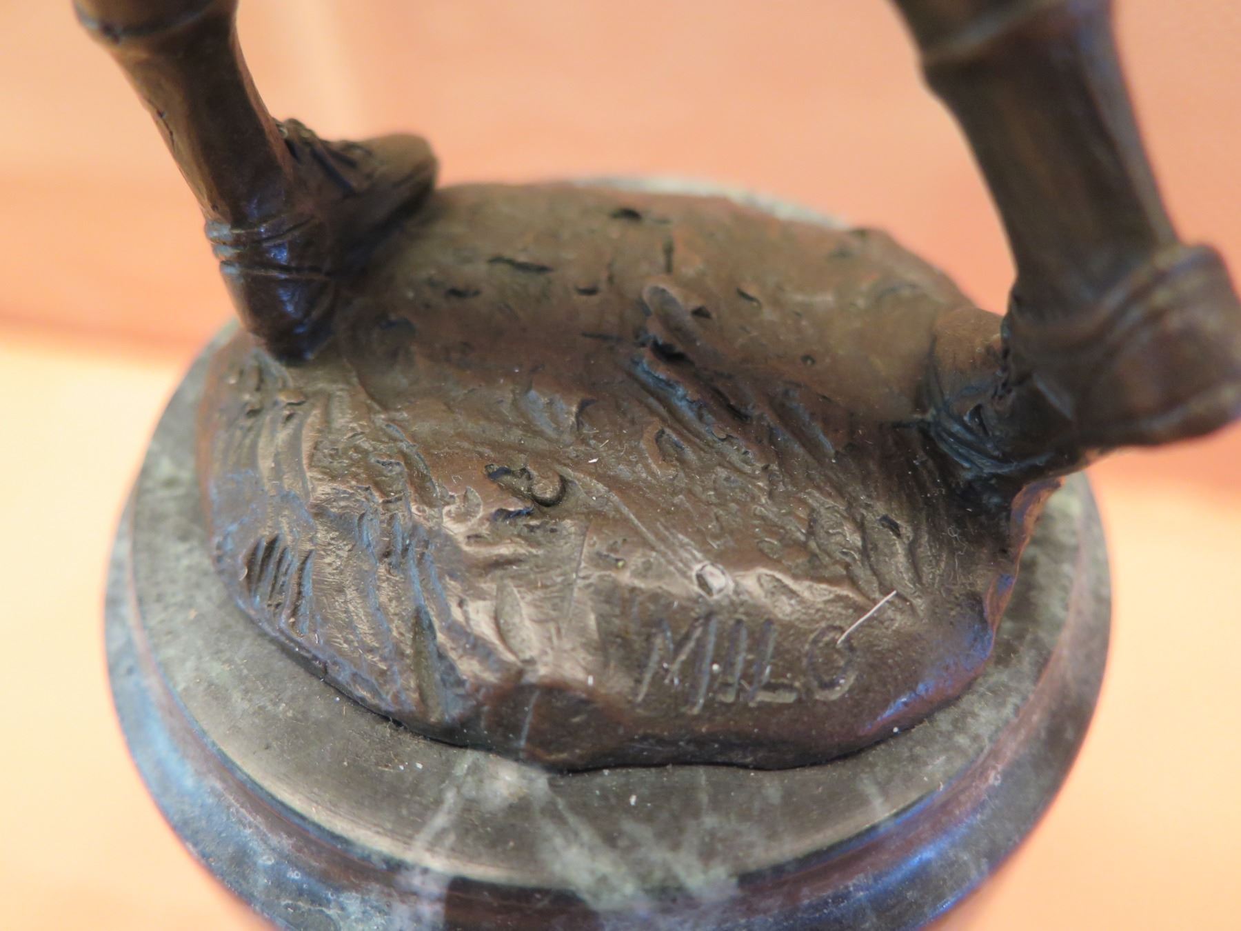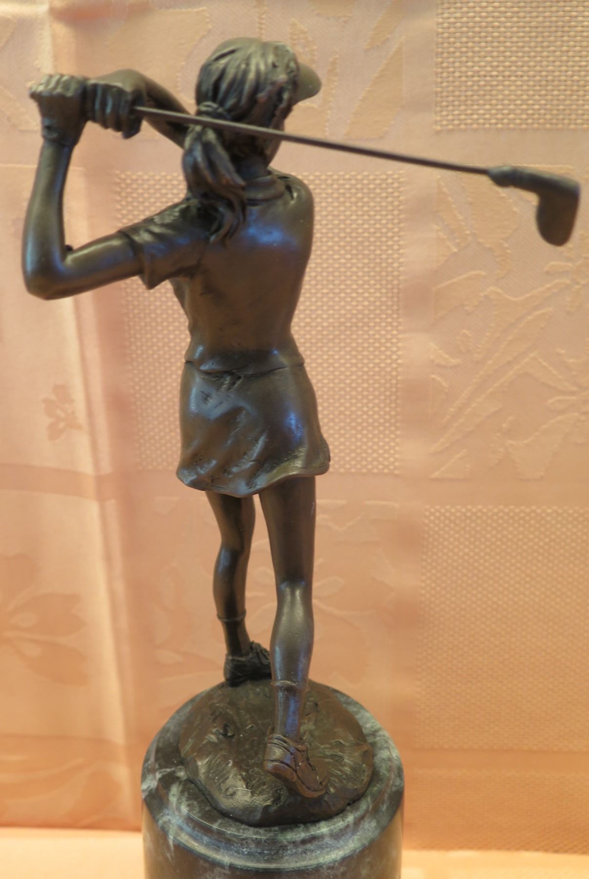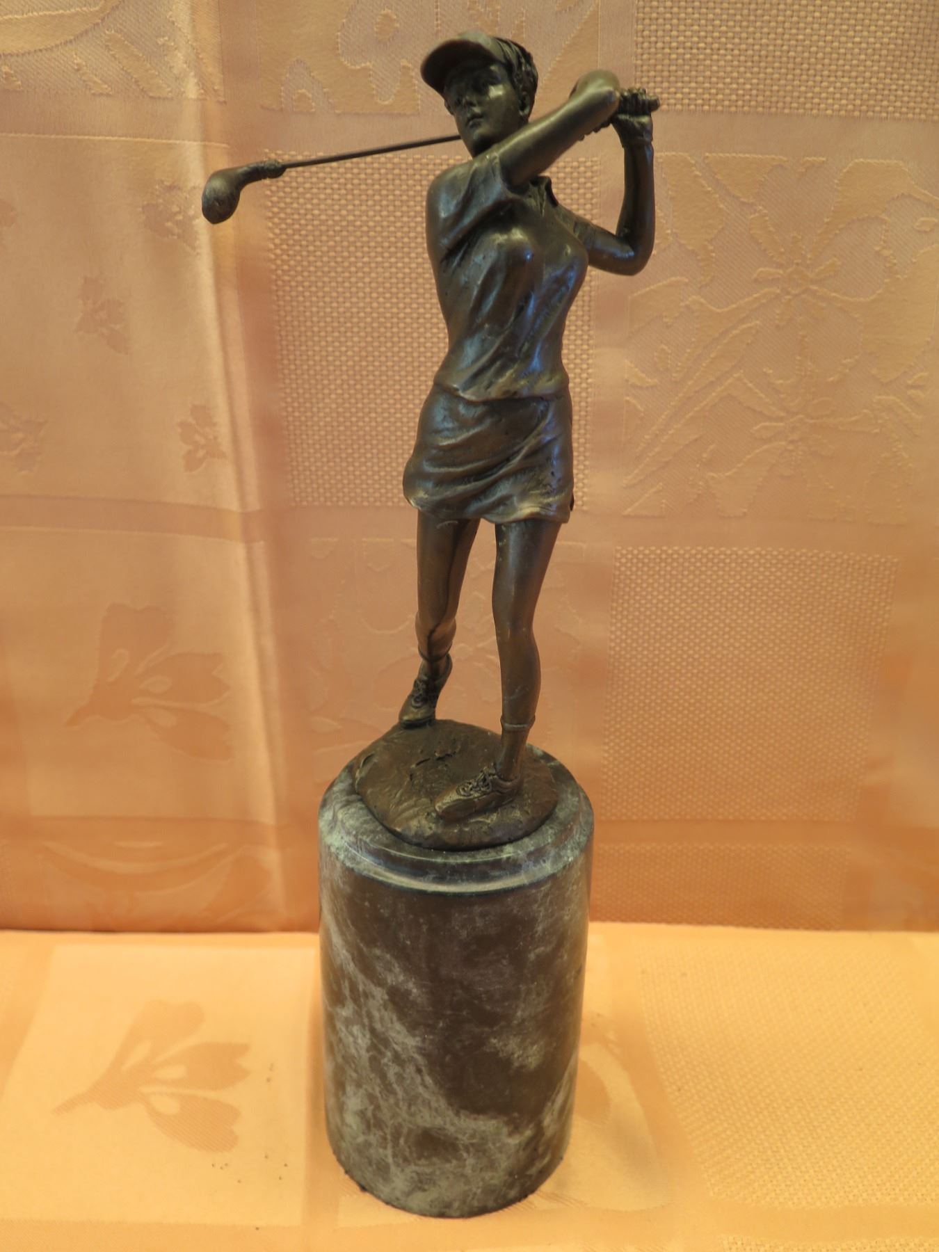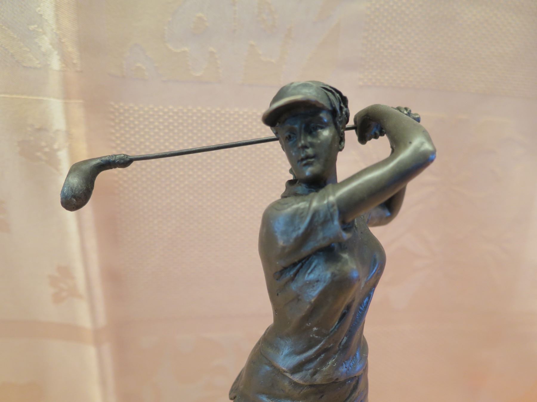 European Bronze Stamped Female Golfer Statue on Stone Base Signed "Milo" 12"H
