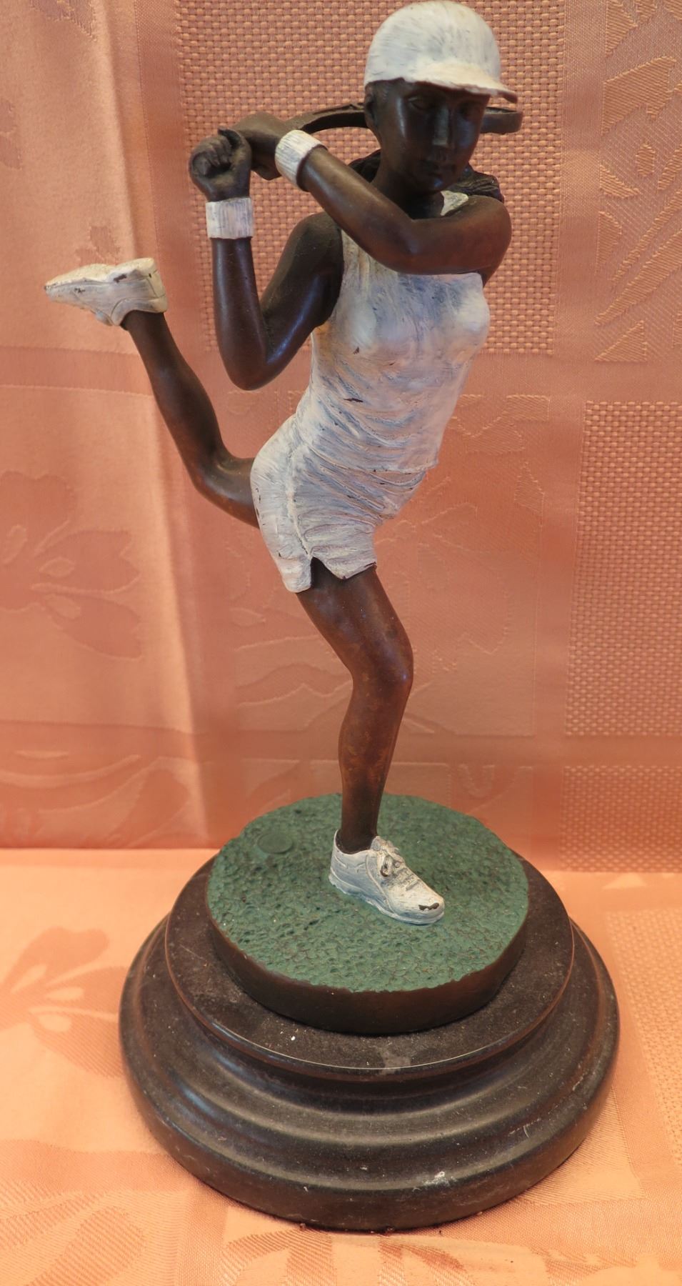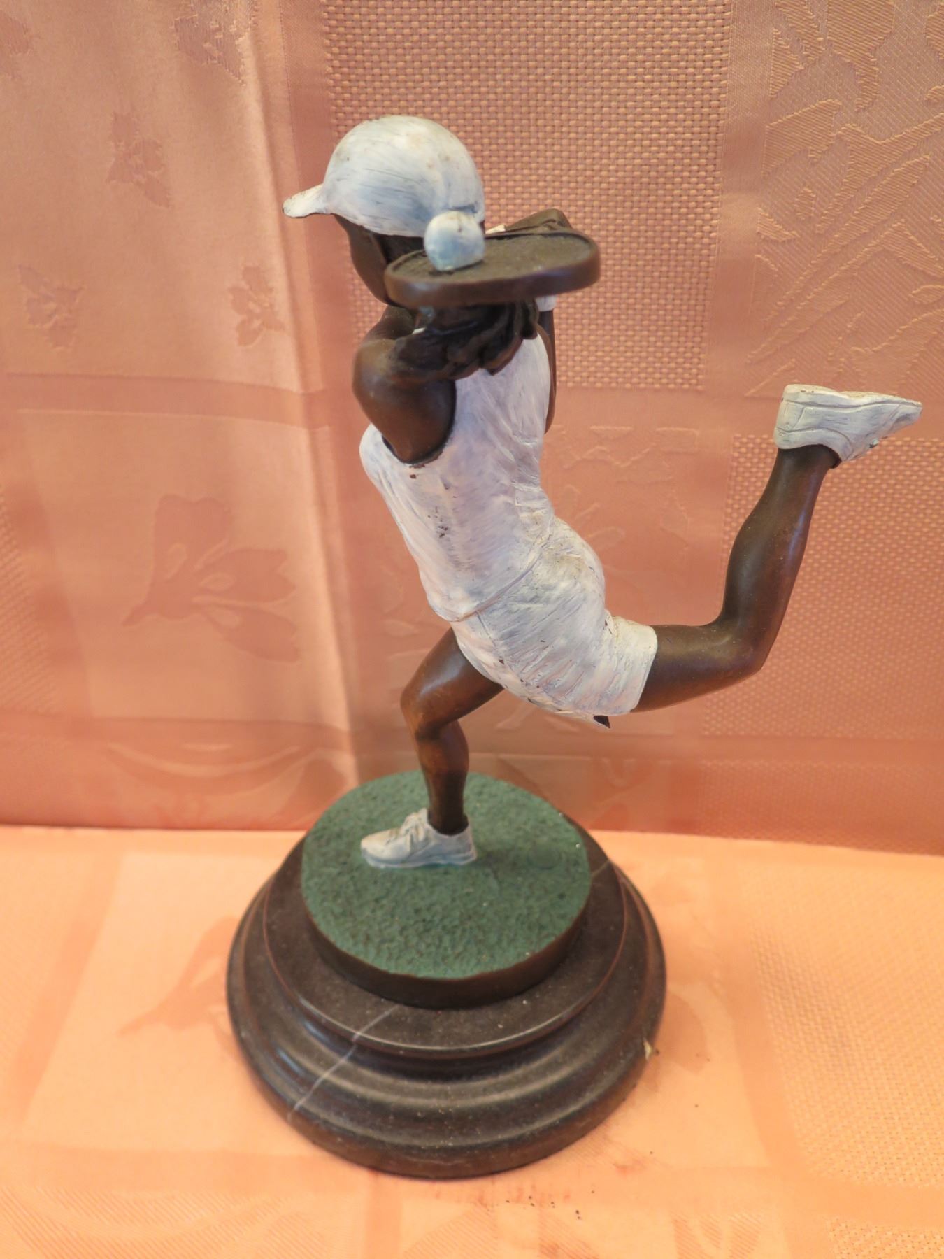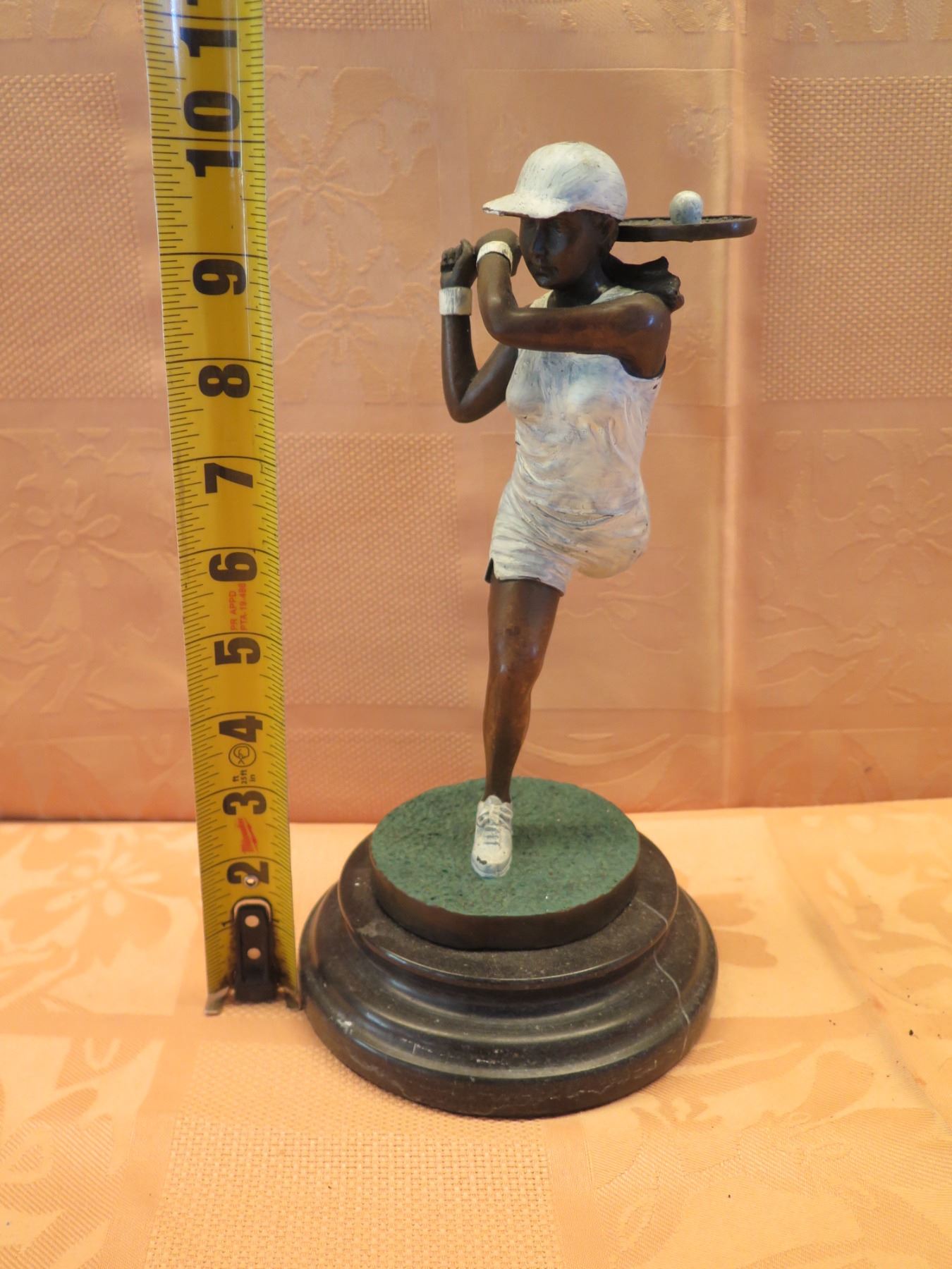 European Bronze Stamped Female Tennis Statue on Round Base 10"H