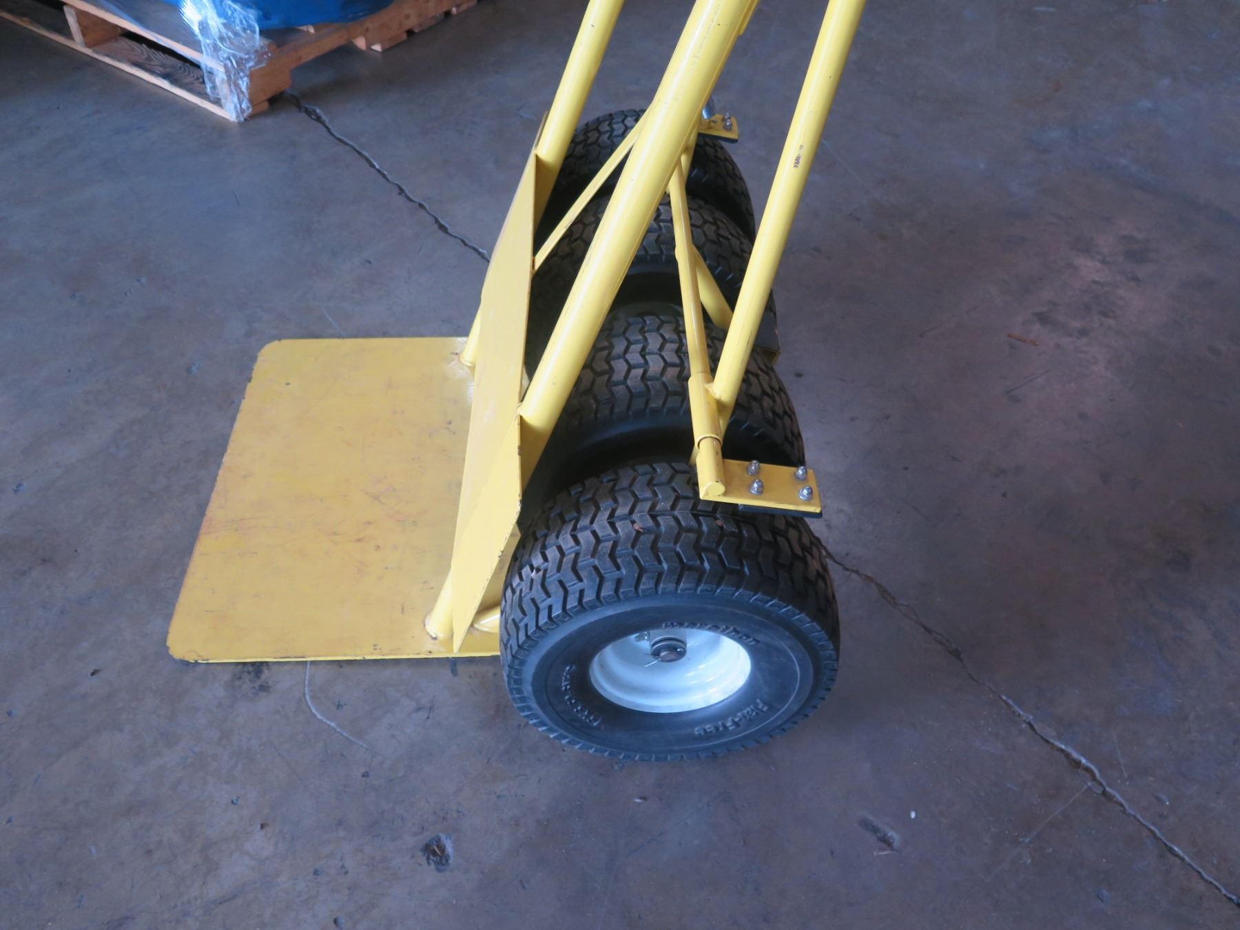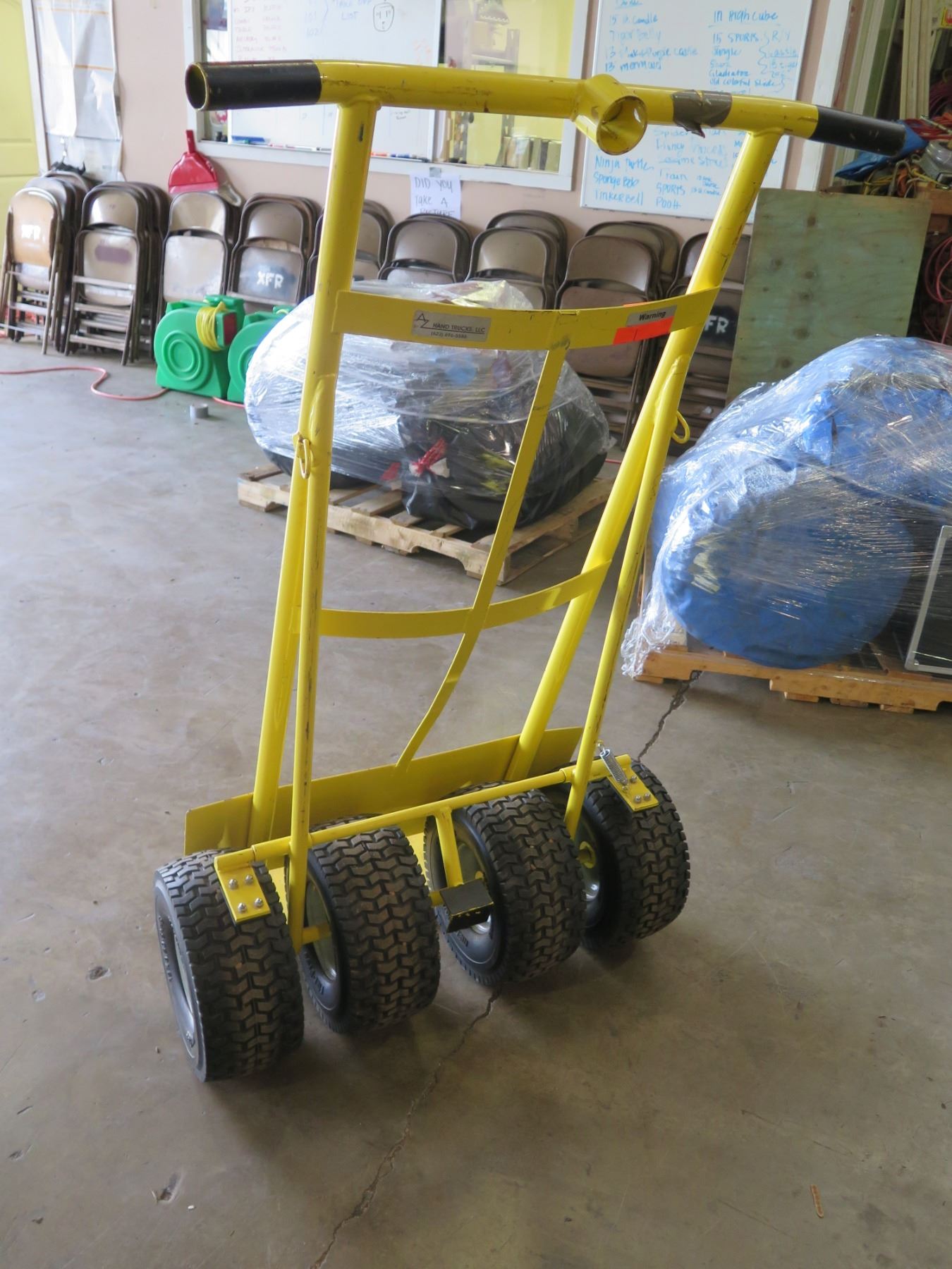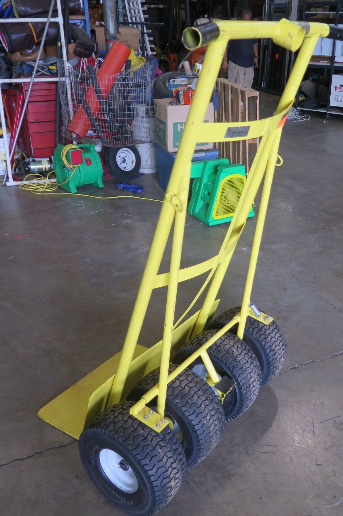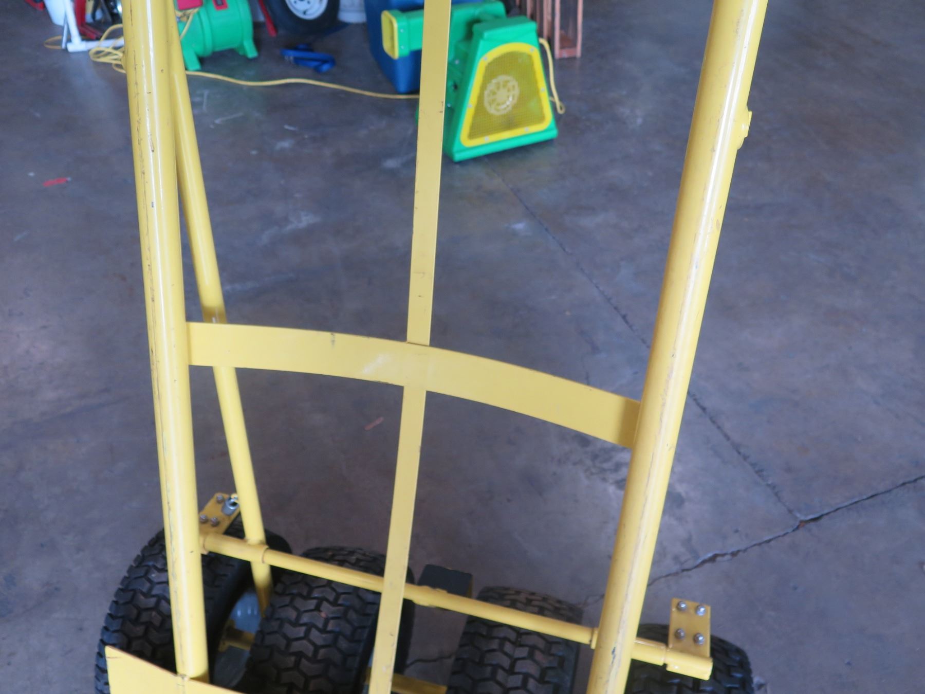 Extra large hand truck to haul big inflatables around. Made by AZ handtrucks. Four tires are solid. Foot pedal for break. Rings on each side to strap down inflatable.