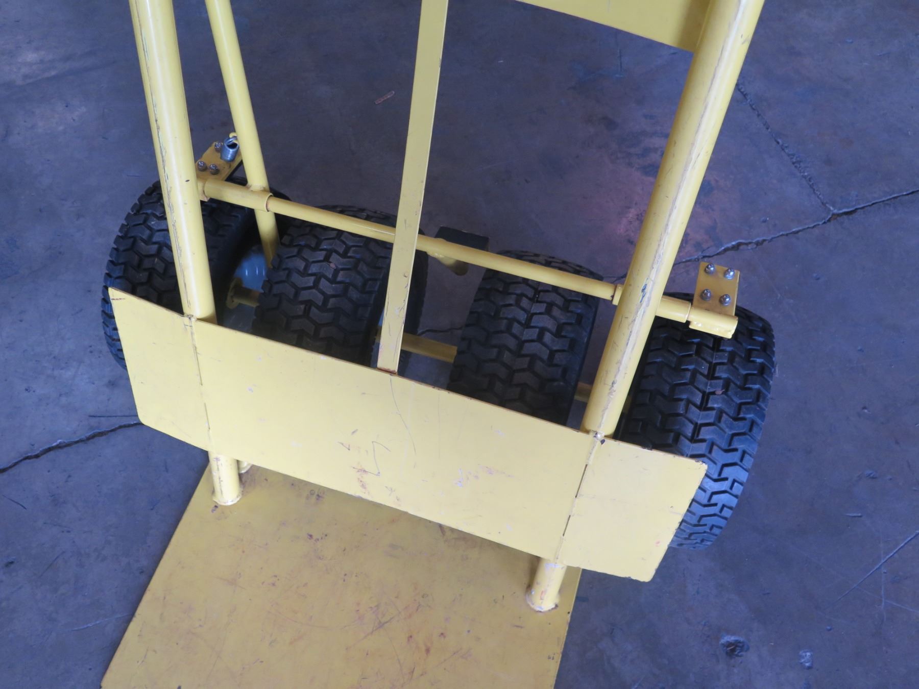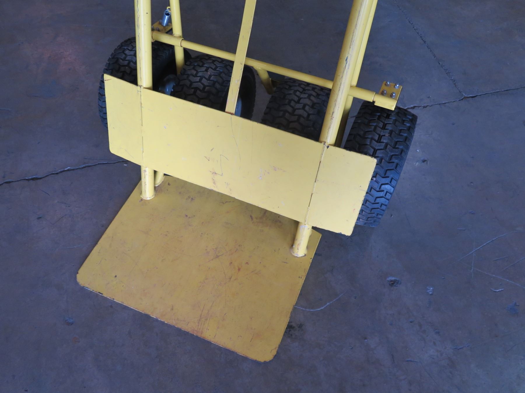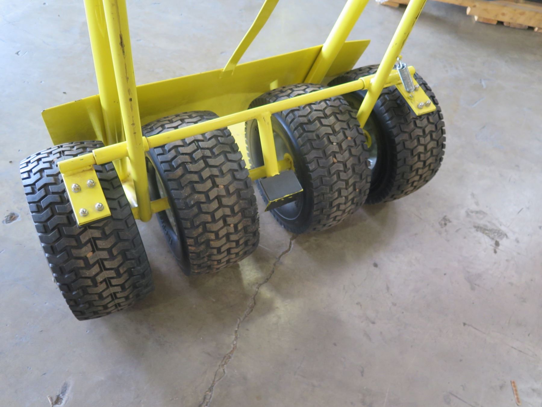 Extra large hand truck to haul big inflatables around. Made by AZ handtrucks. Four tires are solid. Foot pedal for break. Rings on each side to strap down inflatable.