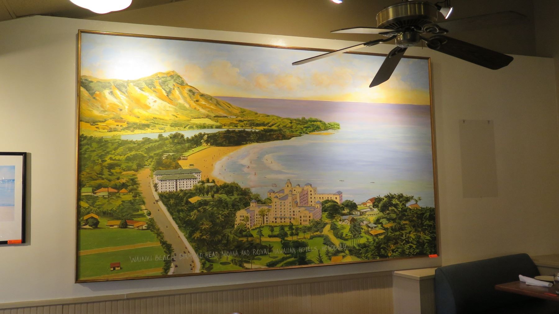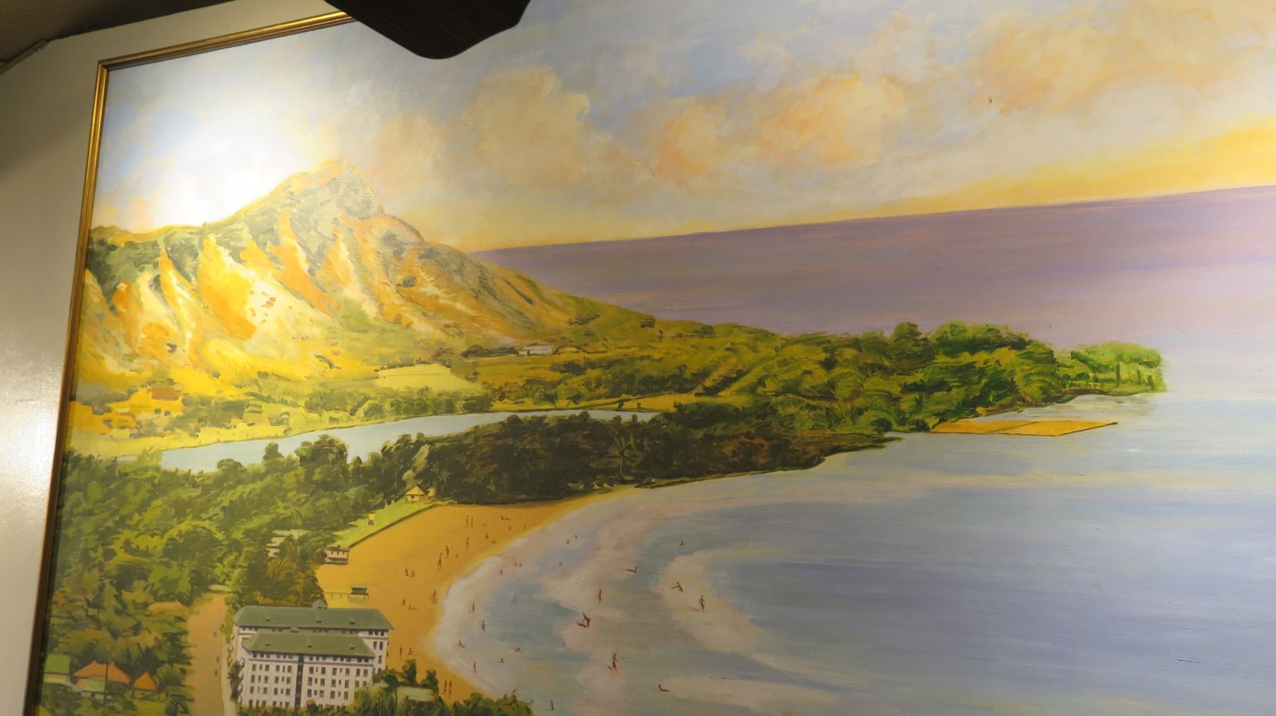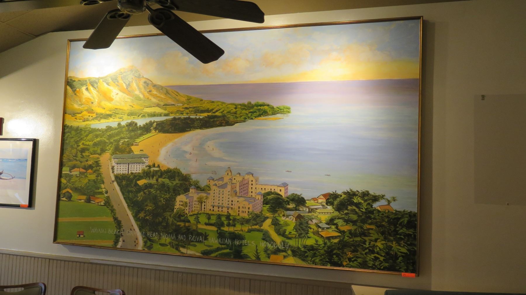 Extremely Large Acrylic Painting, Diamond Head/Waikiki, 121.5" x 73", Captioned "Waikiki Beach, Diam