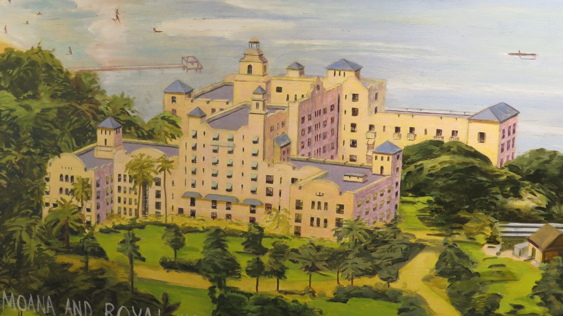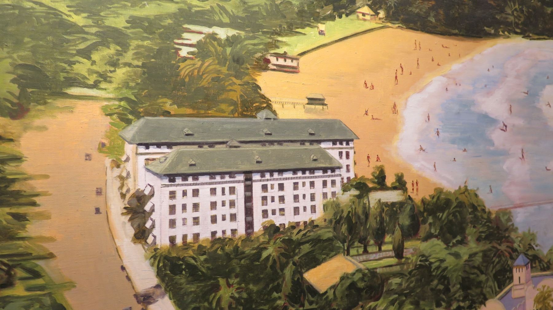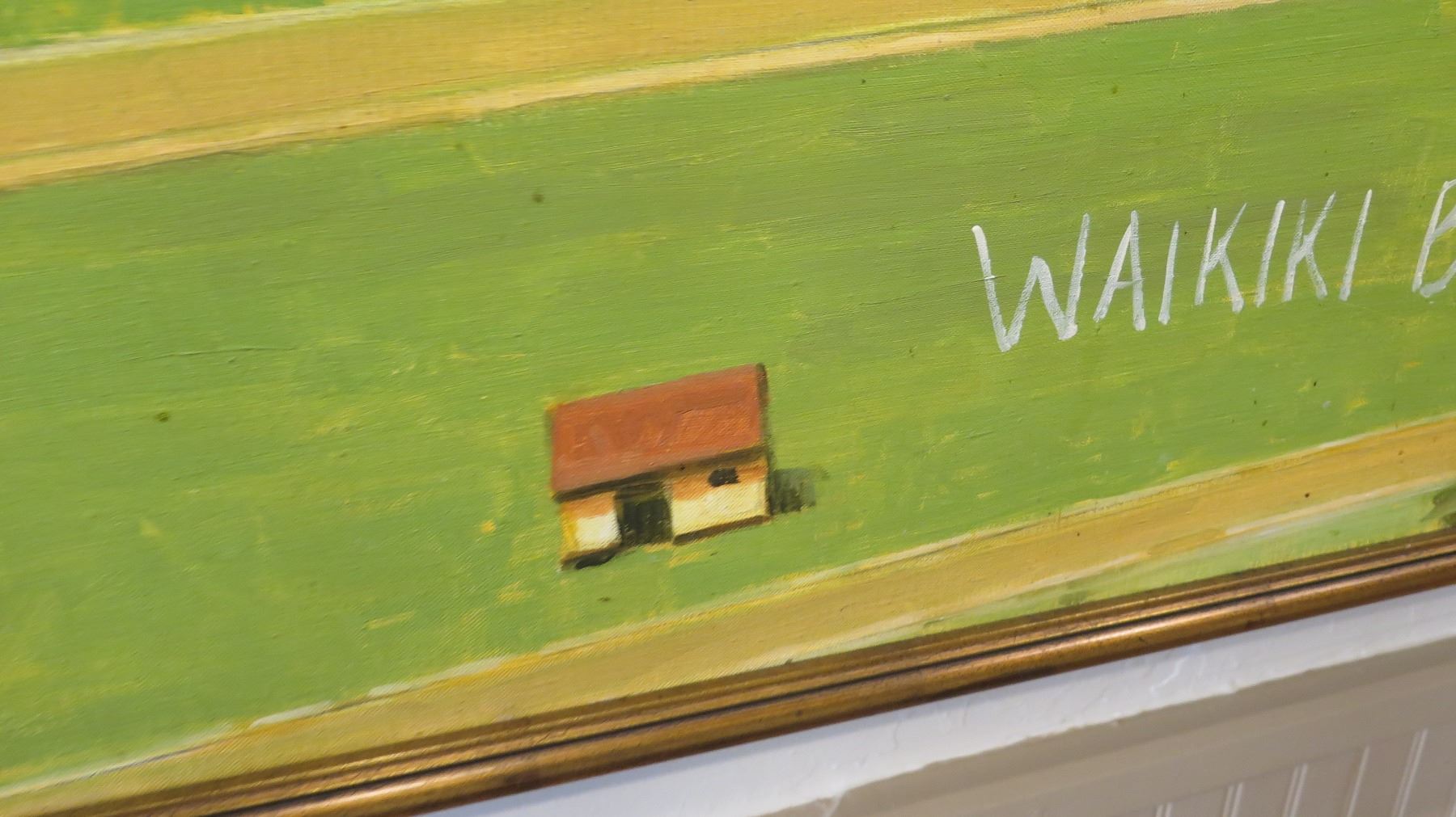 Extremely Large Acrylic Painting, Diamond Head/Waikiki, 121.5" x 73", Captioned "Waikiki Beach, Diam