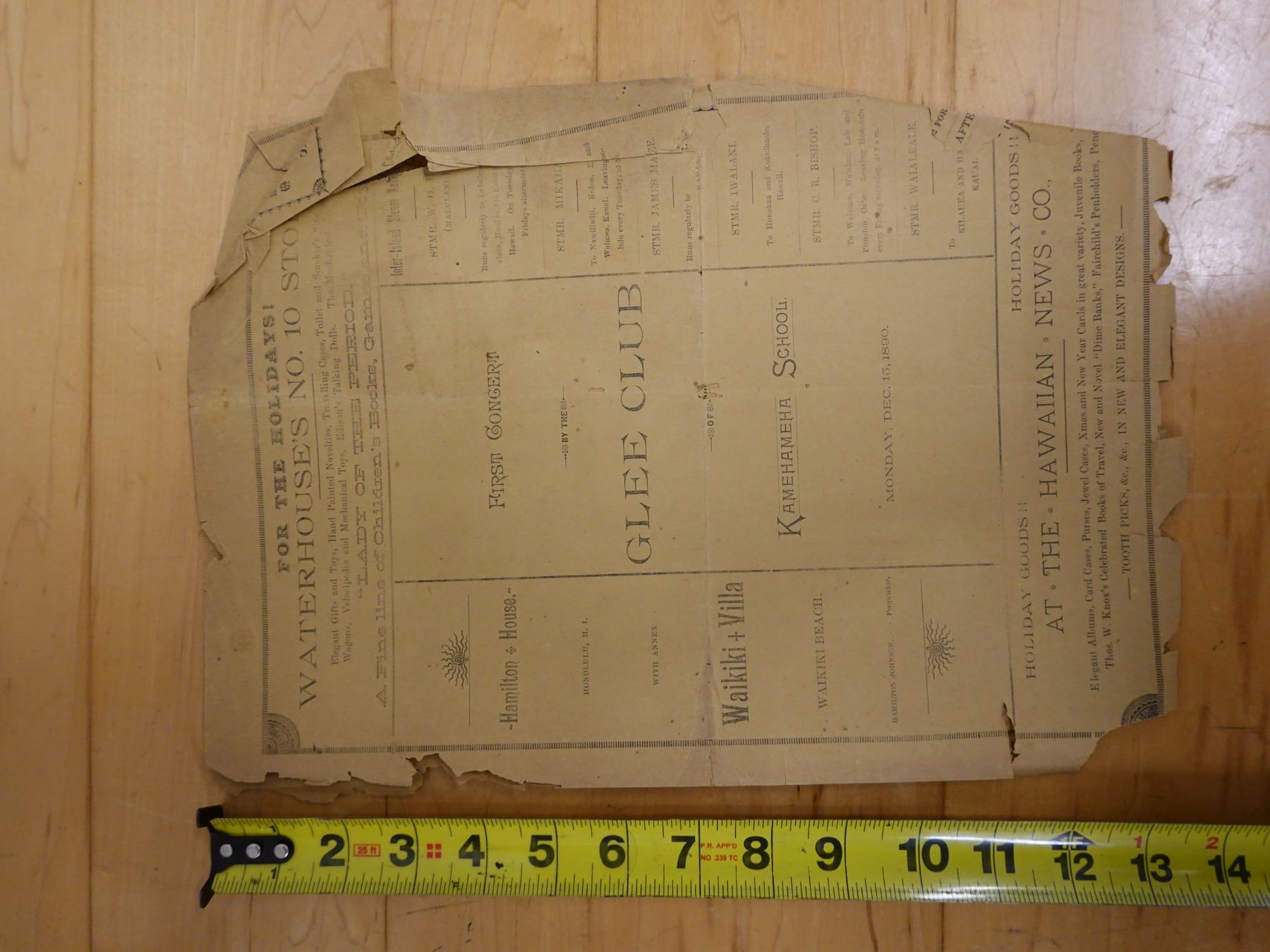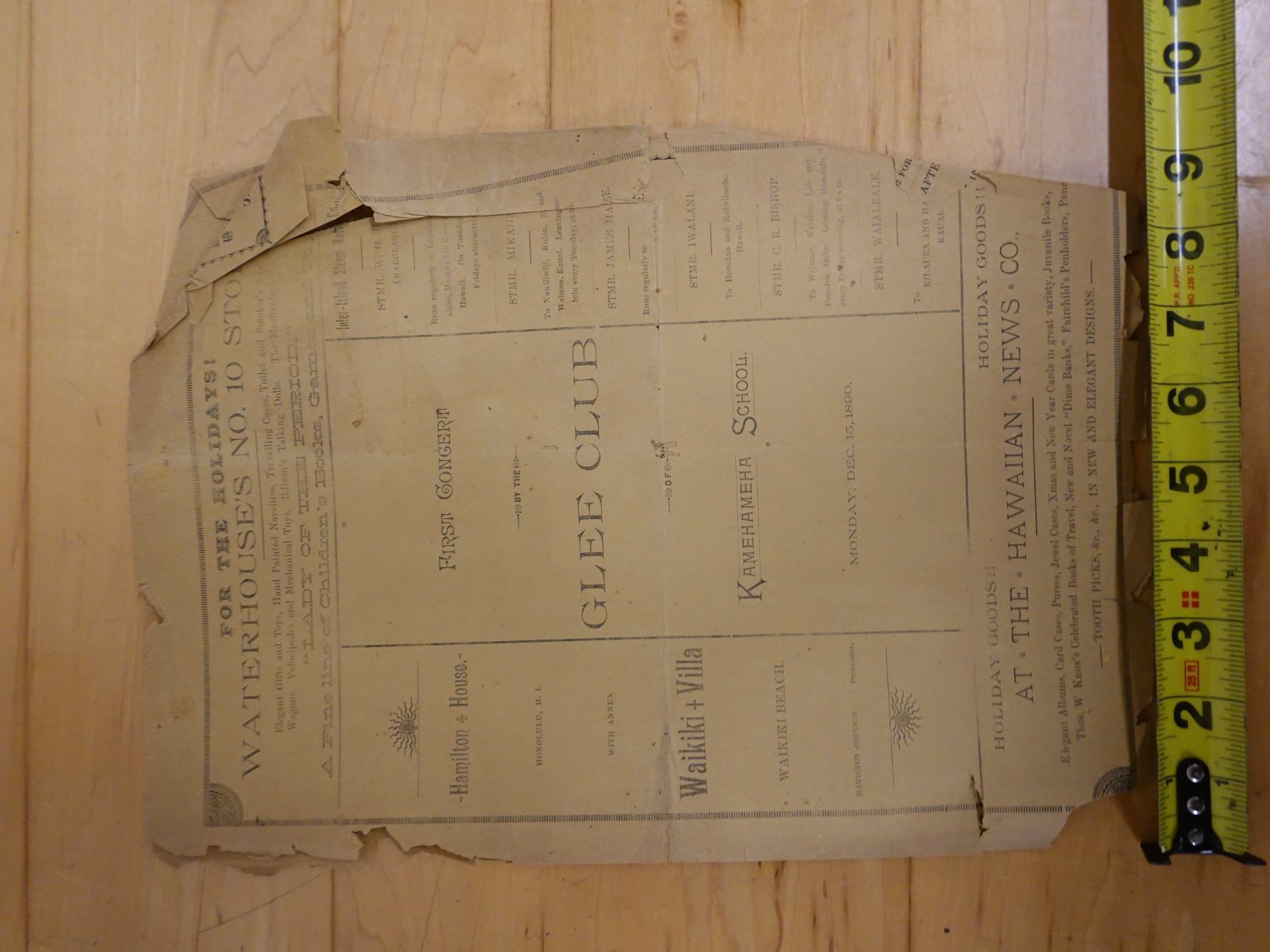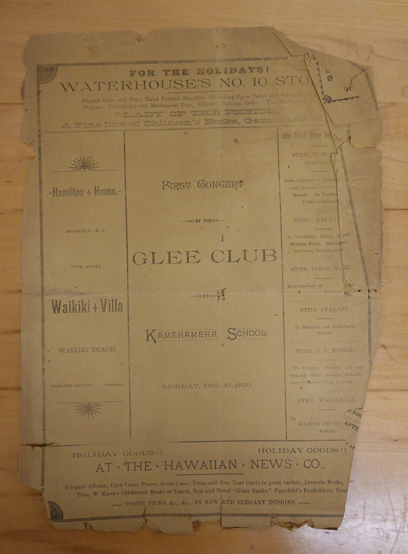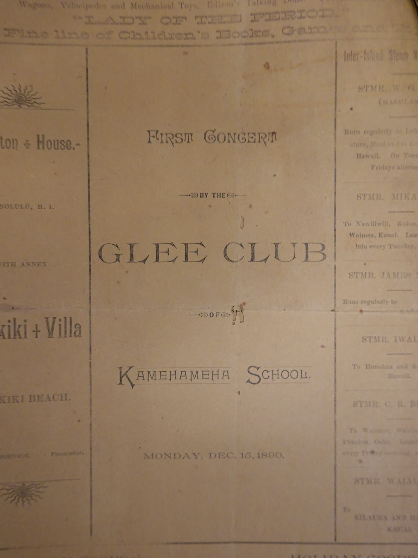 First Concert by the Glee Club of Kamehameha Schools Newsletter 12/15/1890, 9" x 13"