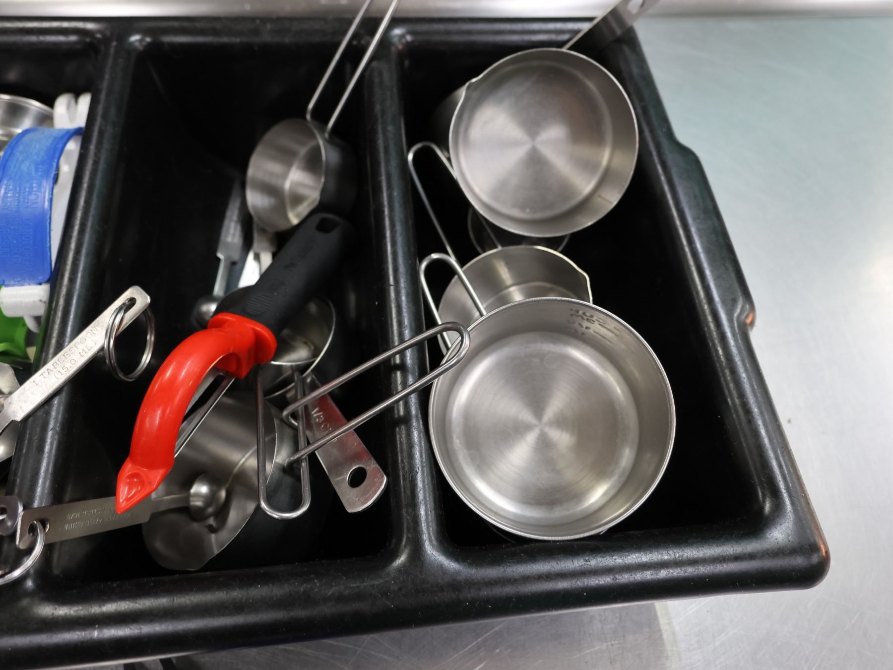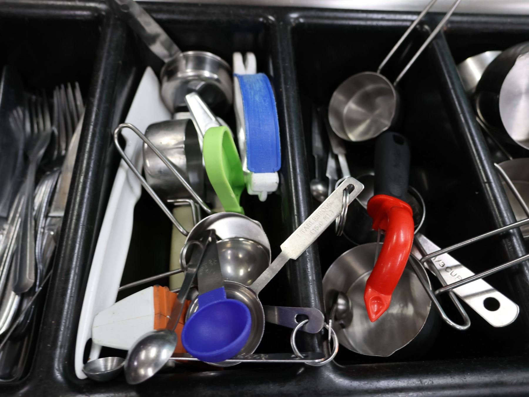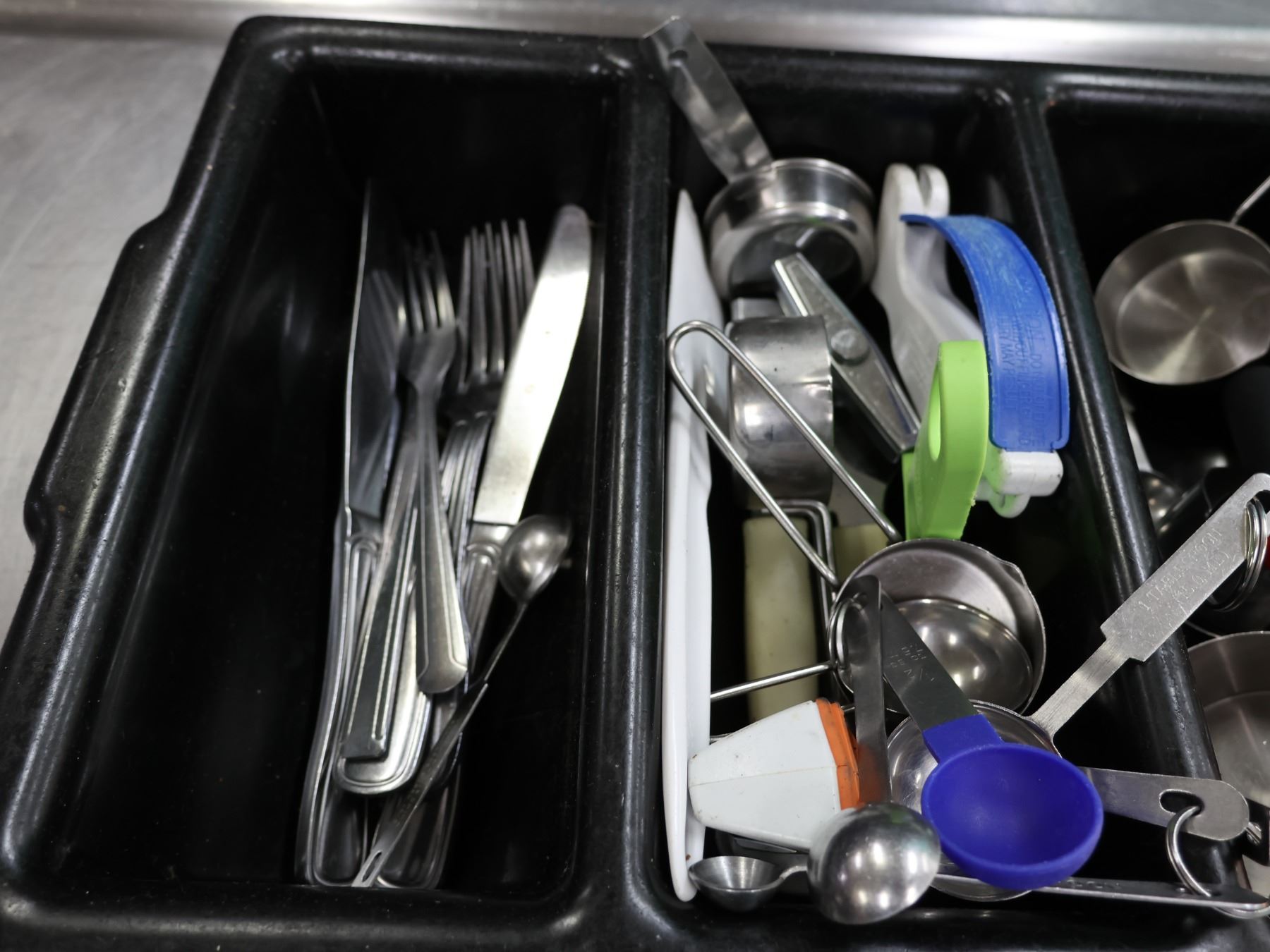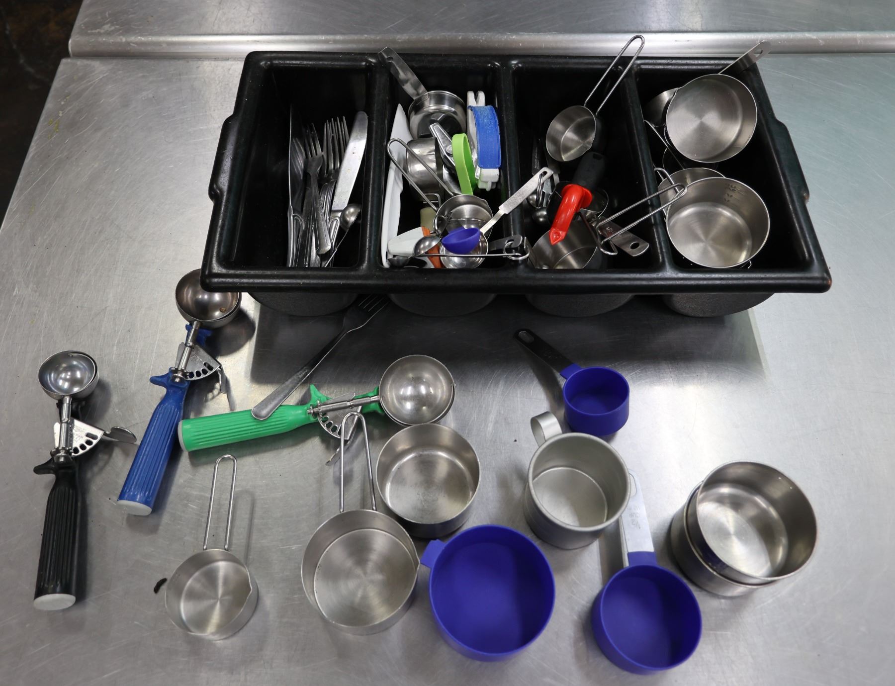 Flatware Caddy w/ Multiple Forks & Knives, Metal Measuring Cups, Ice Cream Scoops, etc.