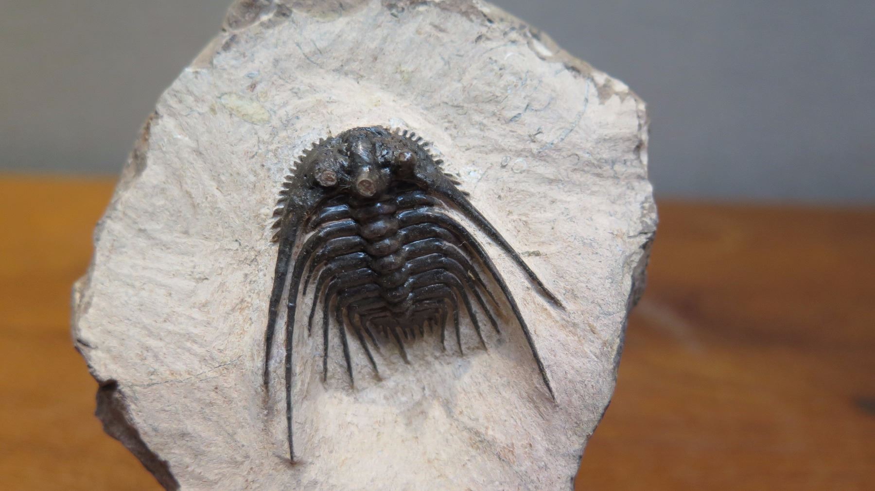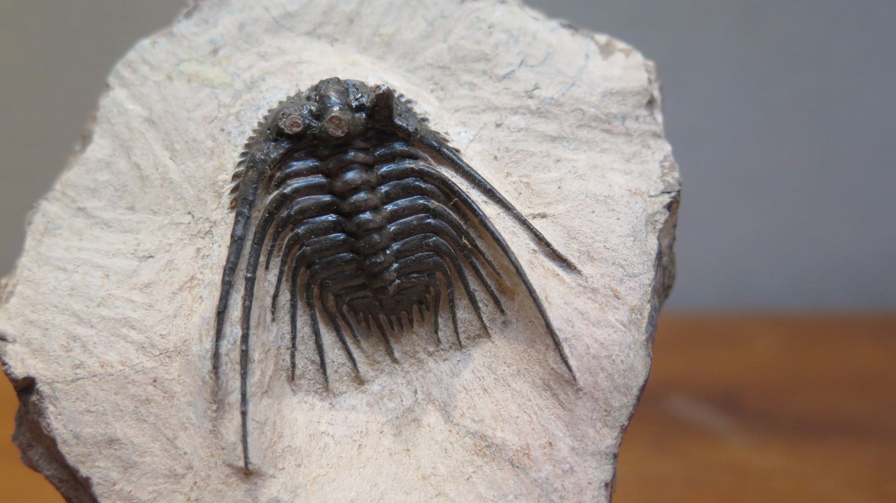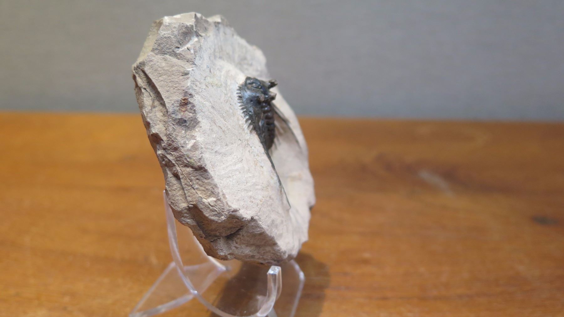 Fossil: Black Trilobite (Acidaspis?, circa 450 mil yrs), 3-D w/ Partially Embedded in Limestone