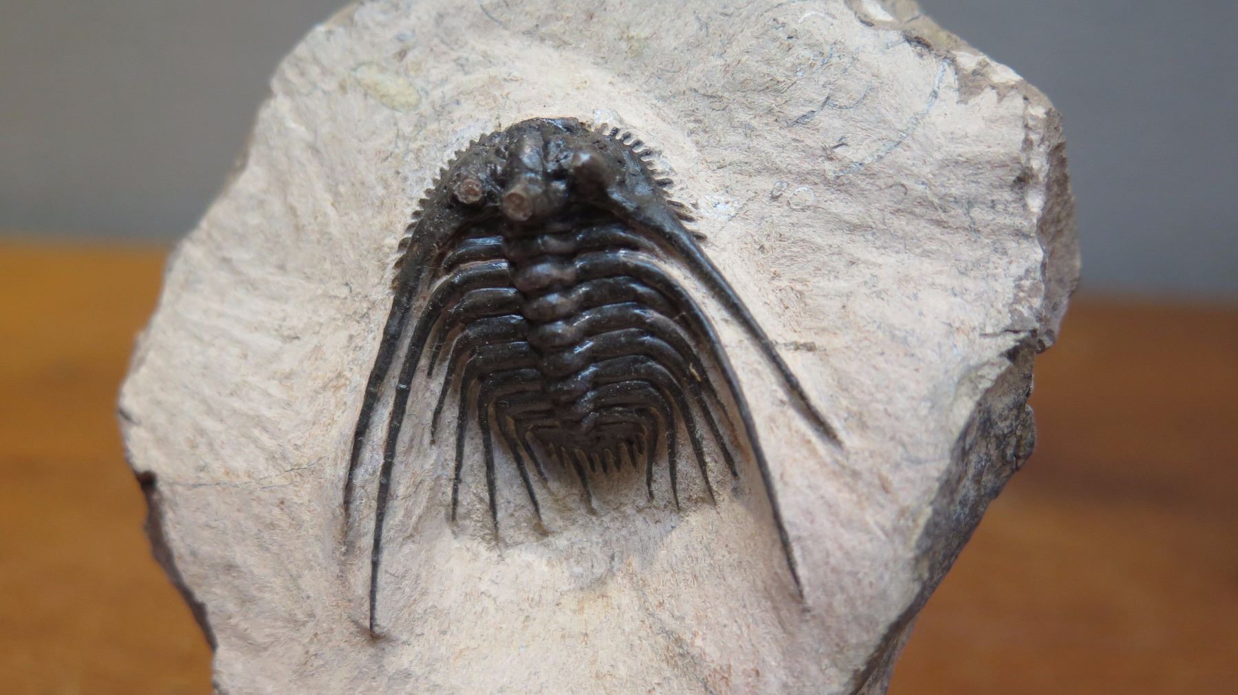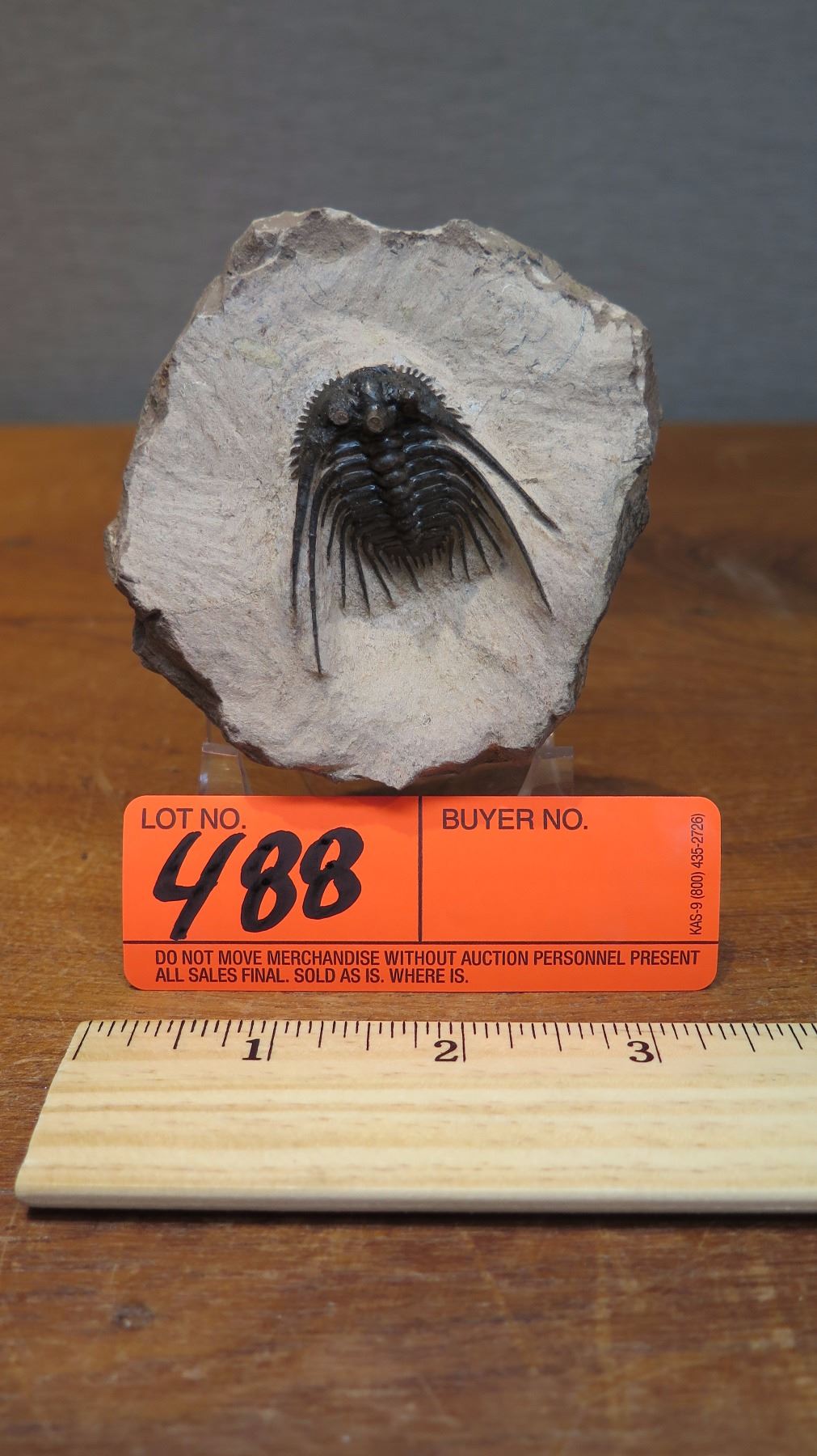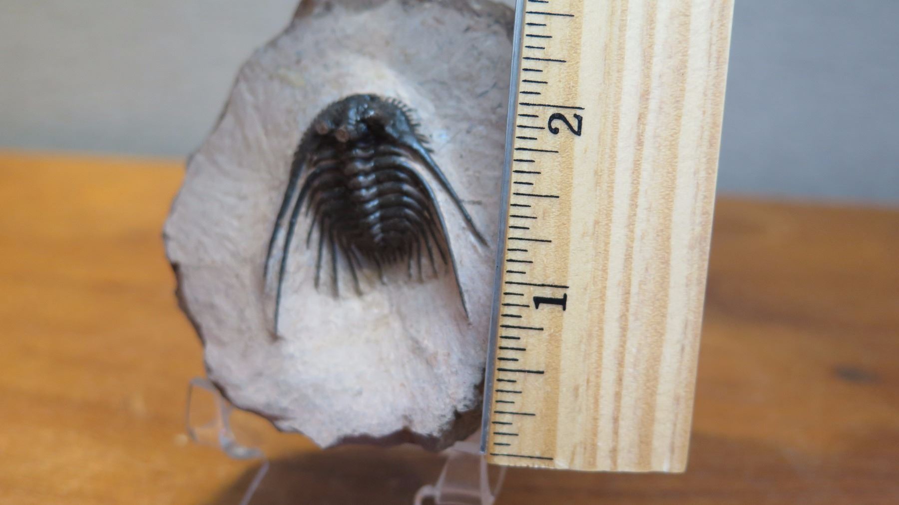Fossil: Black Trilobite (Acidaspis?, circa 450 mil yrs), 3-D w/ Partially Embedded in Limestone