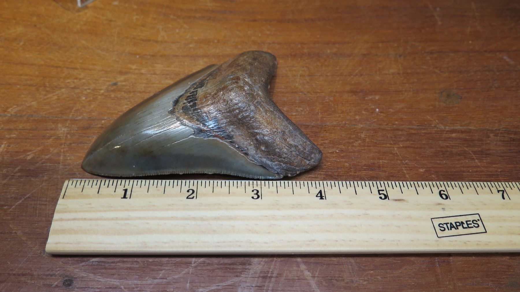 Fossil: Megalodon Tooth w/Barnacle Growth, from Megalodon Shark, (extinct 2.6 mil yrs ago)