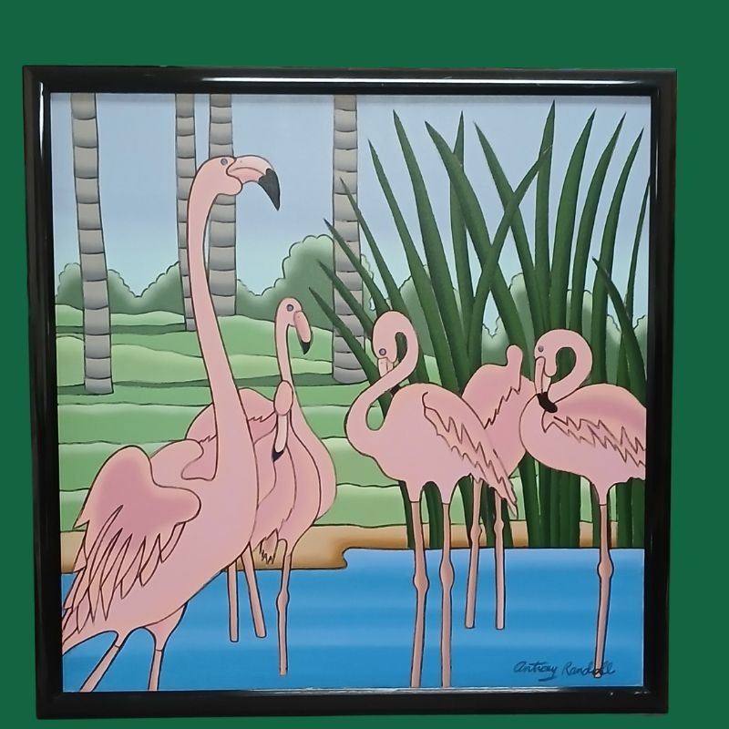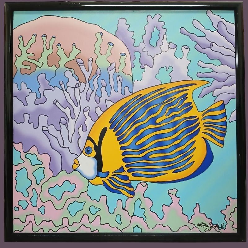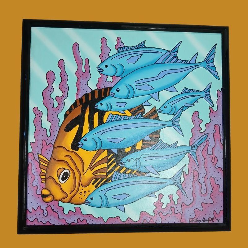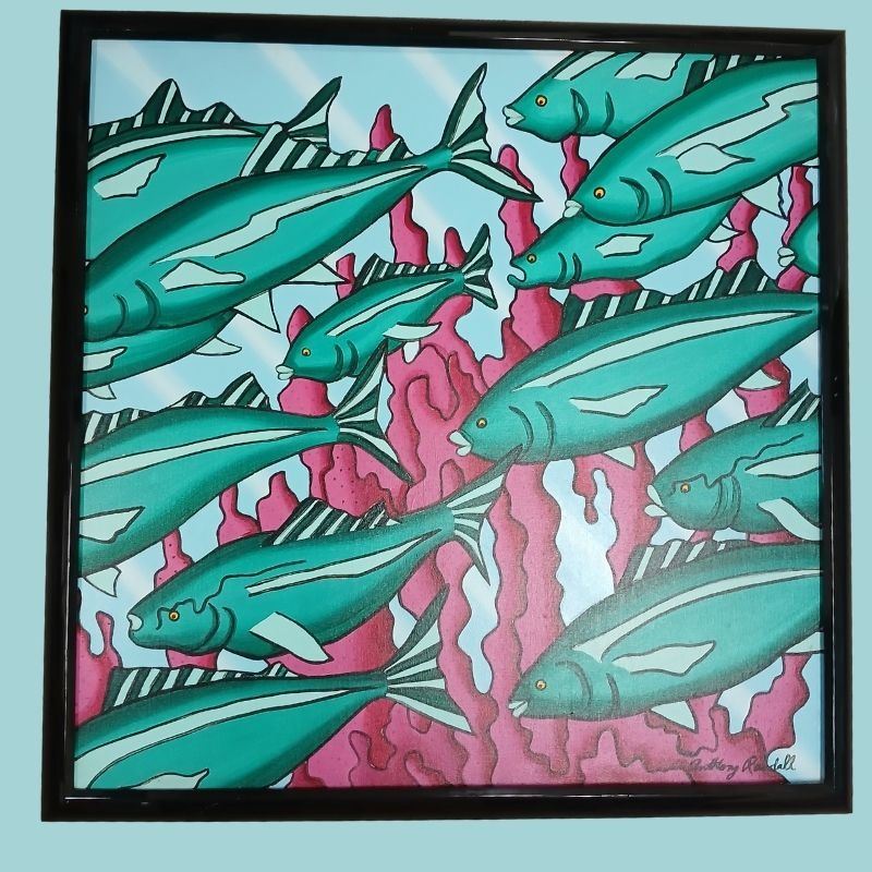 40" x 40" Fish-themed Acrylic Paintings with 2" half-round black acrylic frames. Frames show slight wear.