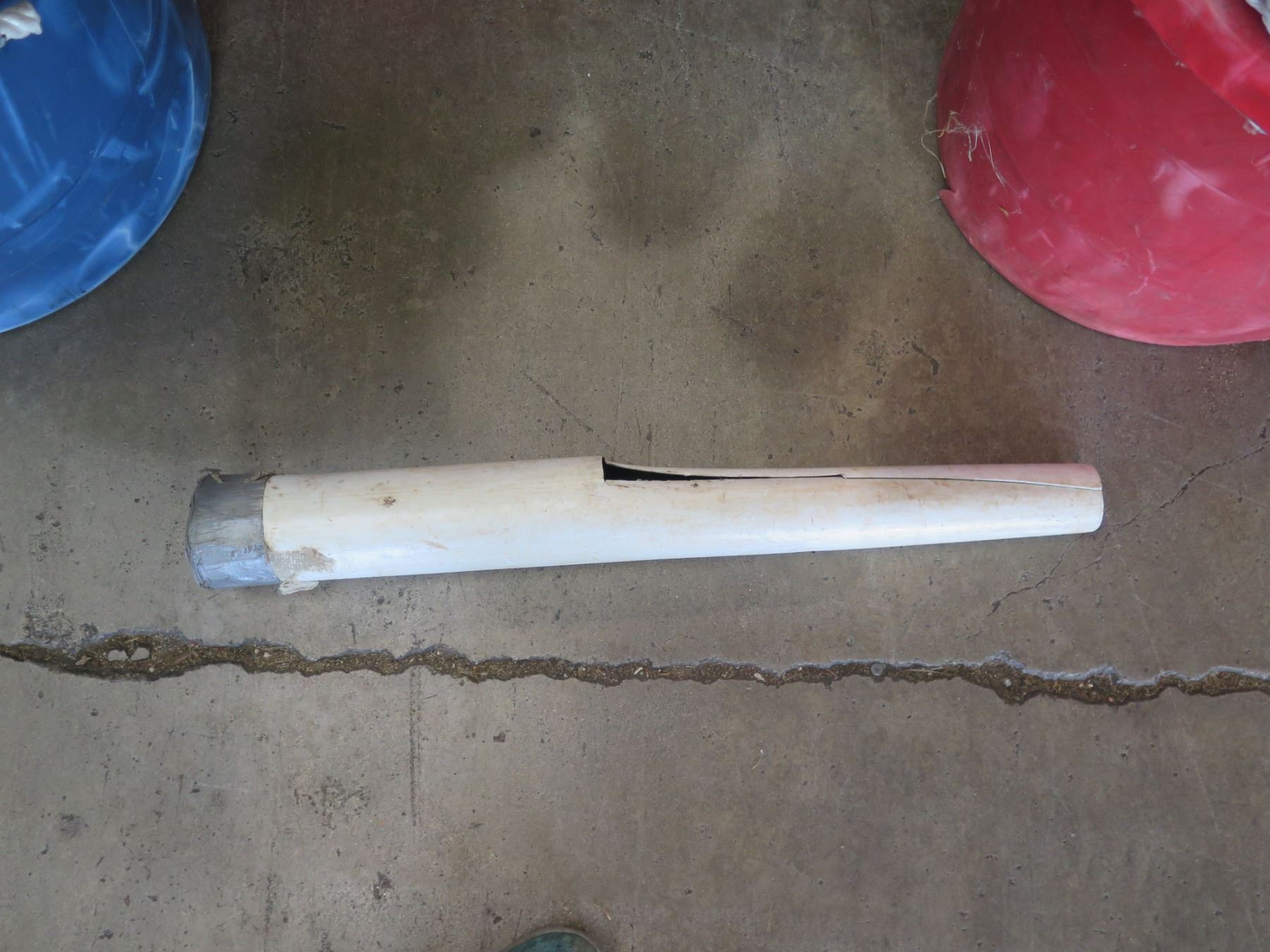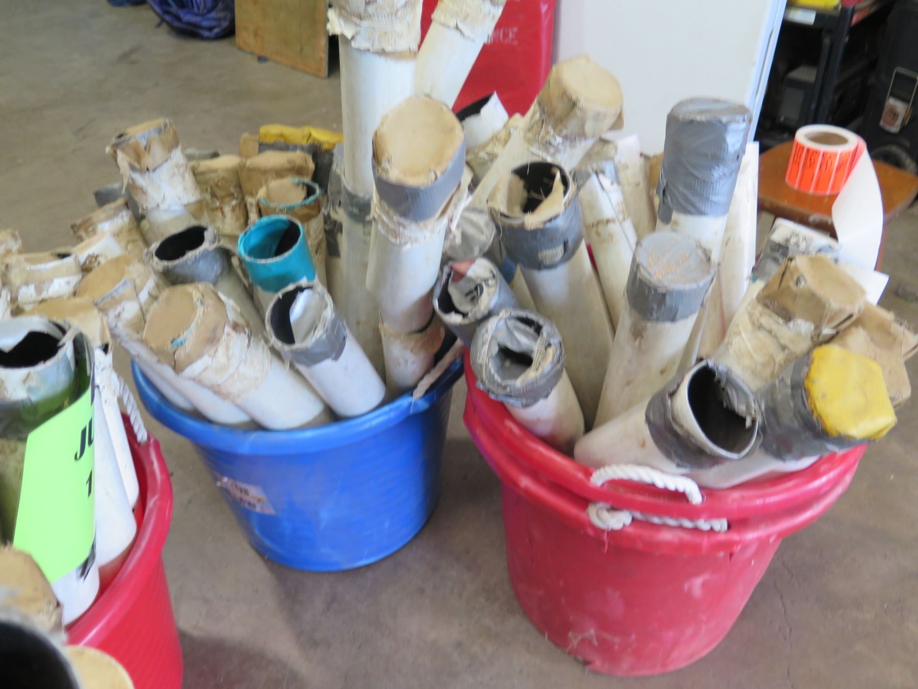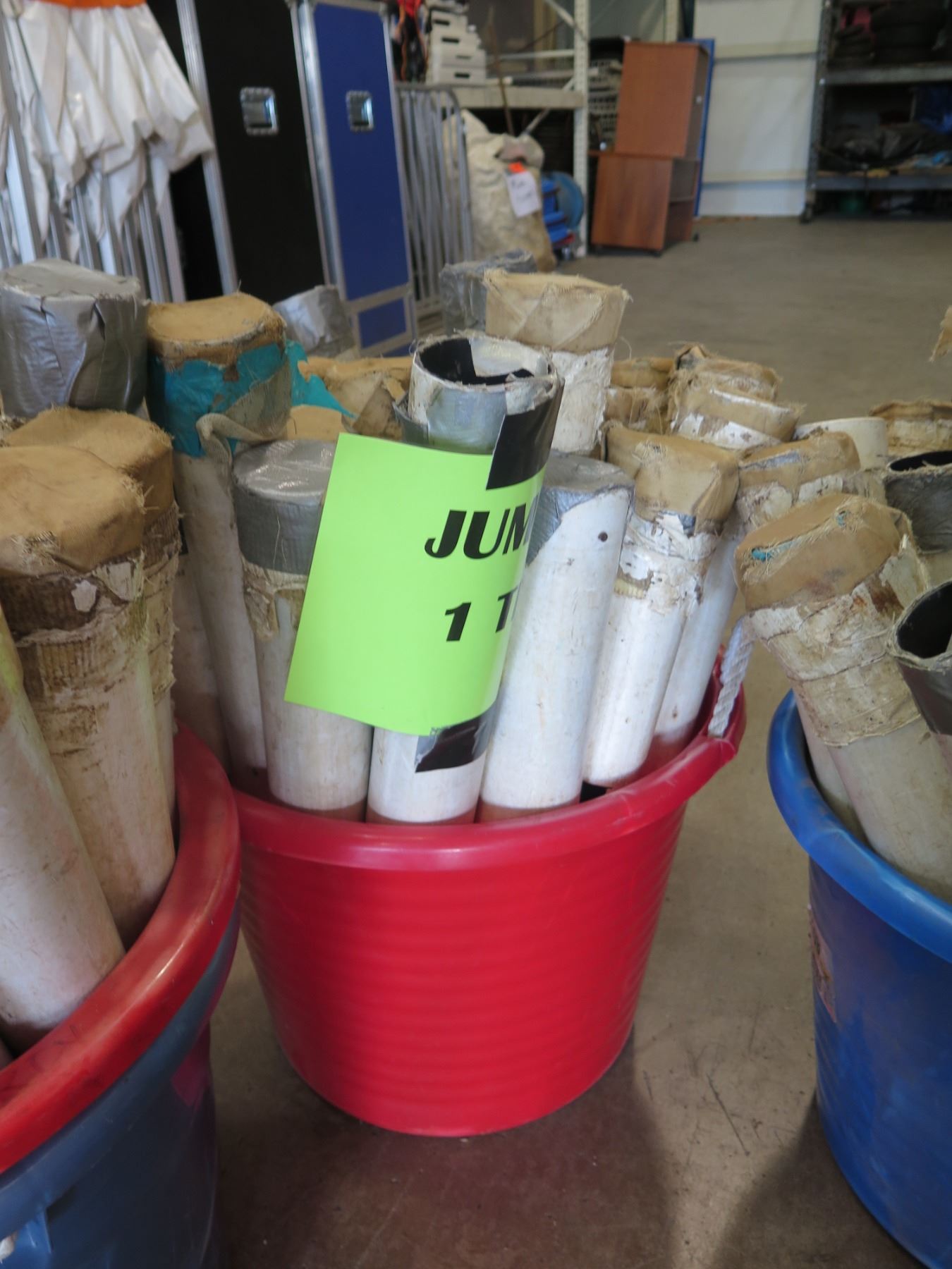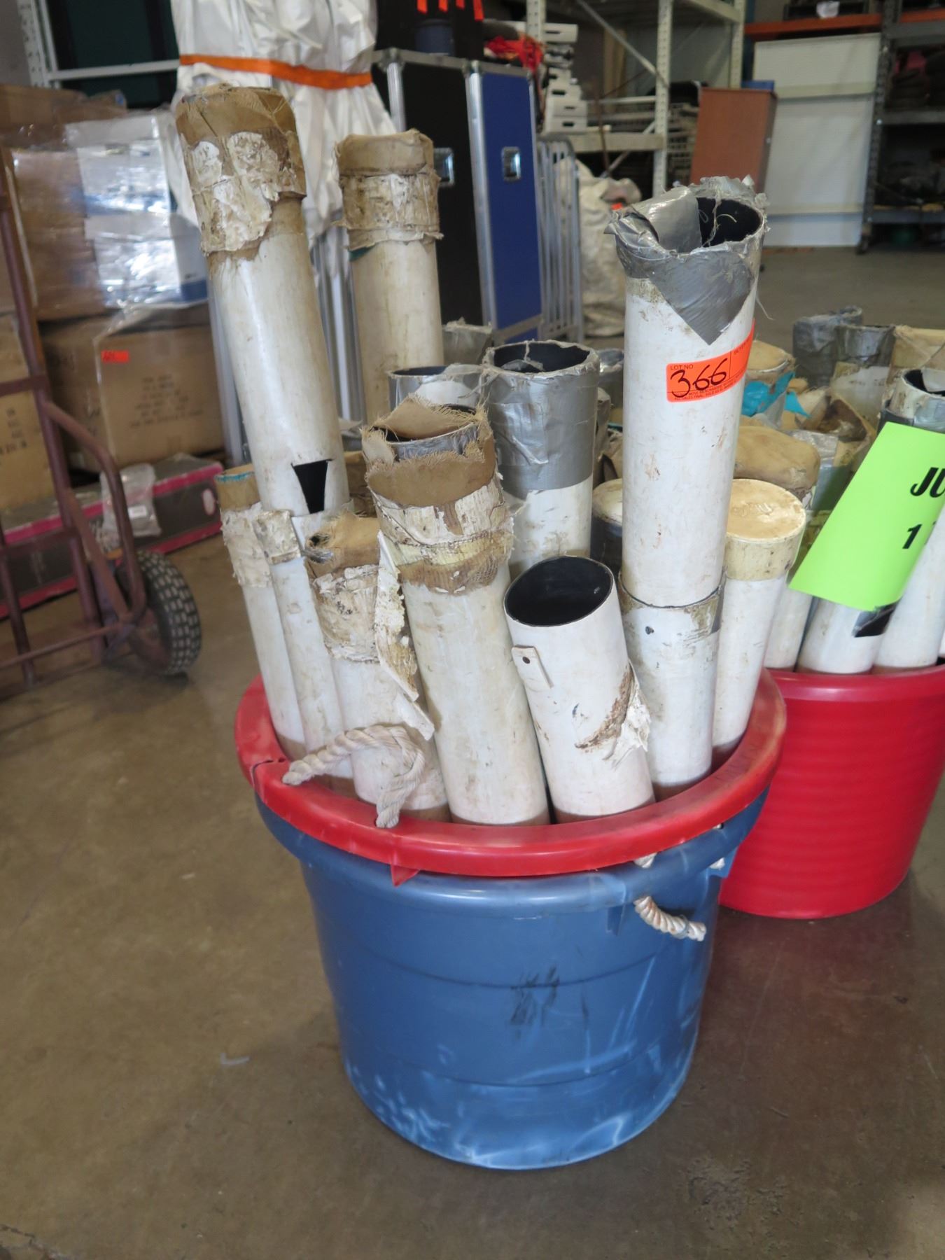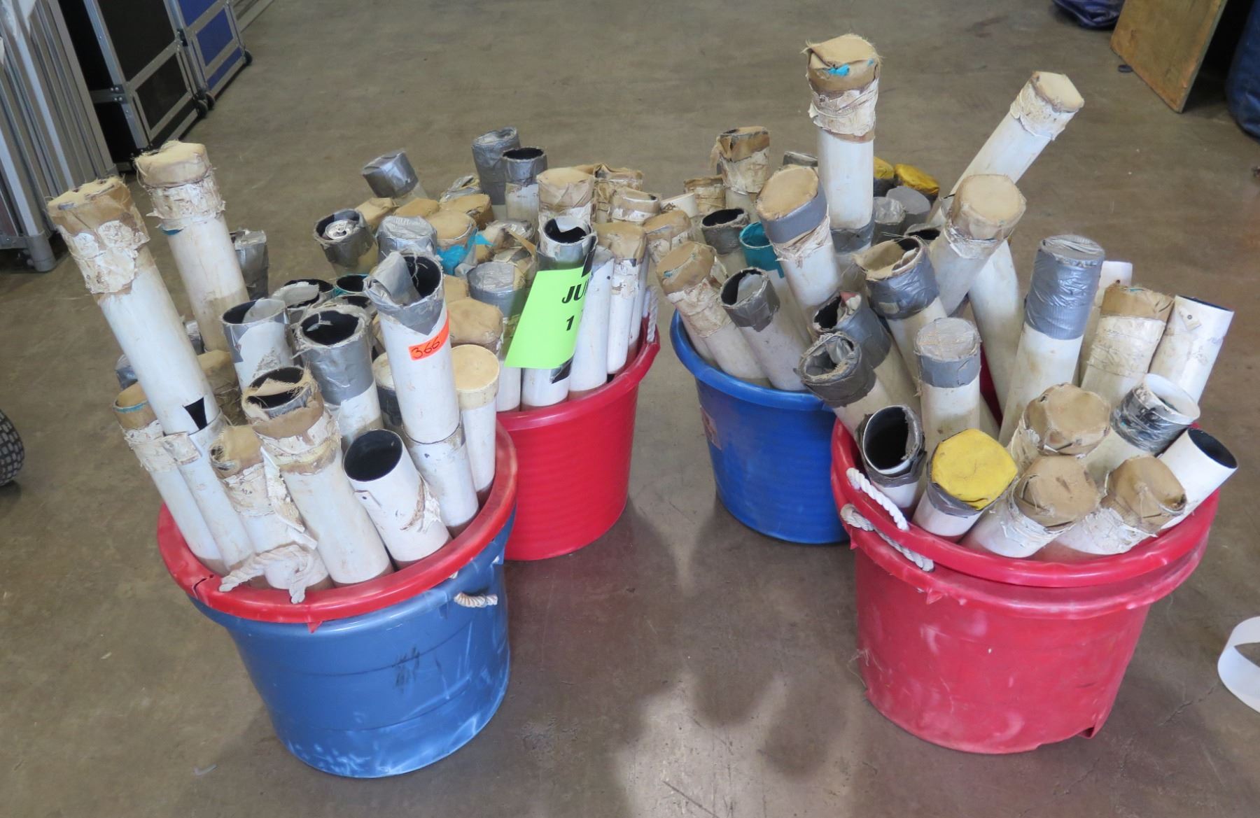 Four buckets of PVC Stake covers. Some have cuts to allow tie downs to fit on the cover. Used by inflatable rental companies to protect from injuries.