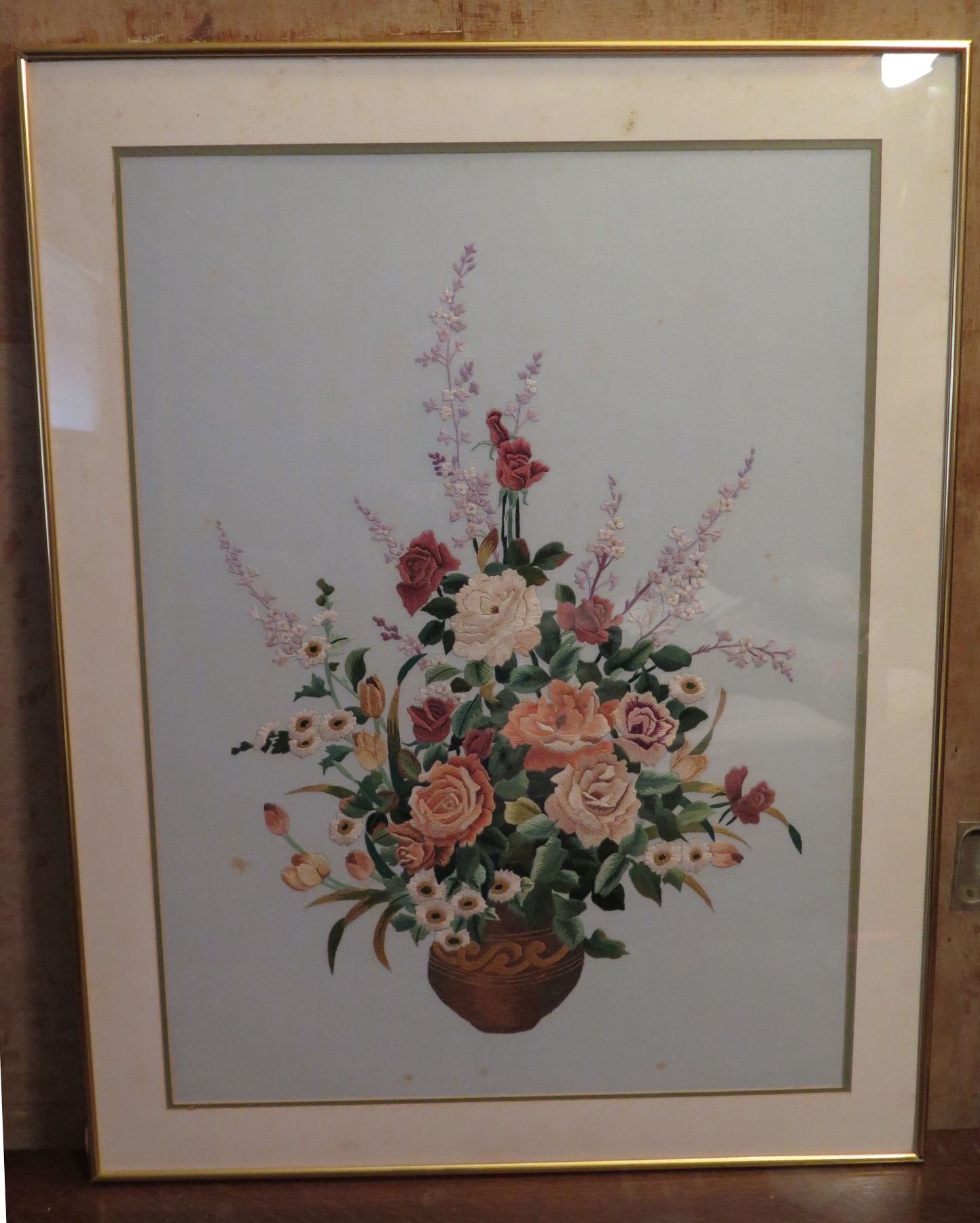 Framed Art, Embroidery Floral Basket Orange/Pink/Red/Green 25" x 32" (Some Stains)