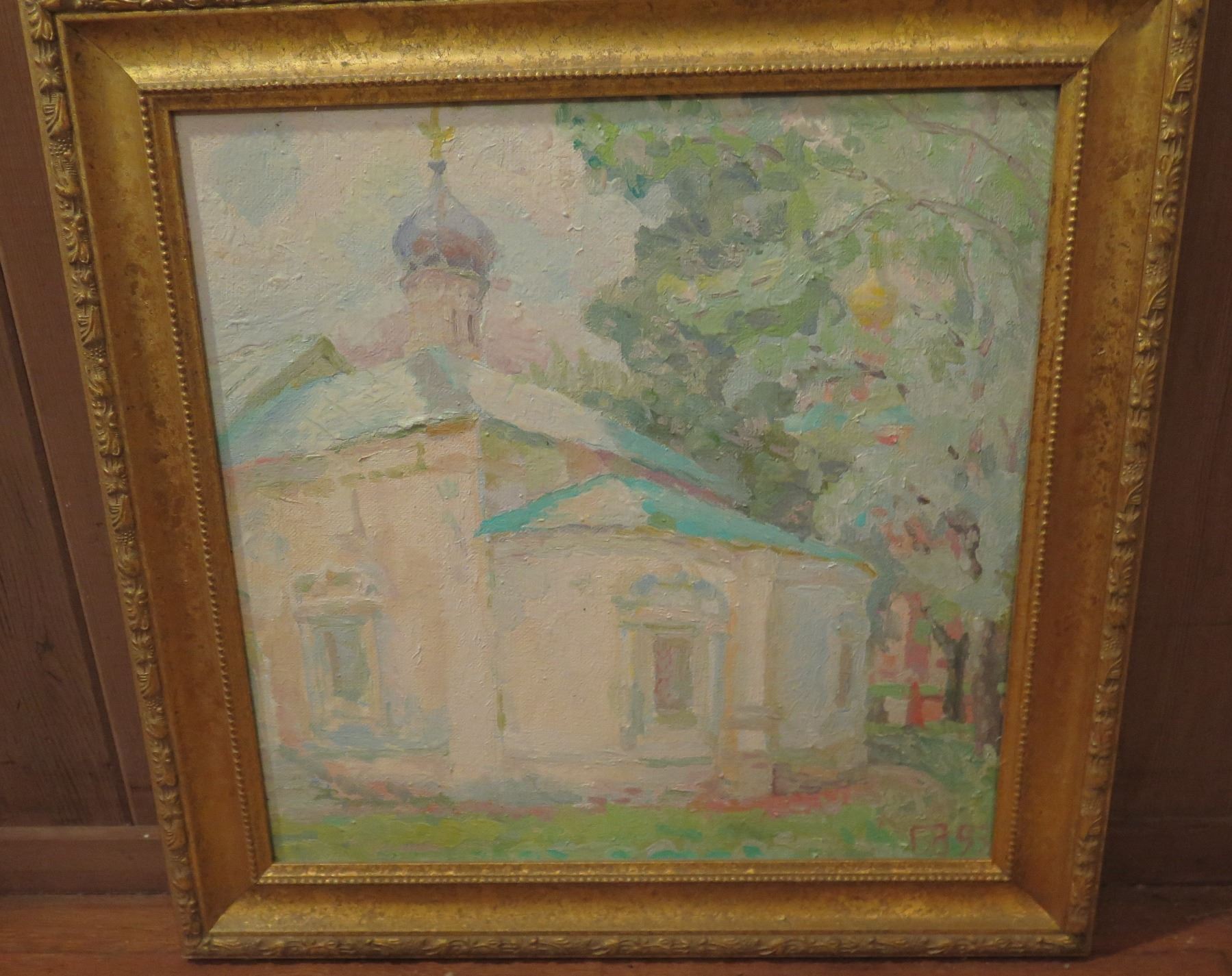 Framed Art, Landscape Painting, Temple White/Green Signed 19.5" x 19.25"