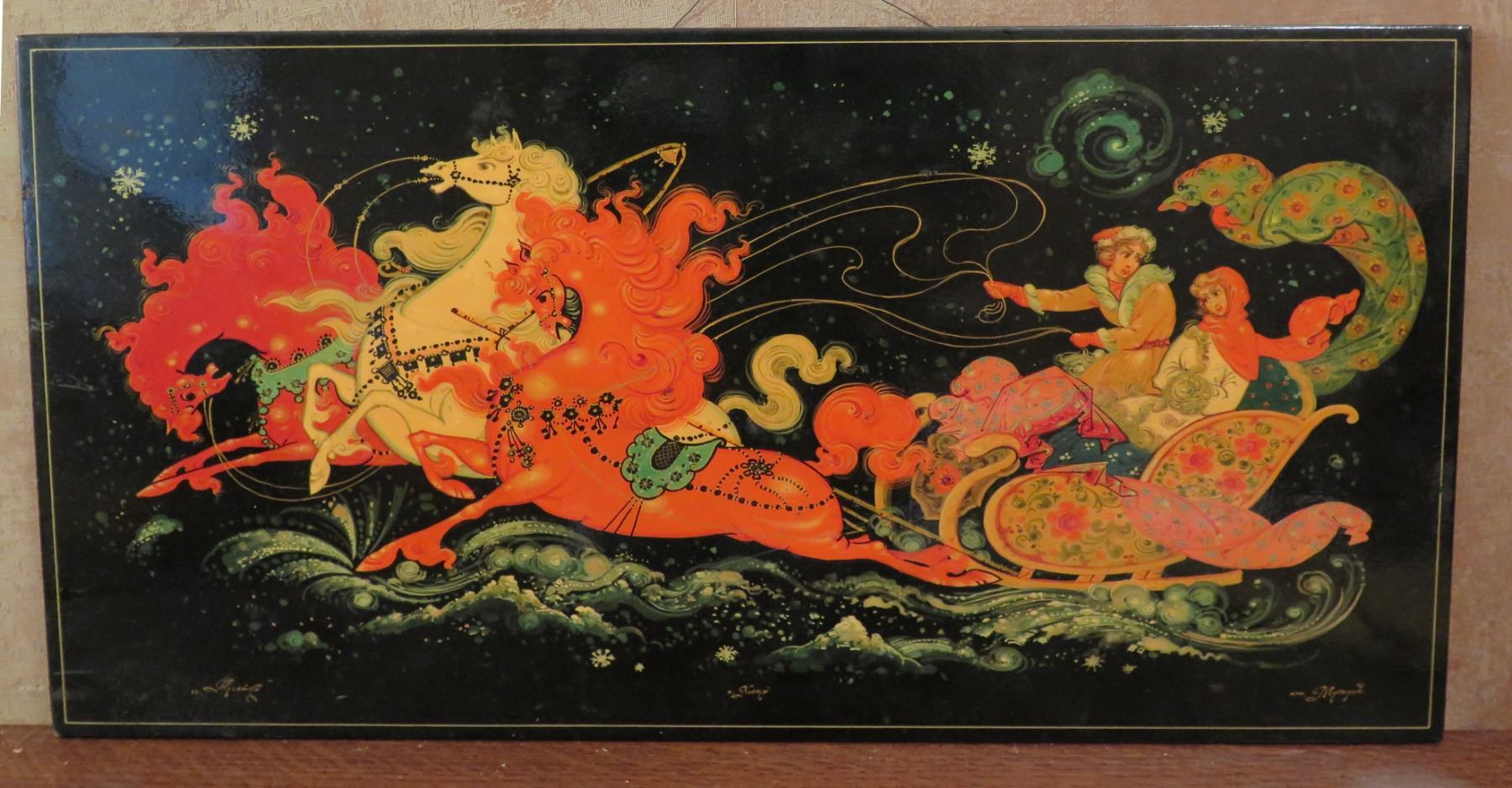 Framed Art, Russian Black Lacquer Print , Woman & Man In Sleigh Signed 19.75" x 10"
