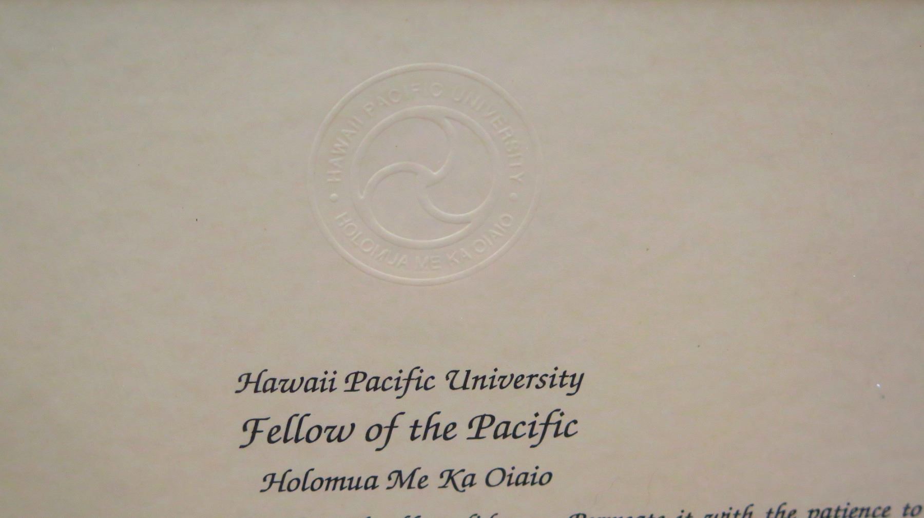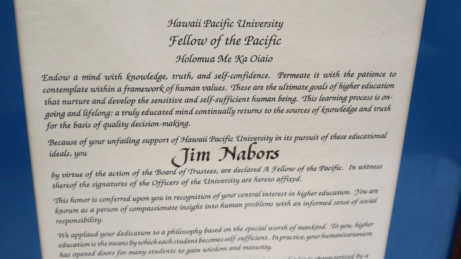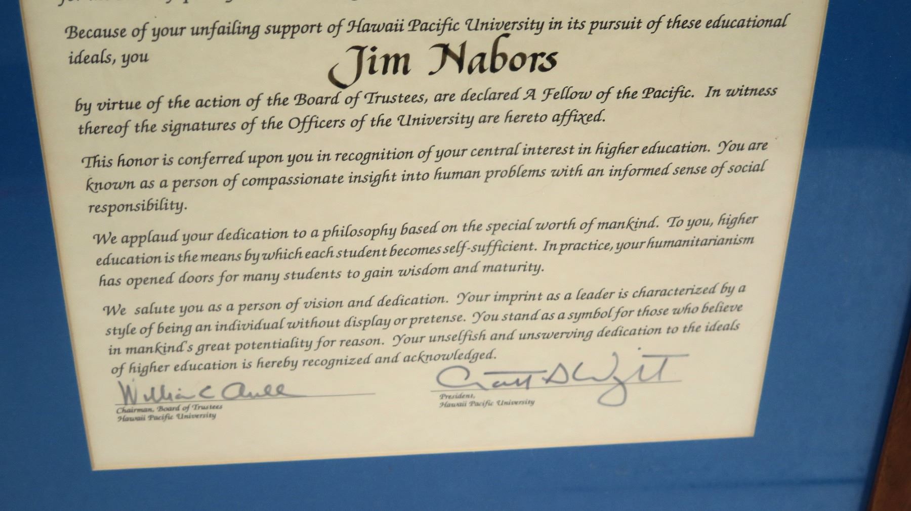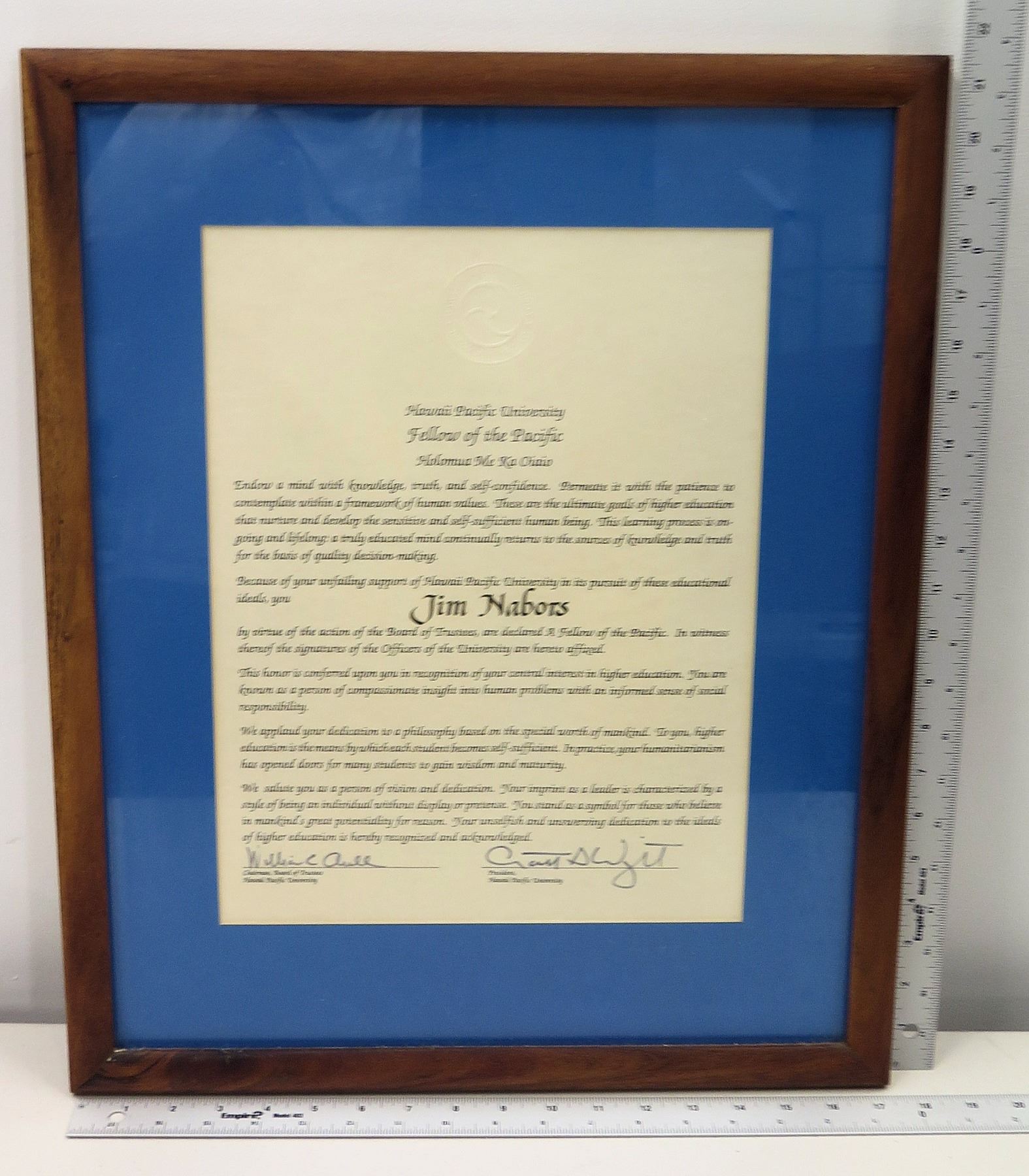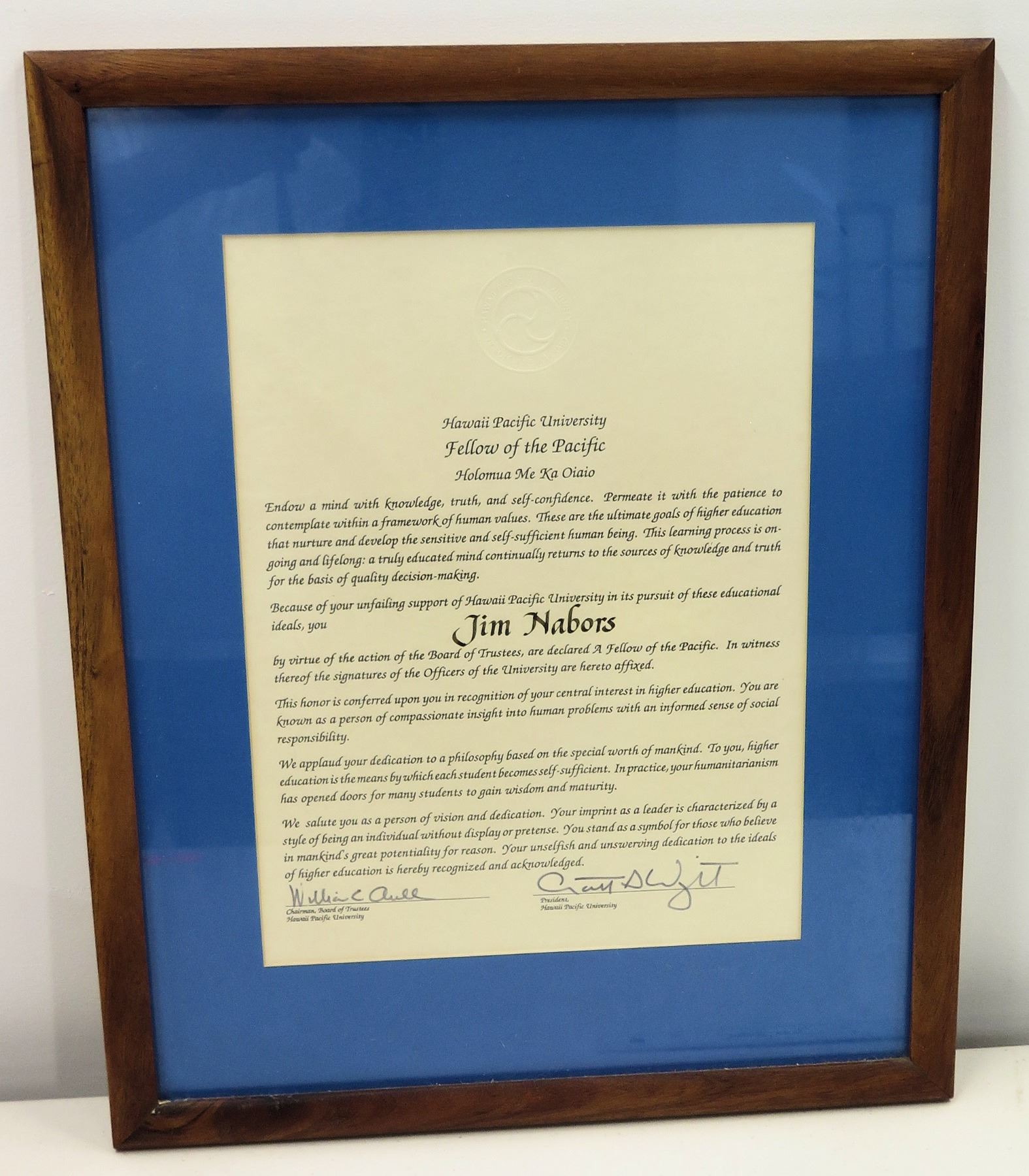 Framed Jim Nabors "Fellow of the Pacific" Designation Award from Hawaii Pacific University