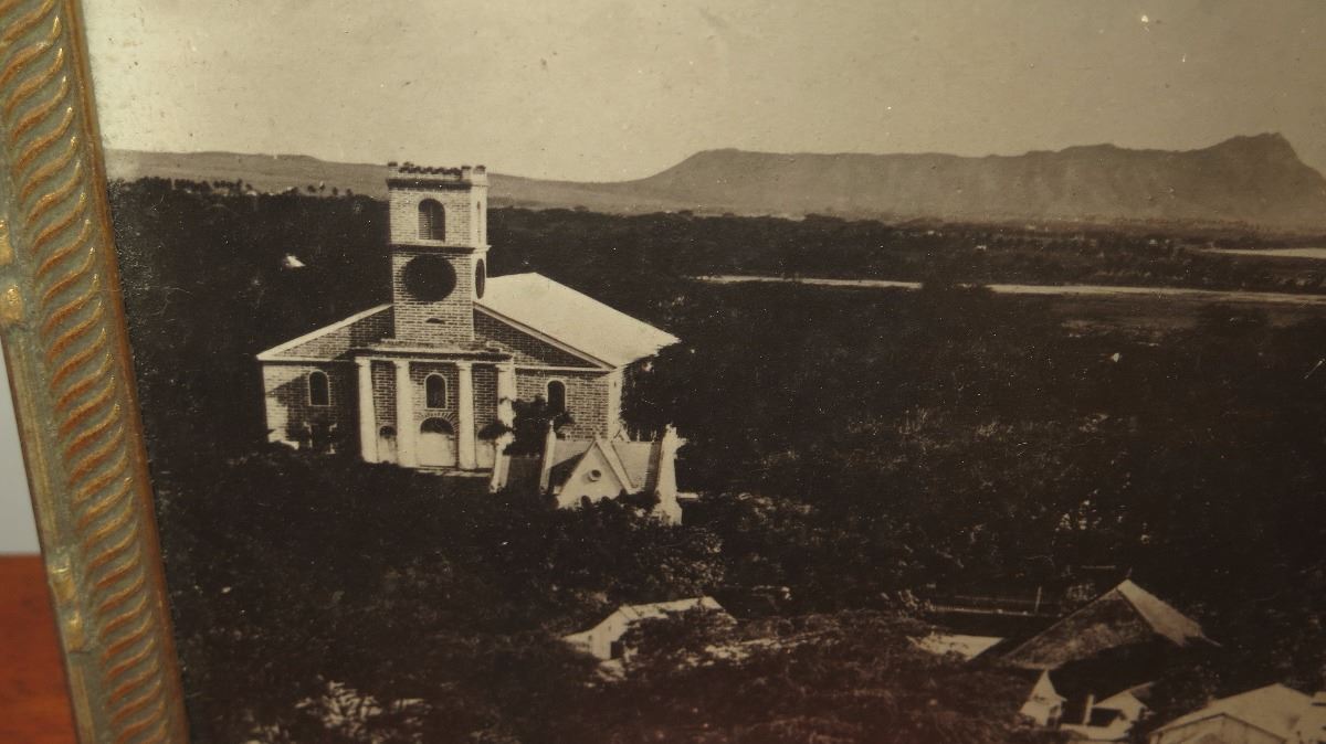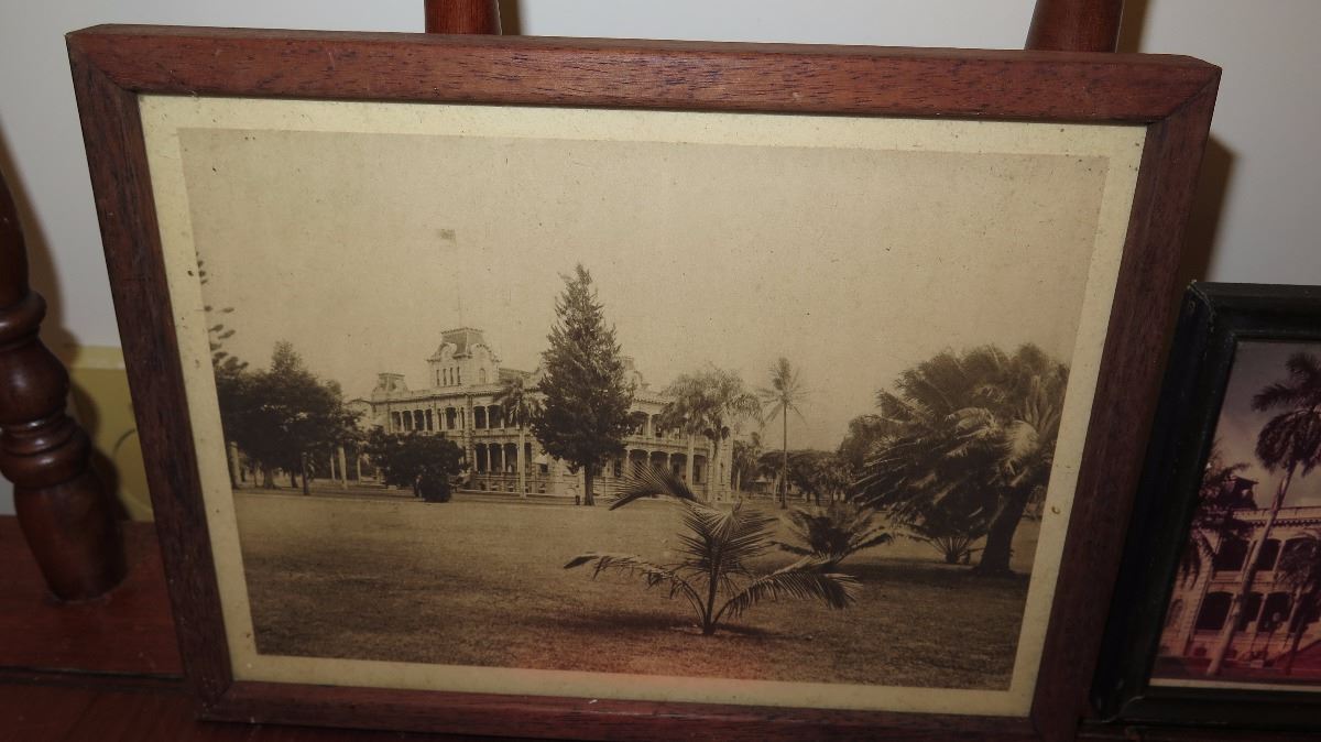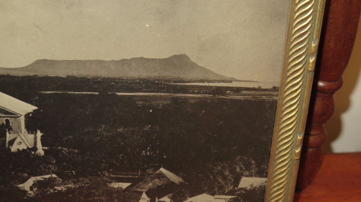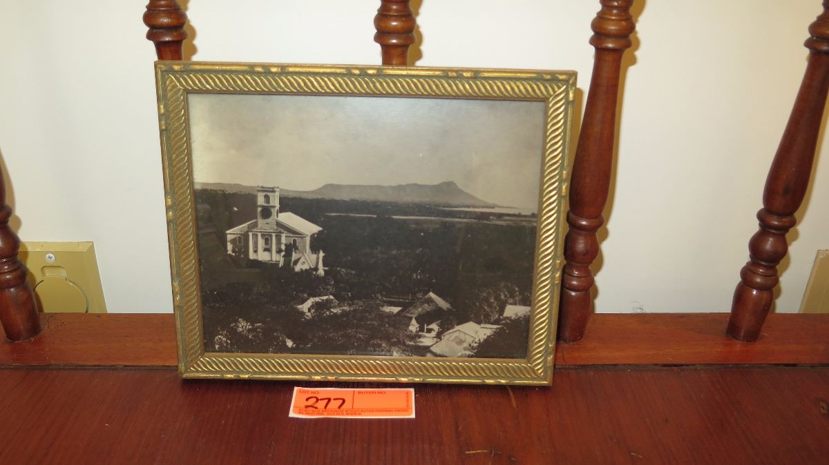 Framed Old B& W Photograph - Brick Building w/Diamond Head in Background 11x9