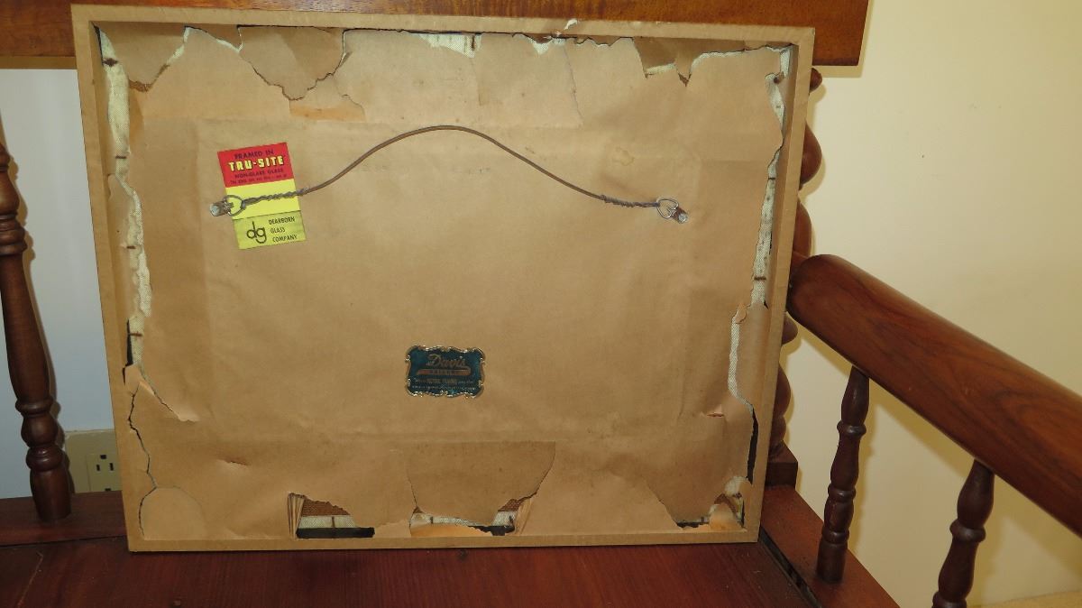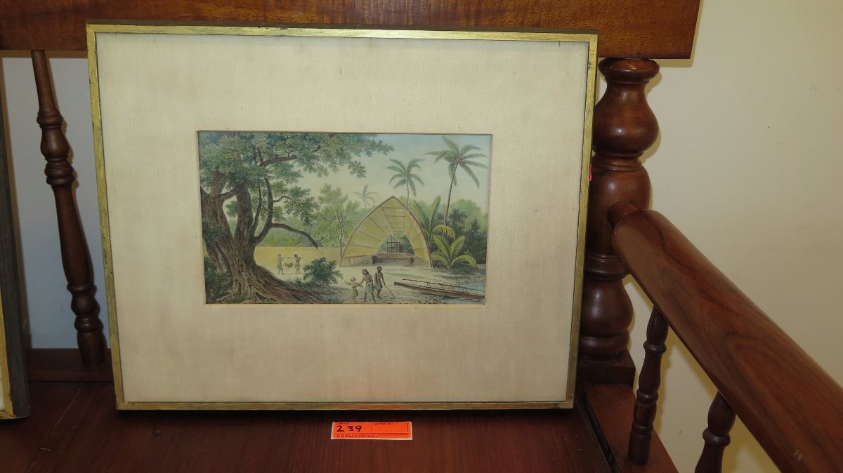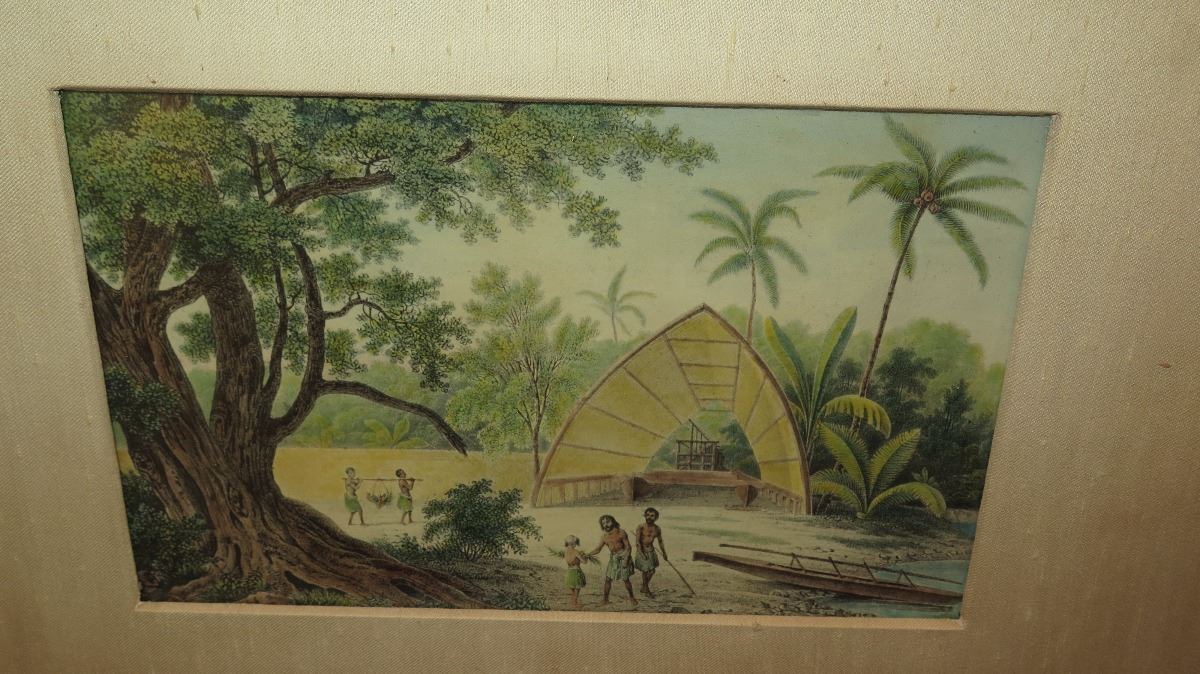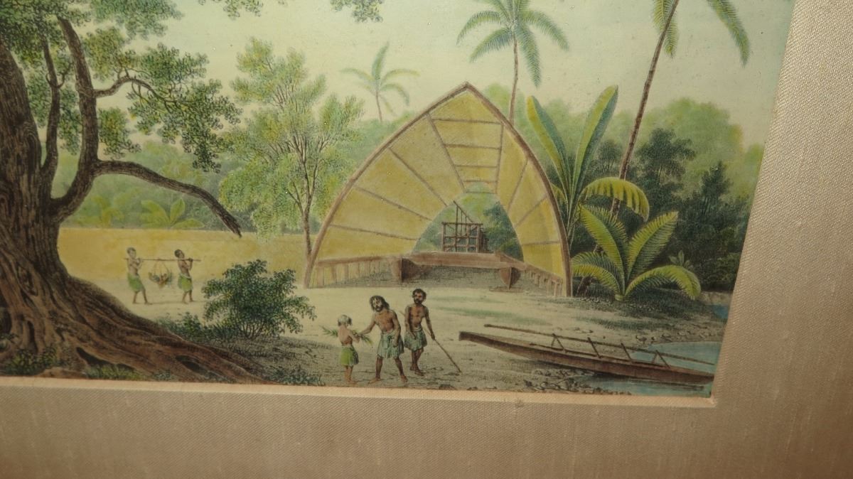 Framed Old Print - Depicting Hawaiian Village Scene & Canoe (framed 1958) 21X16