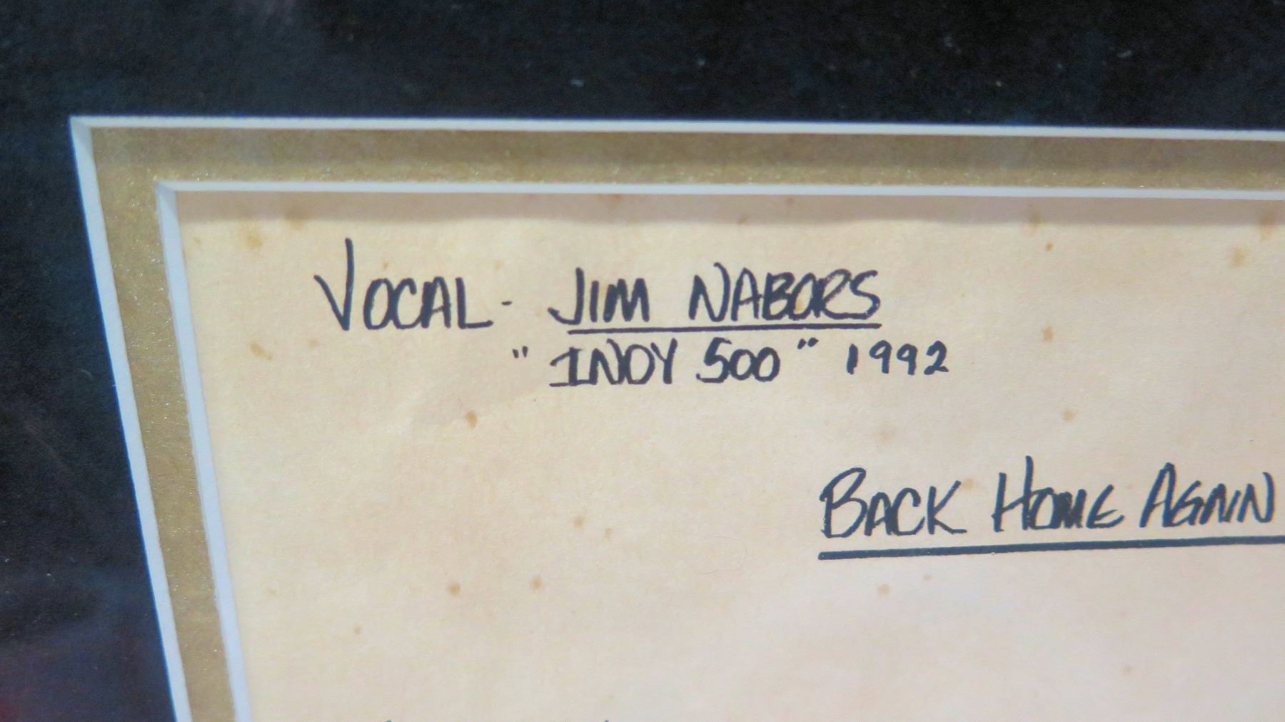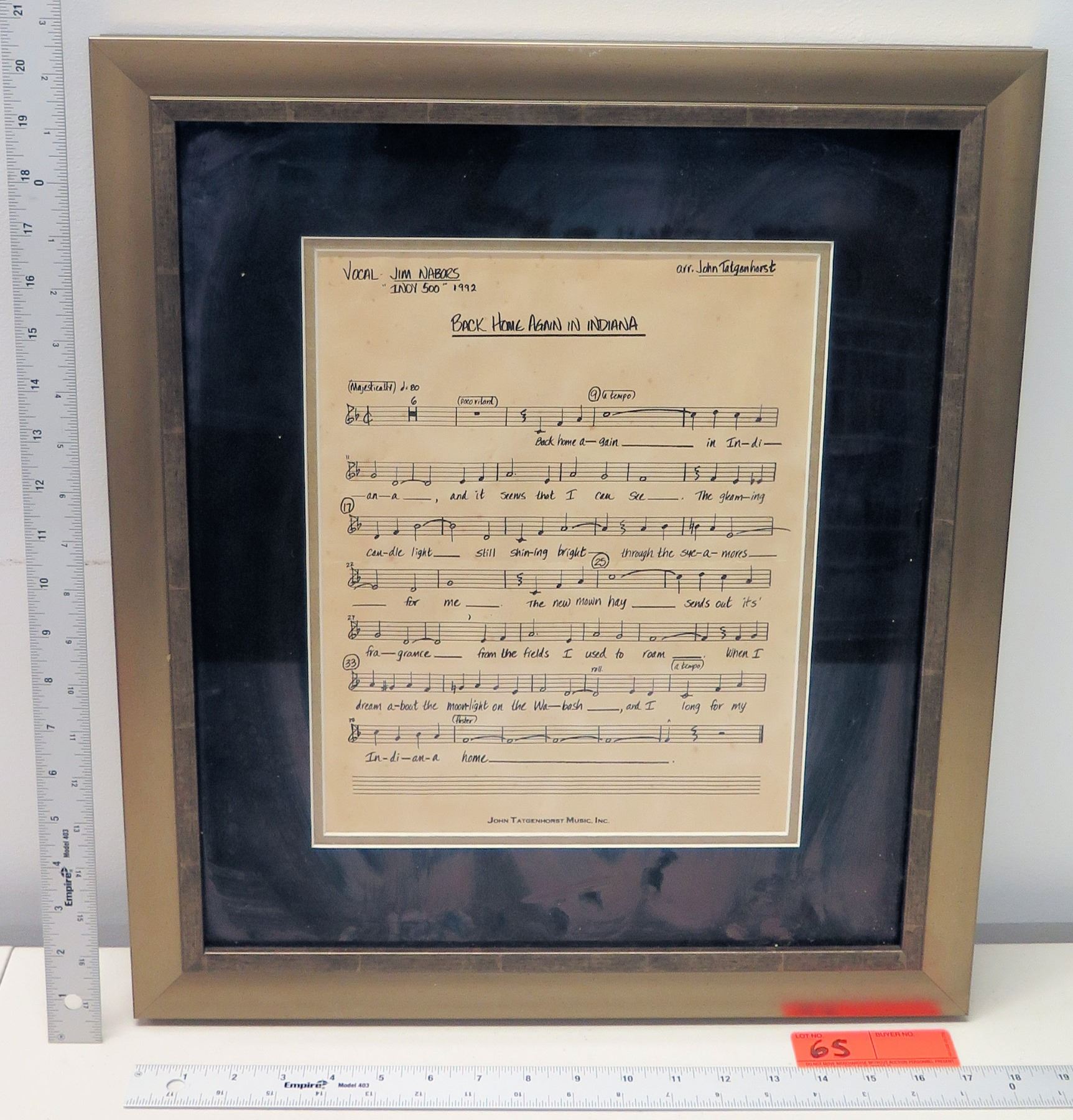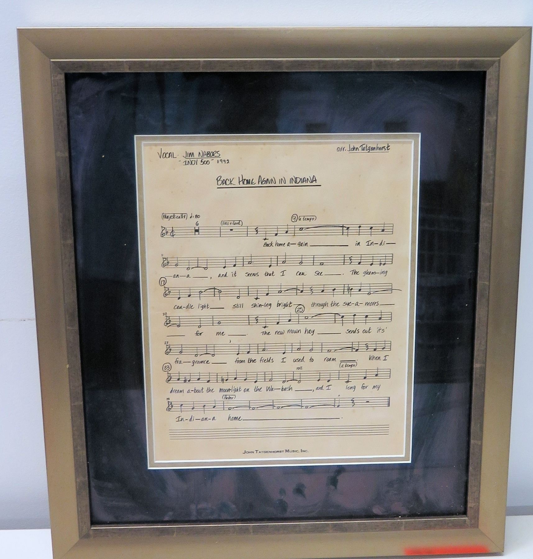 Framed Original 1992 Indy 500 Jim Nabors Vocal Sheet "Back Home in Indiana" by John Tatgenhorst
