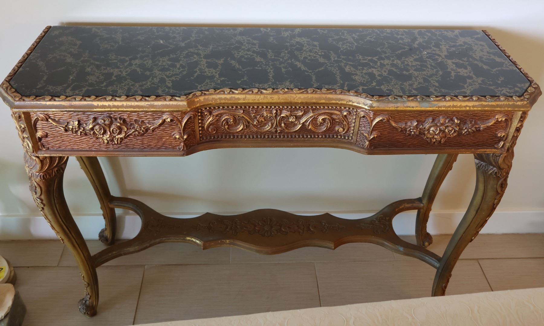 French Rococo-Style Carved & Gilded Wood Console Table w/ Stone Top & Cabriole Legs 14" x 13" x 34"H