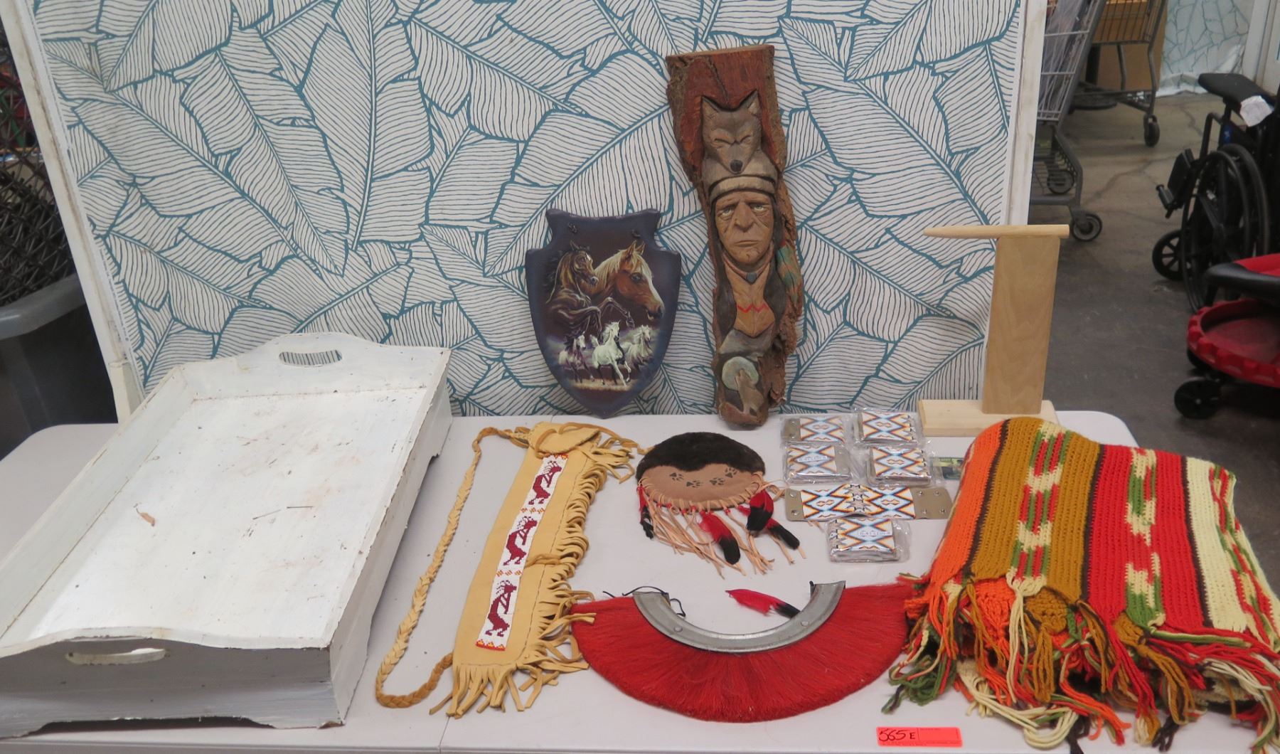 Fringed Tribal Throw & Belt, Wooden Tiki, Horse Plaque, Neck Piece, etc Some Signed