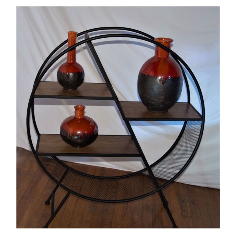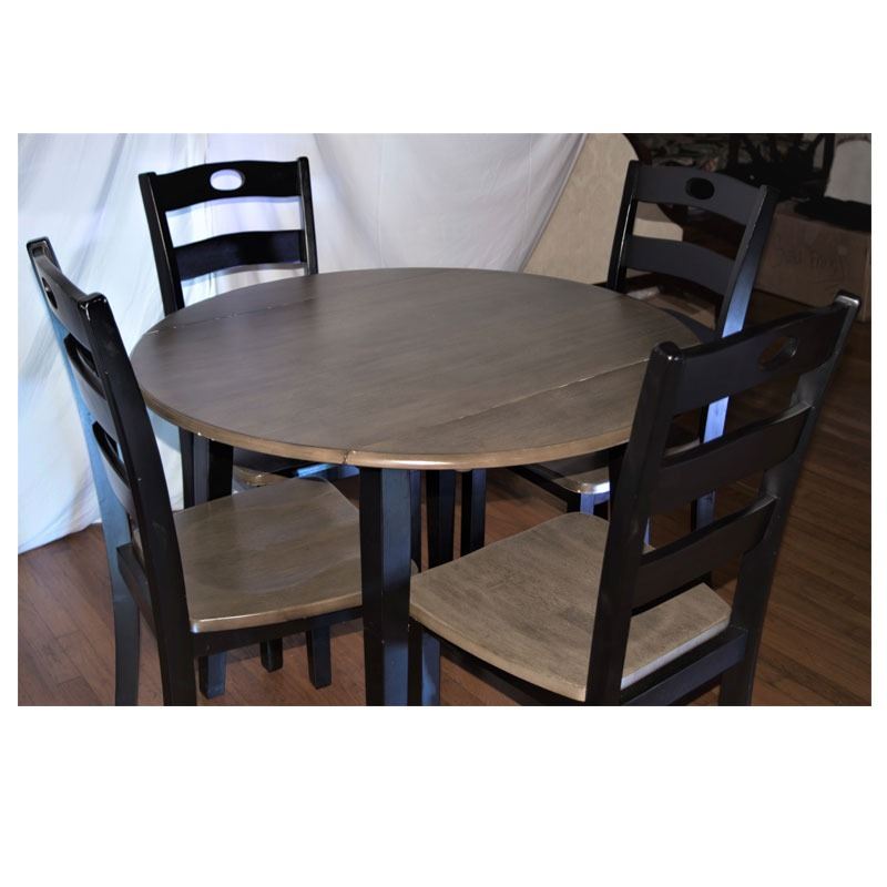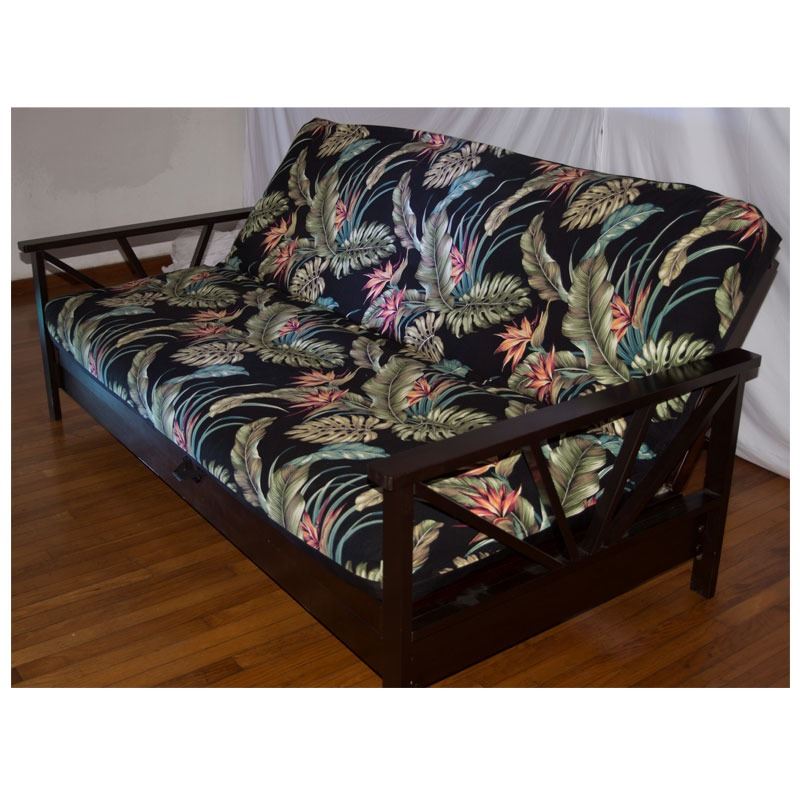 Futon with tropic print and ornate dark wood frame, Table with 4 Chairs, round metal & wood Shelf, 3 Cindy Crawford Home Collection Vases (Gently Used).